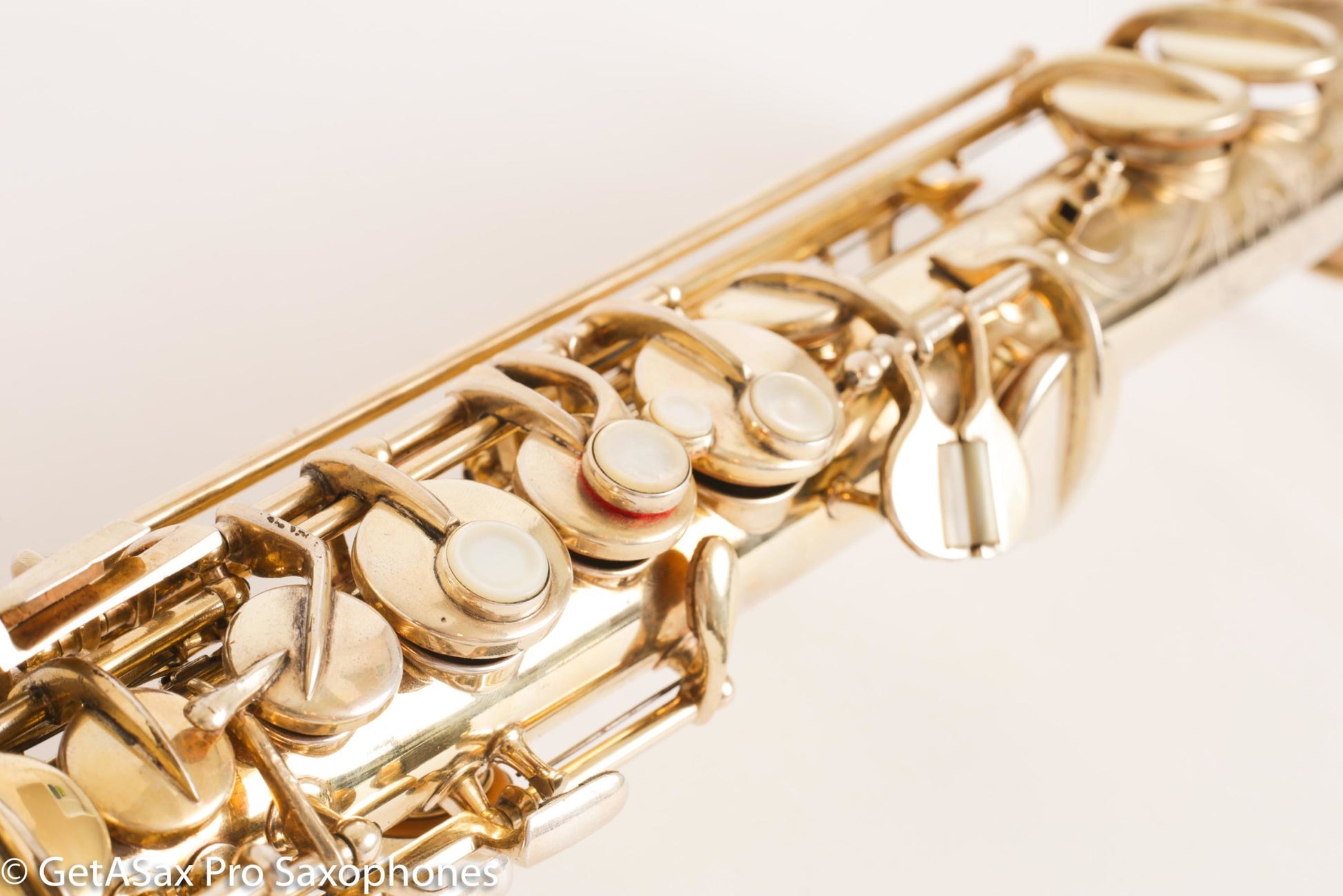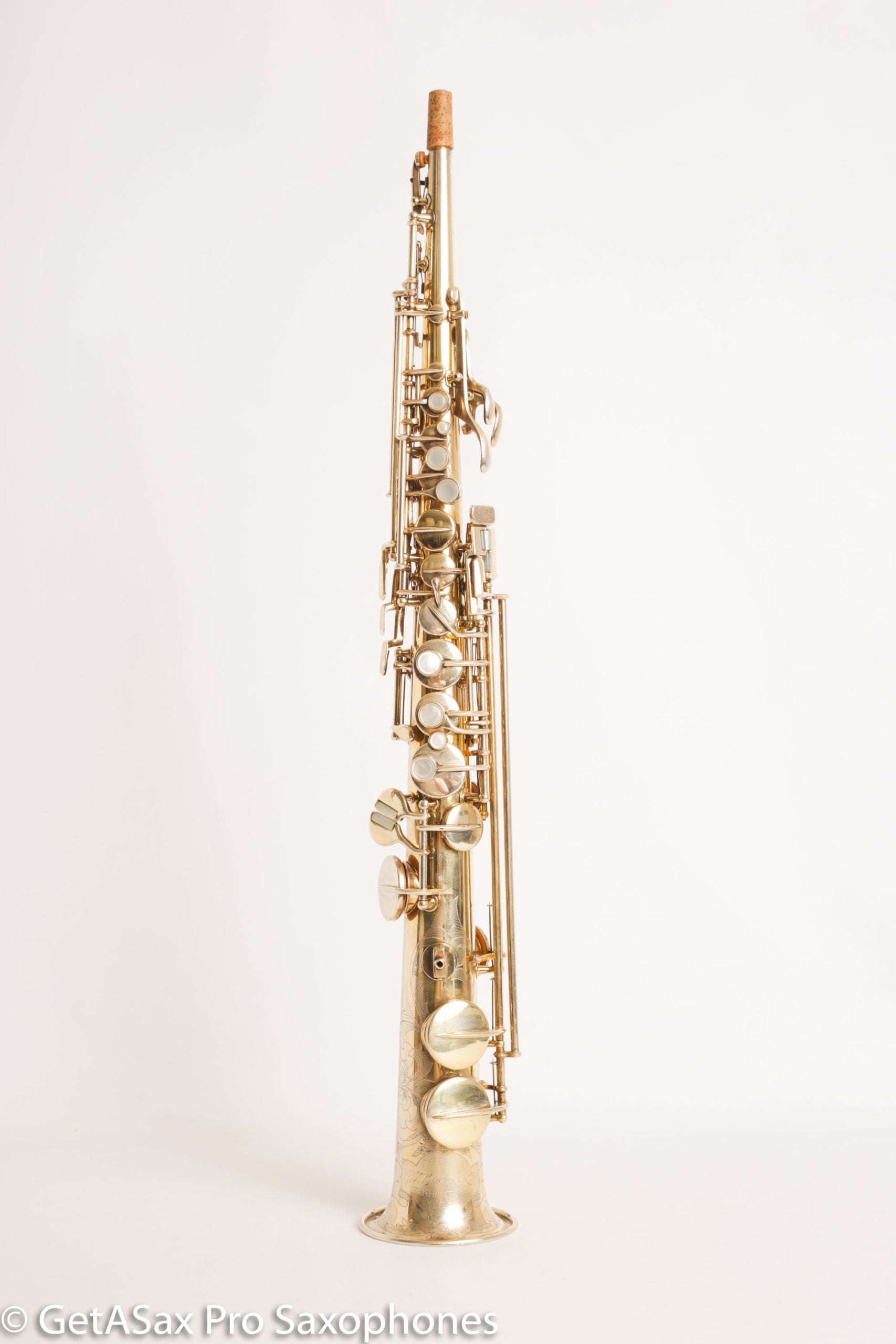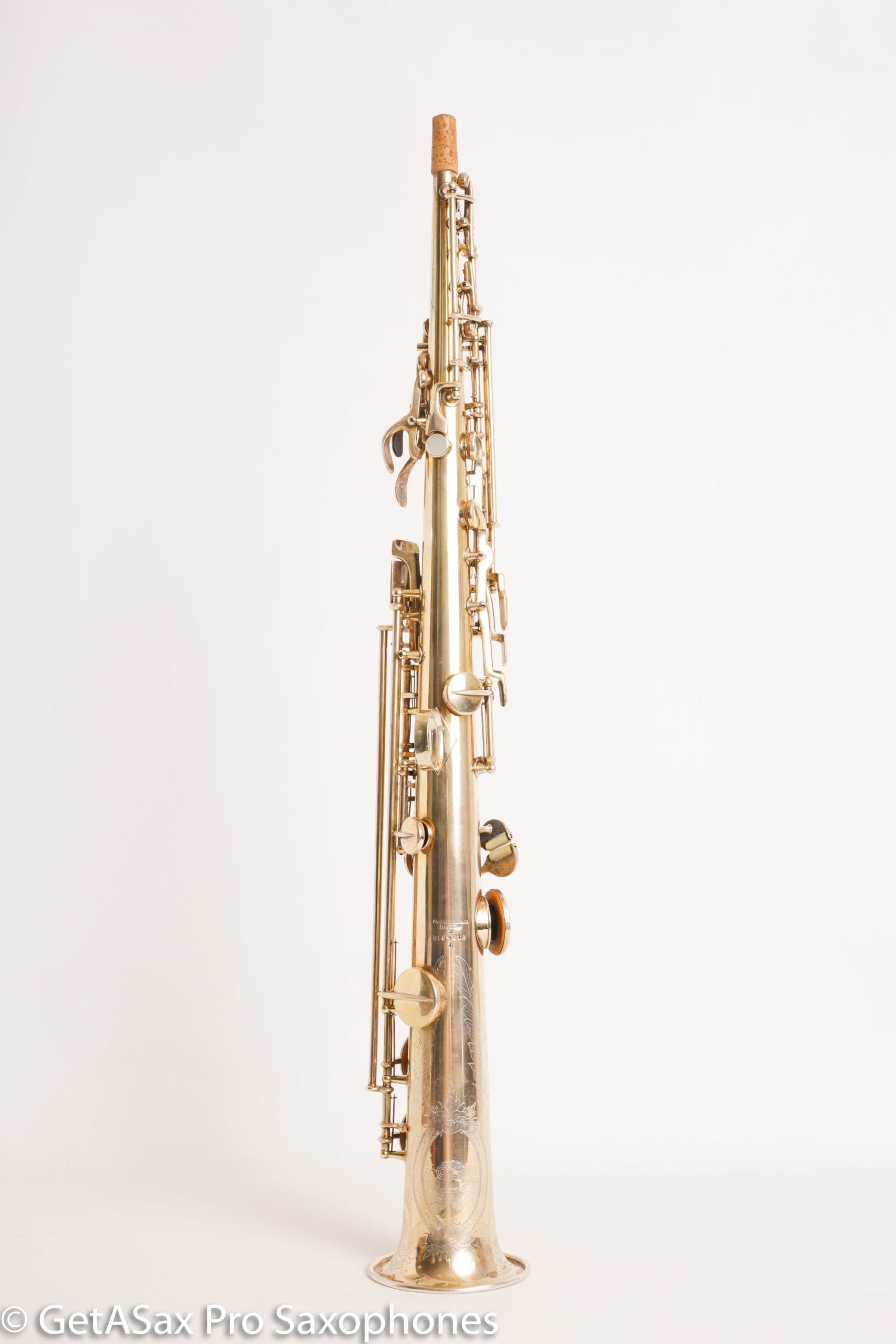 You never see burnished Conn sopranos with special portrait engraving. This one has a train scene, which I find extremely delightful. This beautiful gold-plated soprano saxophone was also recently overhauled and plays well on the fresh pads. There’s no significant past damage. Original gold plate.