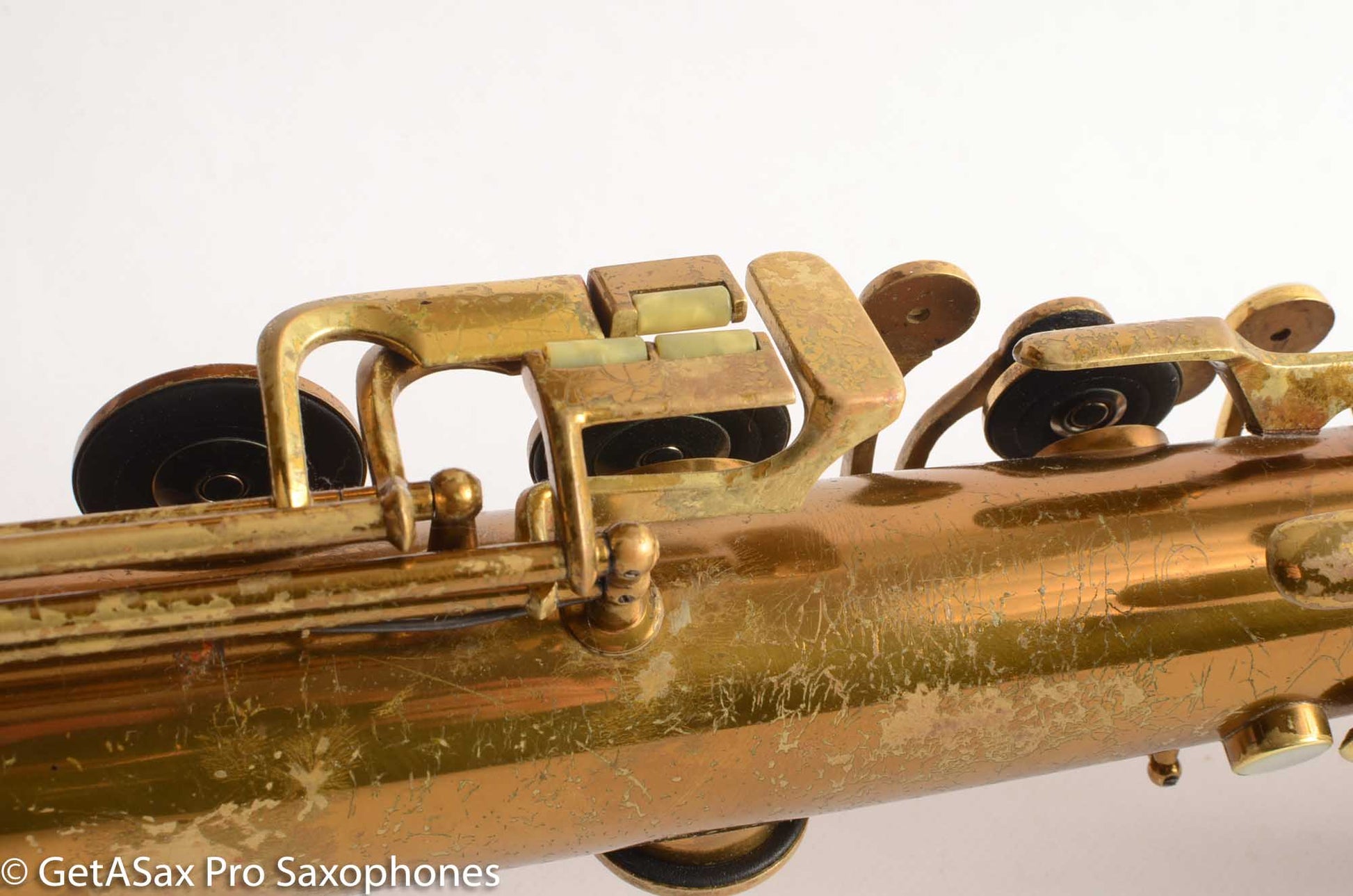 Physically, the horn has seen a good bit of use and has the scratches and dings to prove it, but it has no major damage, the neck is in good shape, the keywork is tight, and its ready to play reliably for years out of the box. The lacquer looks to be original, though I find it harder to tell with Pan-Americans since they sprayed it over the engraving a lot of the time. At least it certainly doesn’t look to have been buffed to my eyes. The toneholes are straight, not rolled, but other than that this is basically a Conn 12M and it plays just like one- that is to say with an enormous, rich tone that makes playing a joy and listening a treat.