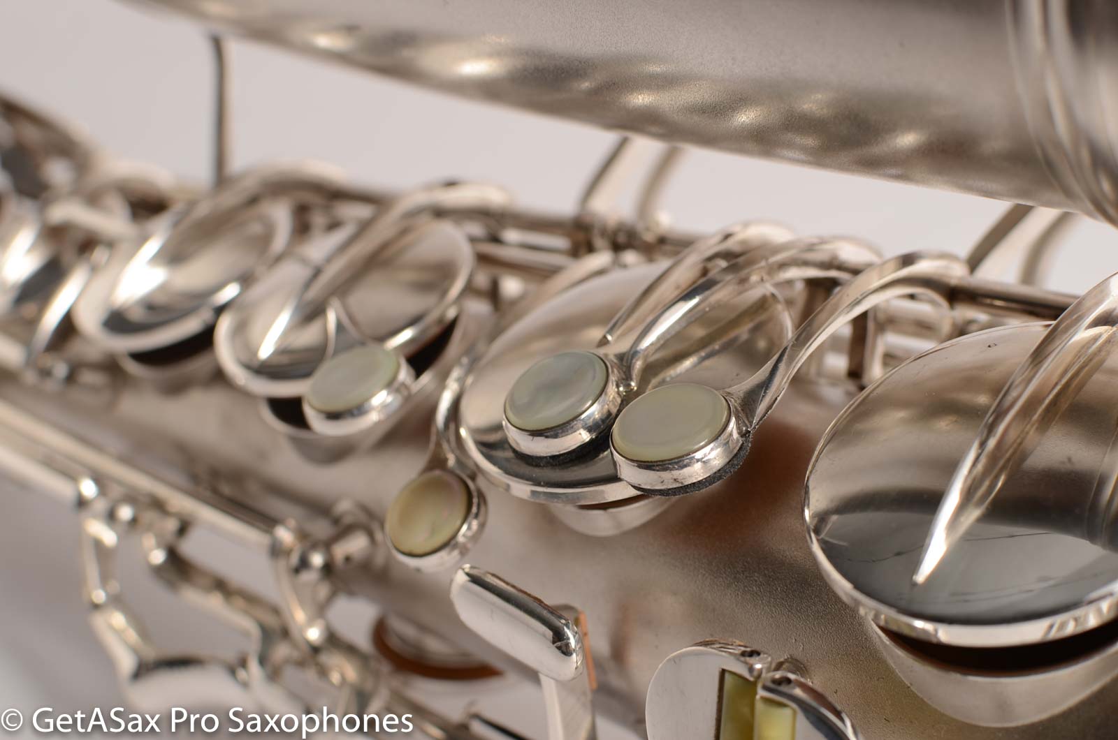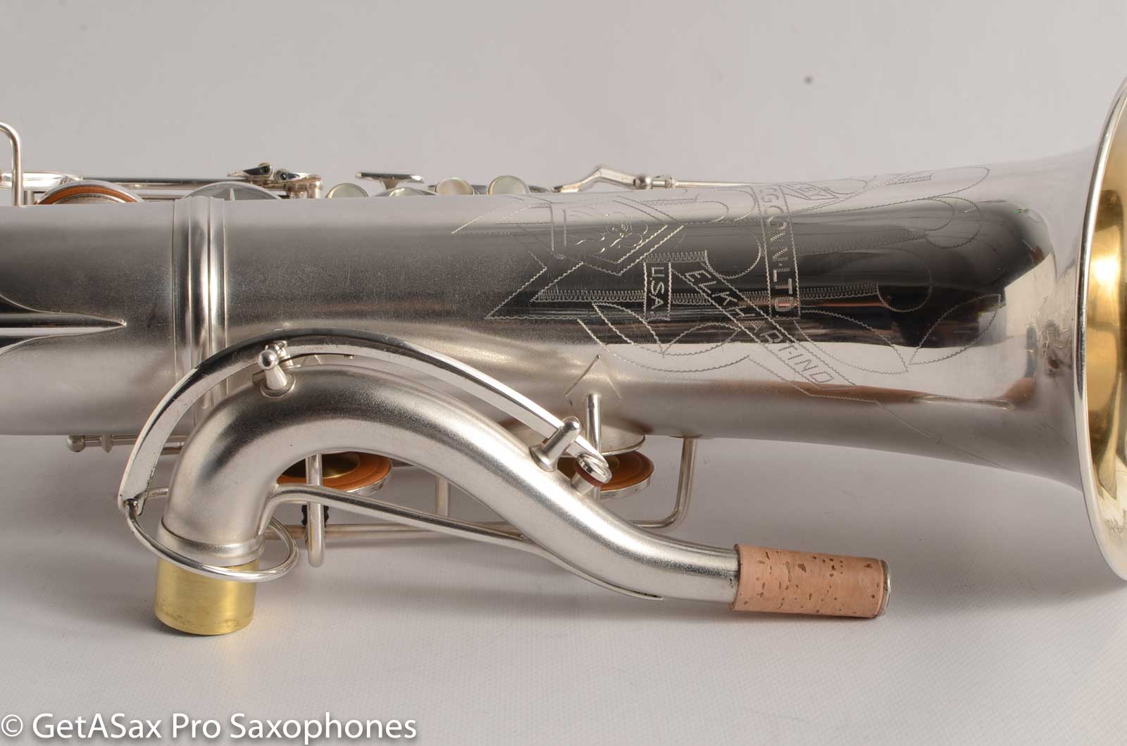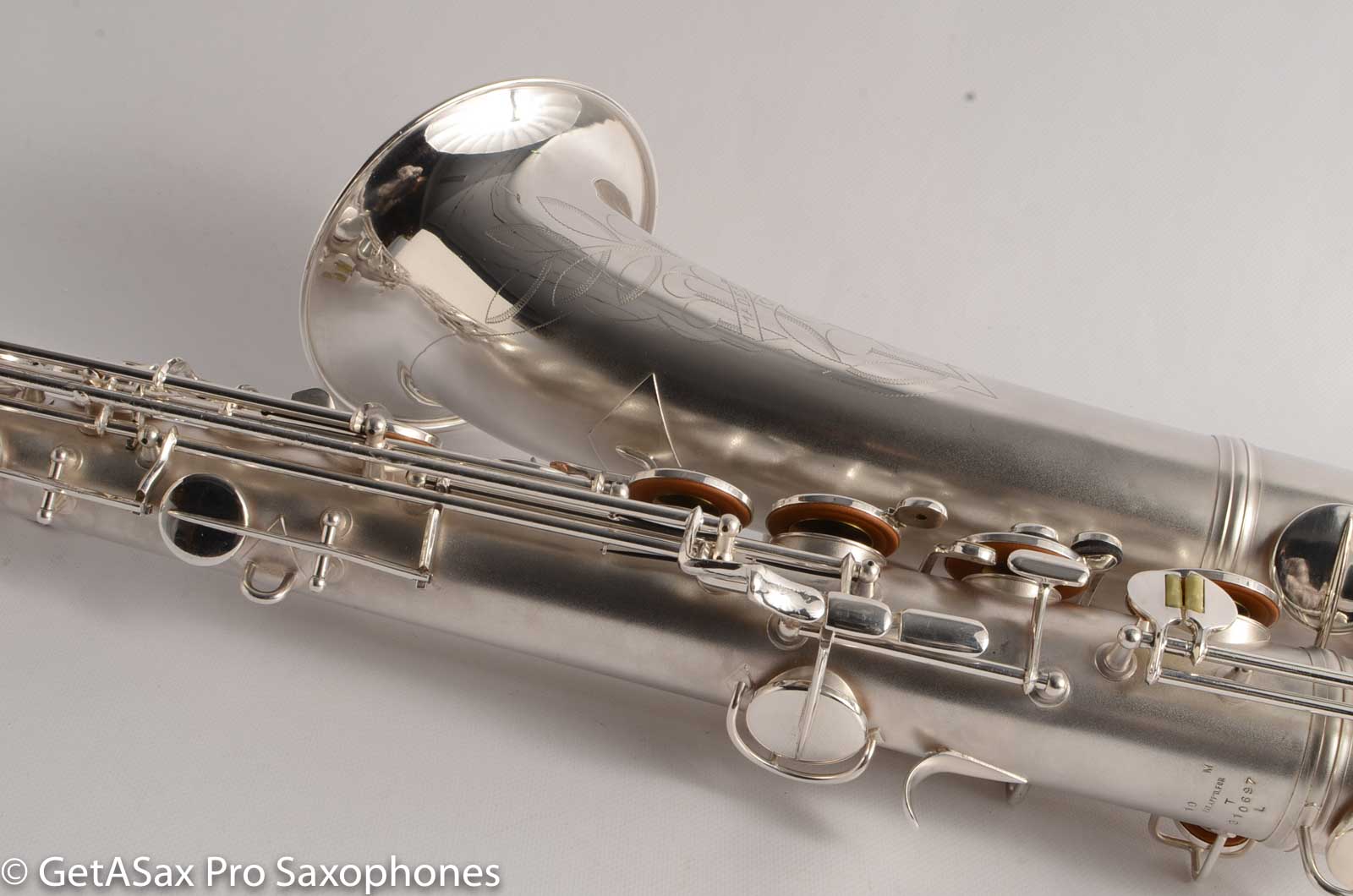 This Conn silver 10M tenor is as close to new condition as I have seen for a 75 year old saxophone. It is original silver plate, and it is even more beautiful in person. It's like going back to the early 1940's and picking it up from the store. Except that this also has a fresh, top-quality overhaul, and feels like a million bucks too. The pads are firm and snappy and feel like dry paper under the fingers. You can feel a mediocre overhaul on a Conn by its squish. Only the pros can make it feel dry on the rolled tone holes. The resonators are the high-end TenorMadness slightly domed reusable brass type - my favorite for a Conn.