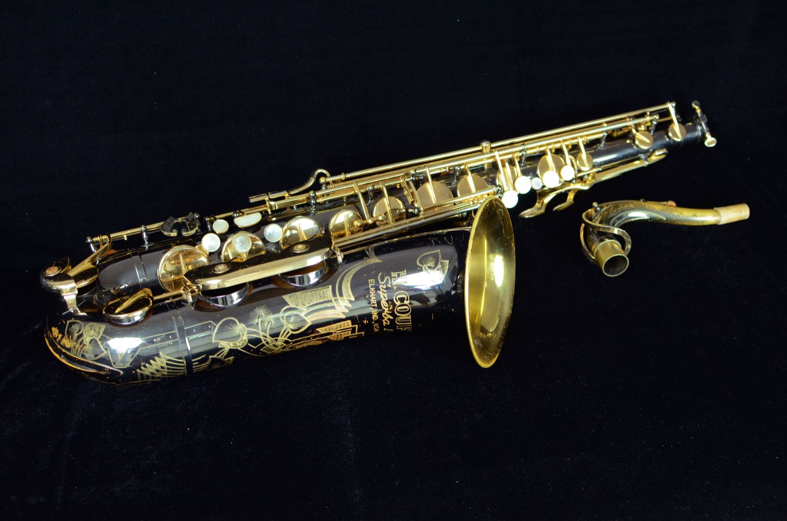 This is a rare Keilwerth-made Couf Superba I tenor saxophone. It has rolled tone holes, and the finish is black nickel. This is the first Couf that I have seen with this finish, which is much more common to find on the Keilwerth SX-90R which is the present rolled tone holes Keilwerth model.