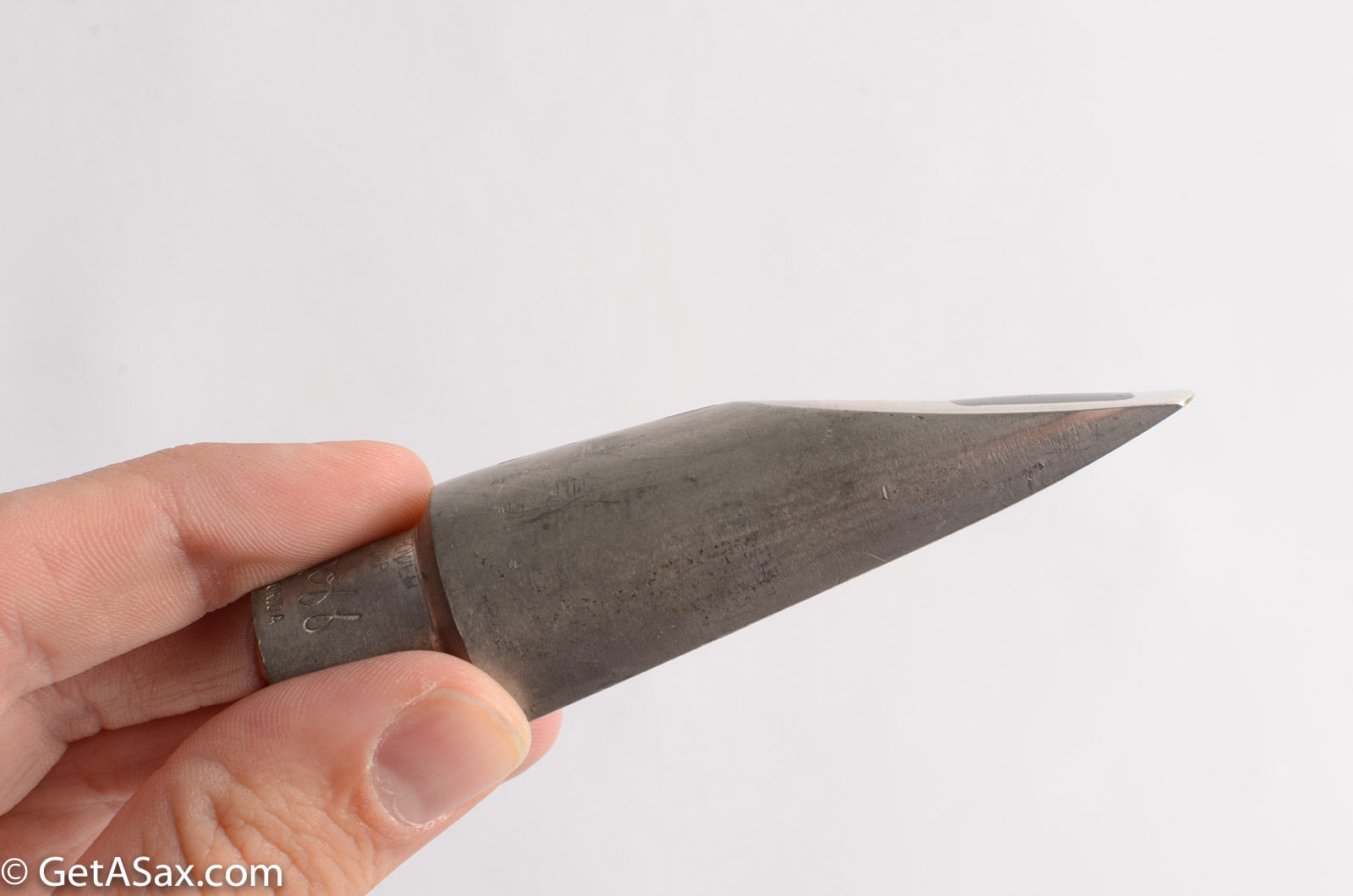 This is a Dukoff Miami M8 alto saxophone mouthpiece. It has a rollover baffle, straight side walls, and a large round chamber. Its tip opening measures at 0.086. There is some discoloration from age, but nothing that will affect playability.