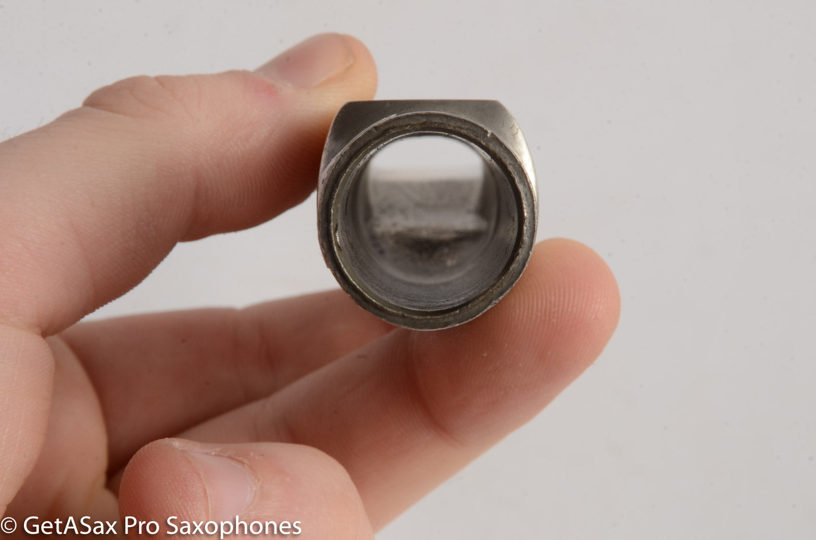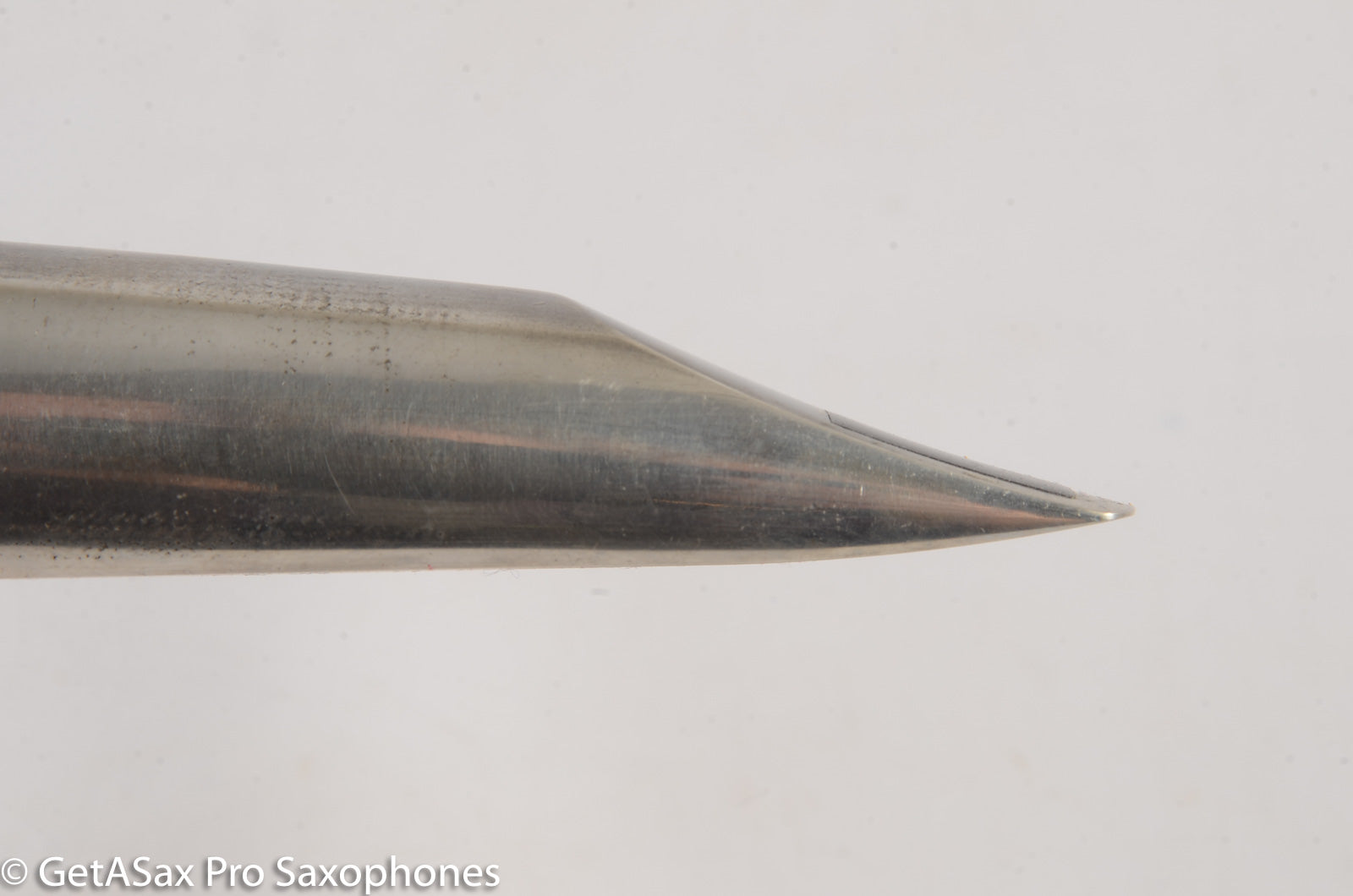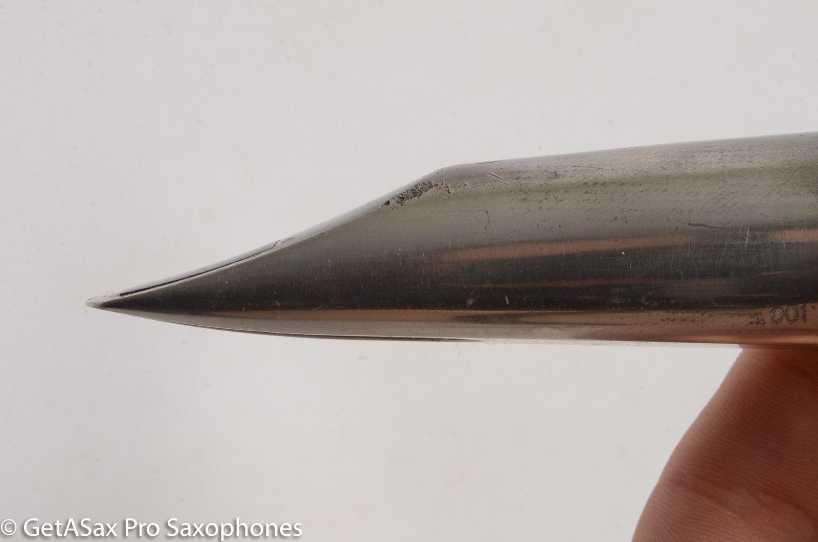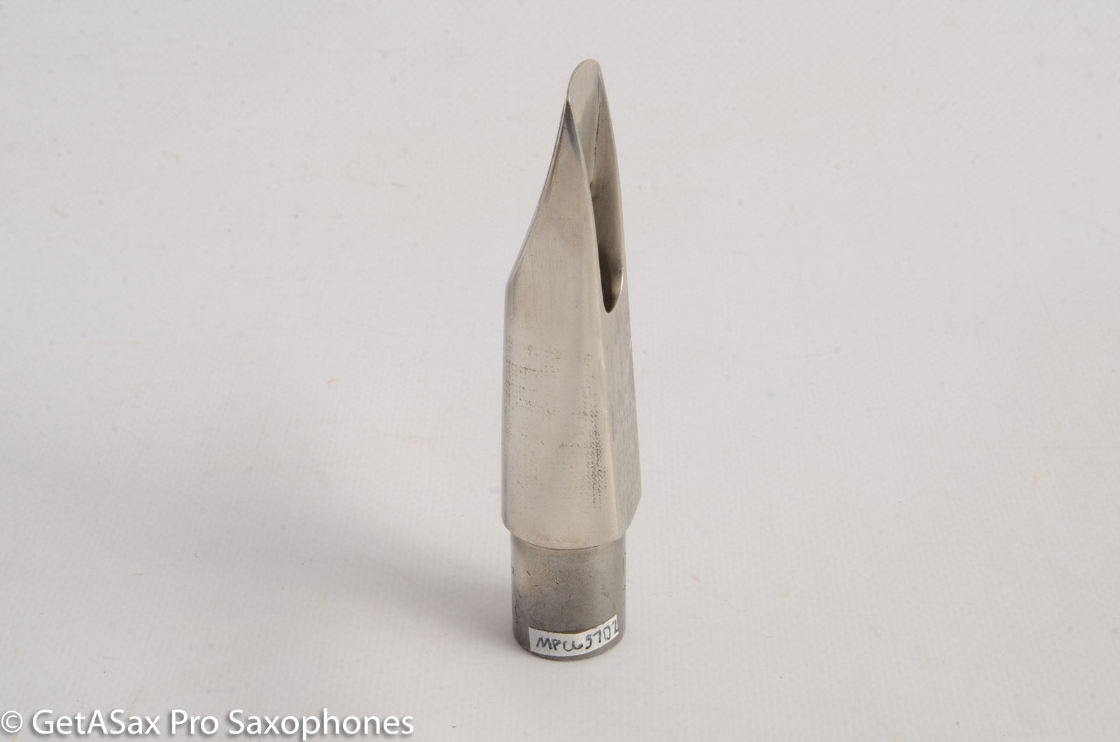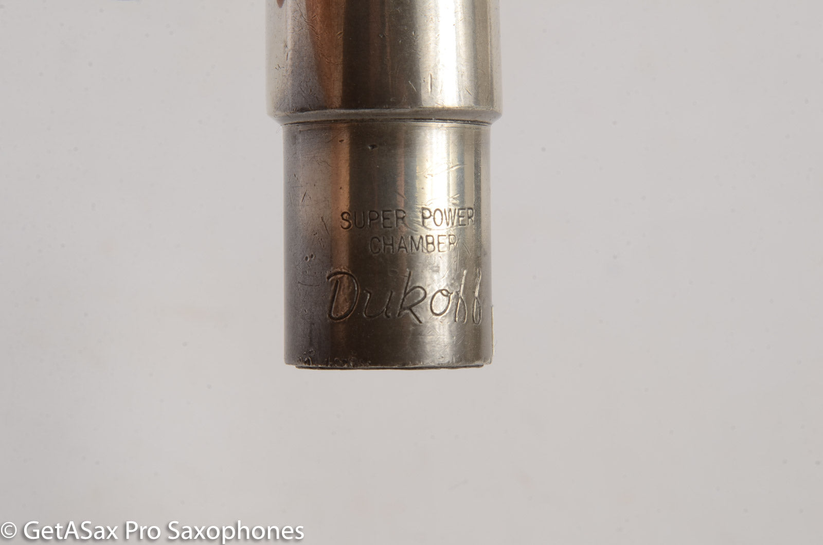 Straight sidewalls, small chamber, high baffle. Tip opening measures 0.100". Refacing by Brian Powell makes this a Dukoff SPC with beautiful narrow side rails like a Guardala. As expected from a Super Power Chamber there is Super Power to behold. Great projection, free blowing, and very bright modern tone. The buffed Silverite material is pretty, like Pewter.