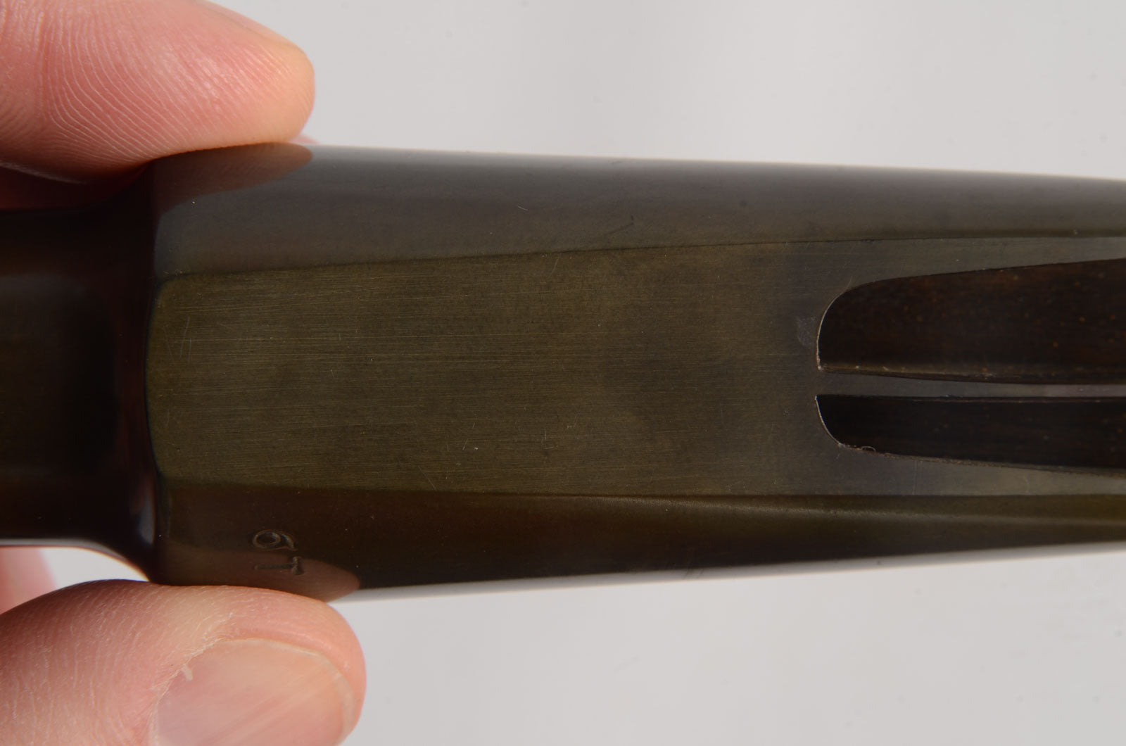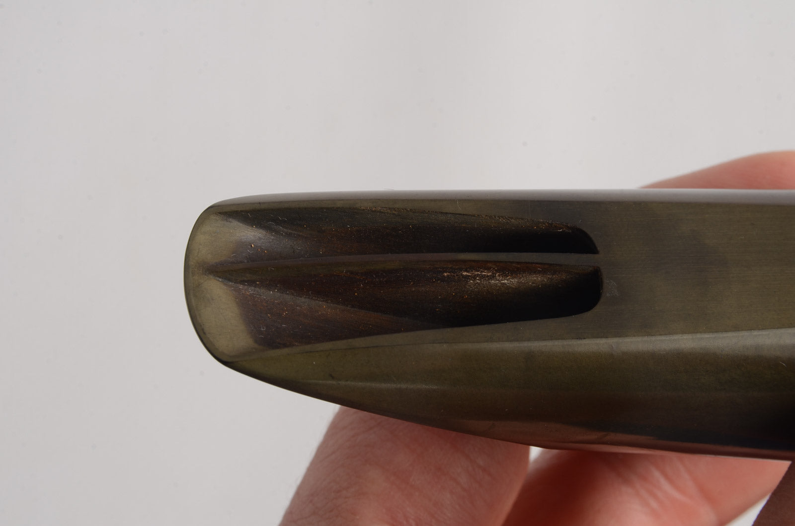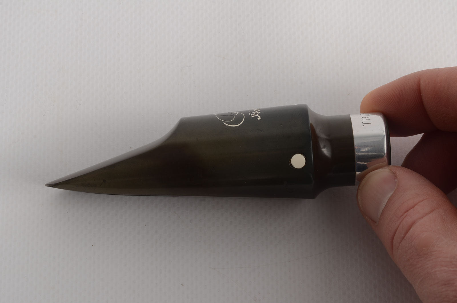 SUPER rare completely untouched original condition Gale Hollywood triple rail tenor mouthpiece in a 6 tip. You hardly ever see these in this sort of condition. This is a must-have for the serious mouthpiece collector. This one has the silver shank band and the three dots on the body, so it's the one you want. Why MC Gregory ever made this piece, I do not know.