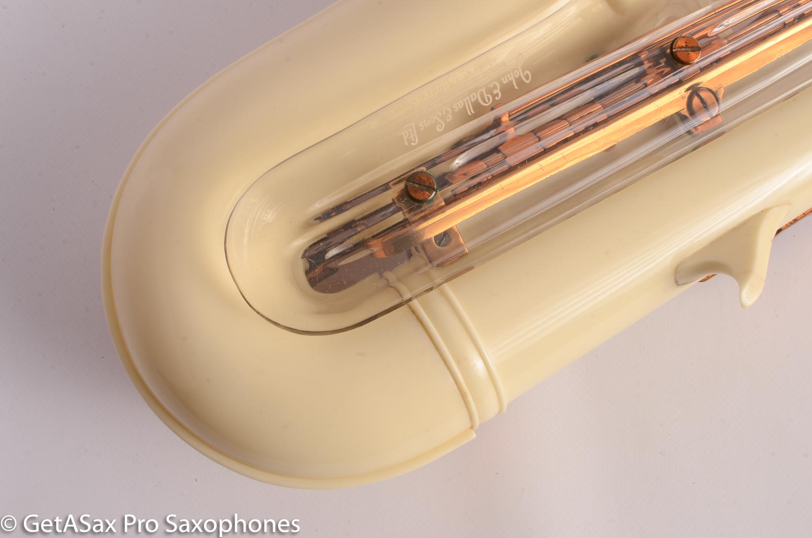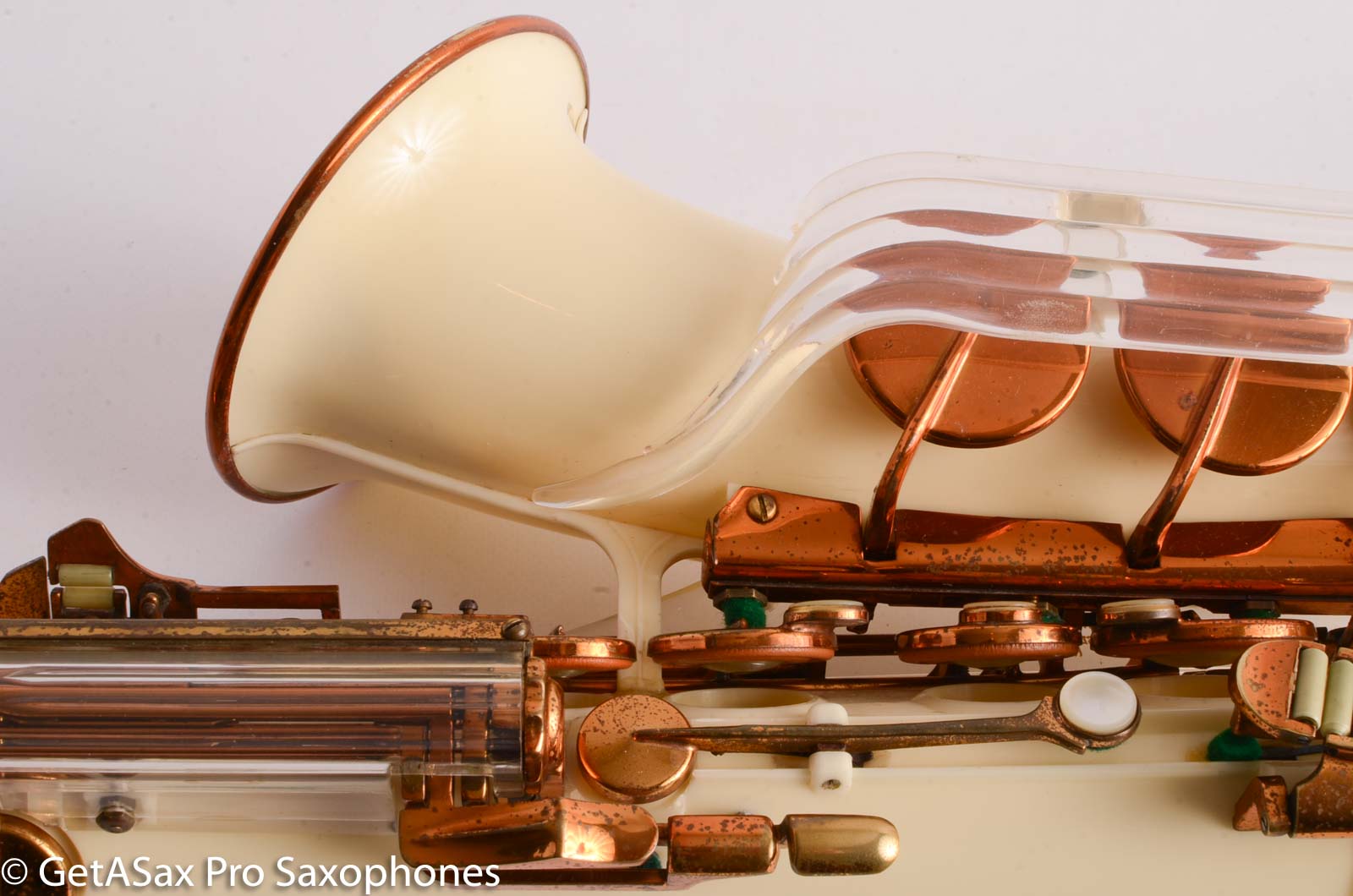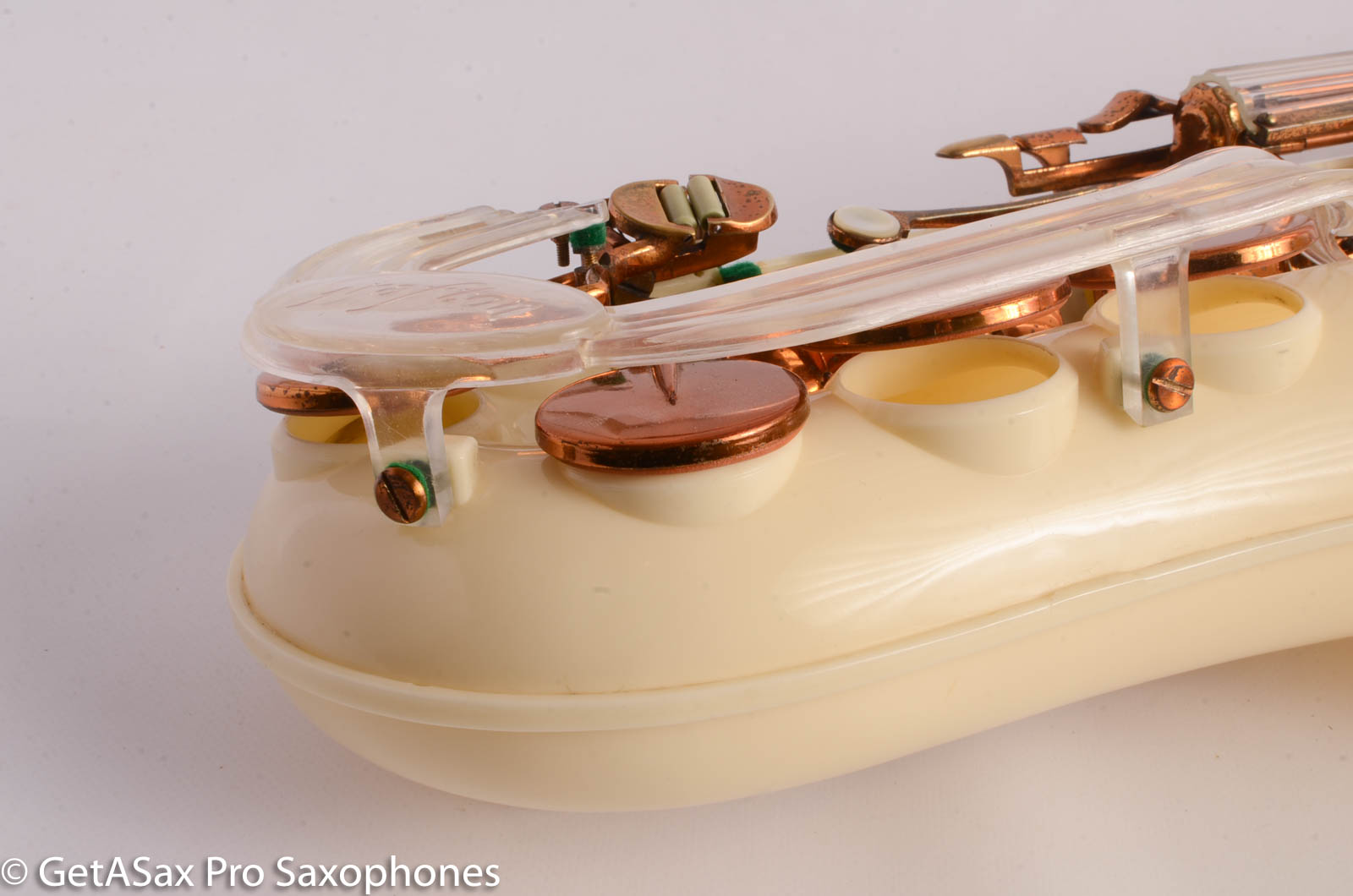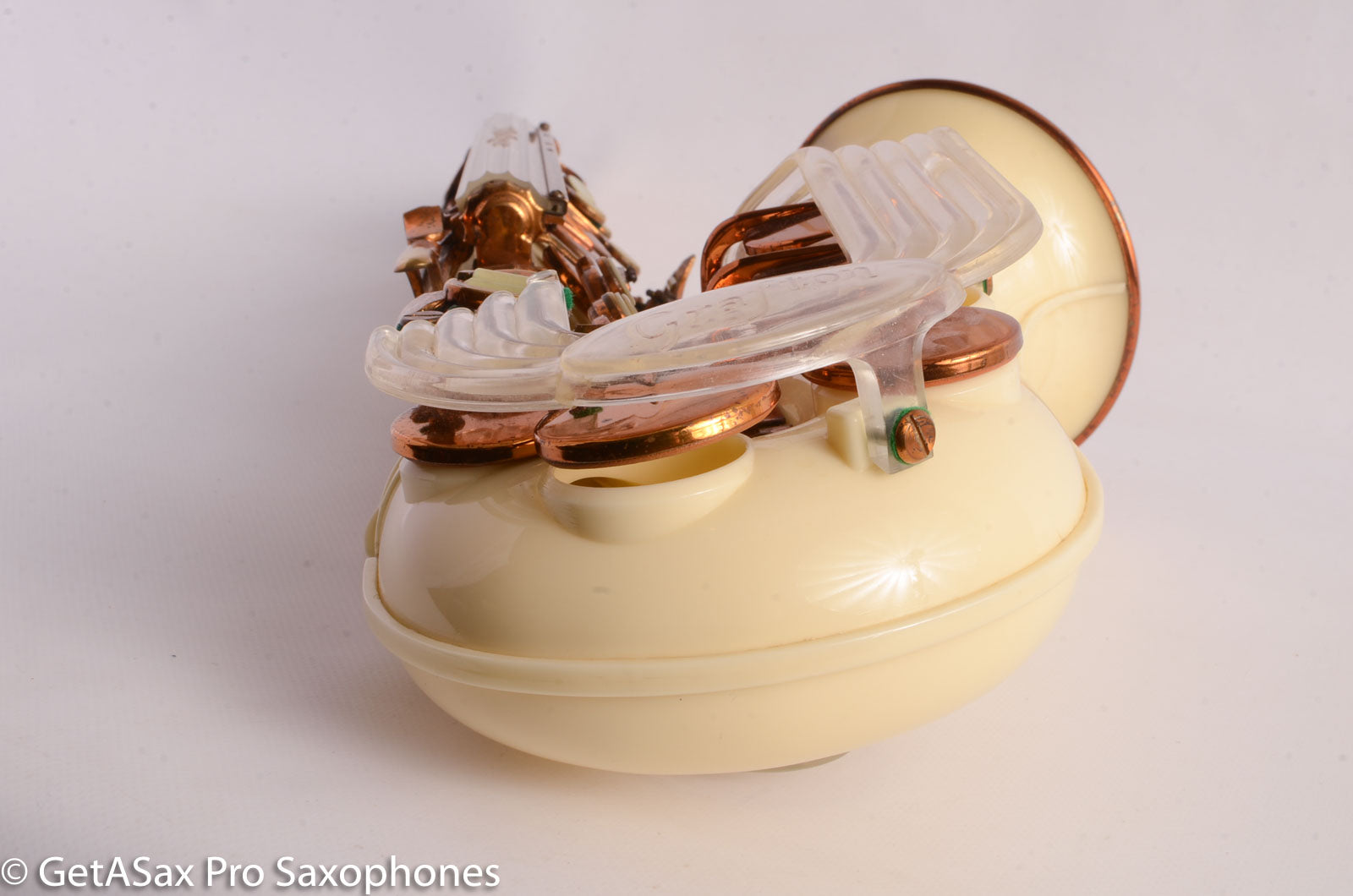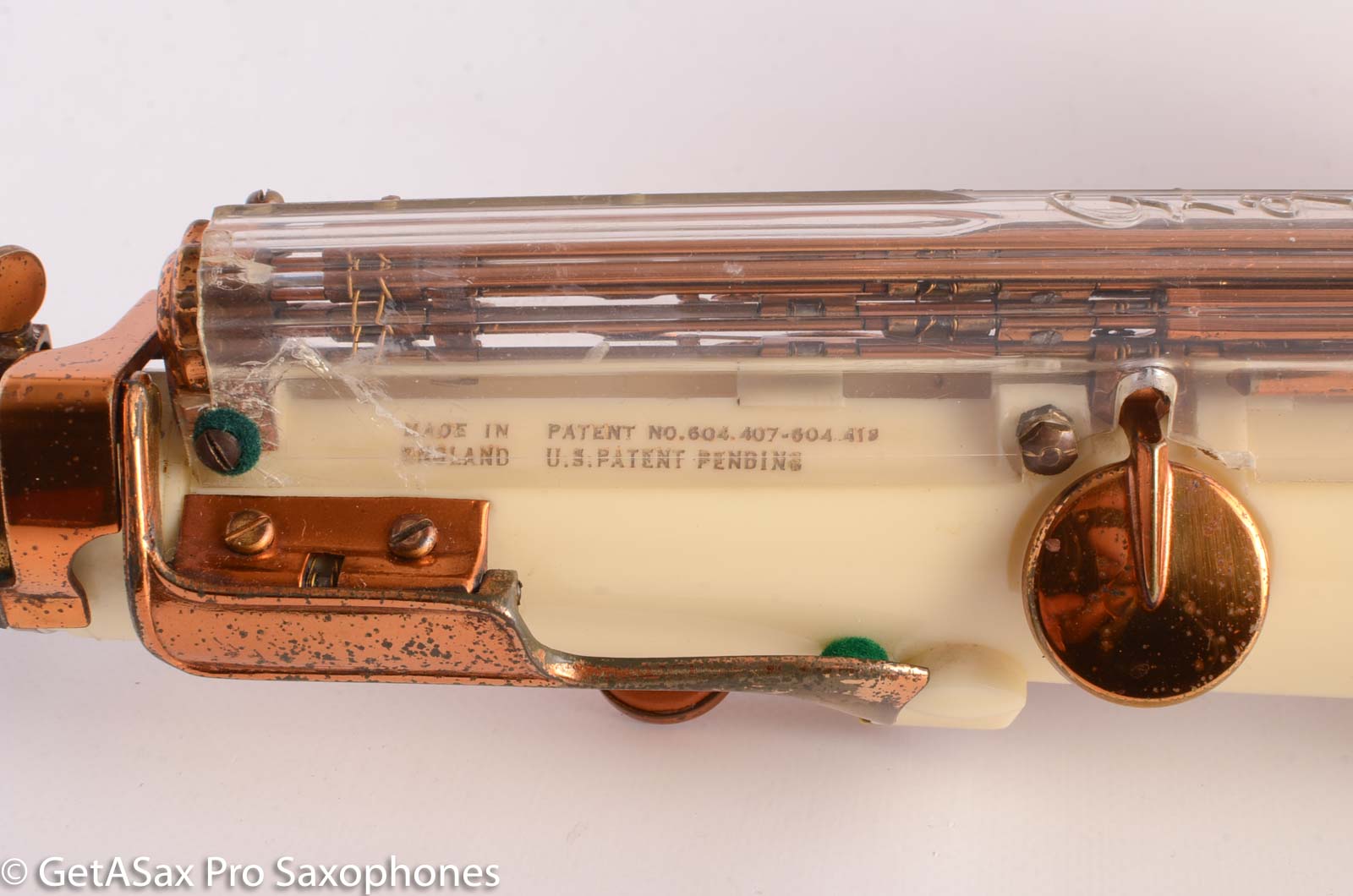 This particular example has actually been repadded by some enterprising repairer (I say it this way because they are notoriously challenging to work on) and it has been done rather well. It plays, as you may or may not expect, very much like a saxophone and there is not much in the playing of it to convey that the instrument you are playing is wholly unique, with new methods of manufacture and the completely singular keywork mechanisms that its injection molded acrylic body required. It is comfortable under the fingers, responsive, weighs about what a normal sax weighs, and plays with a warm, if somewhat uncomplex, tone. It is in fact quite an amazing instrument when taken as a whole, and the experience of playing it leaves me with wonder and respect for the company that made it.