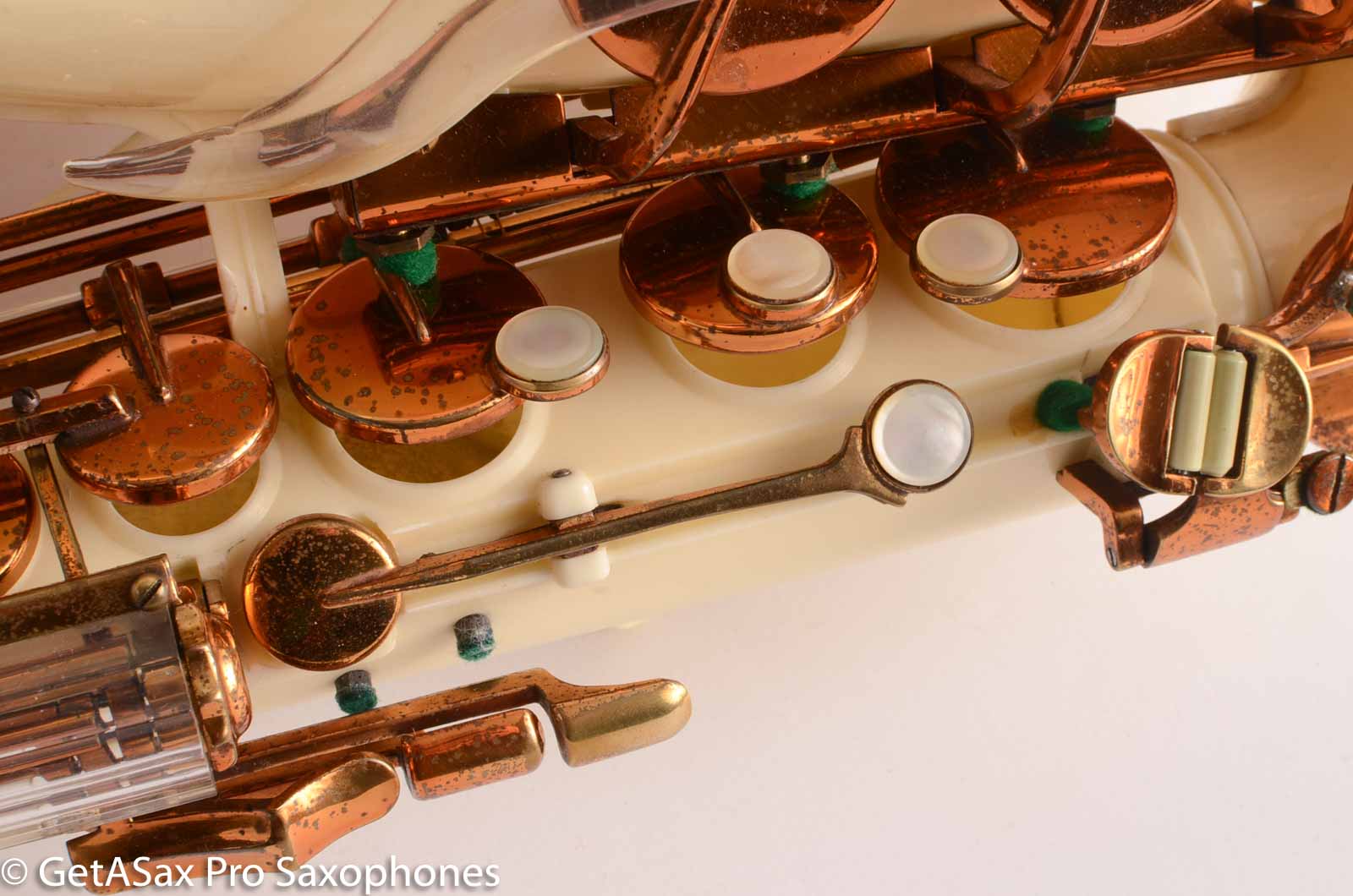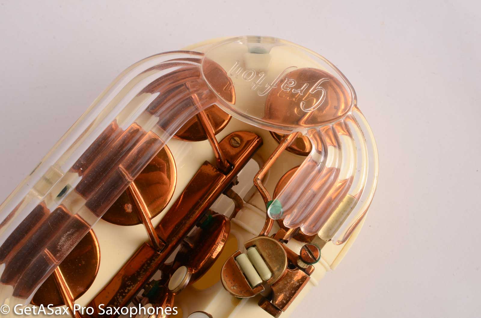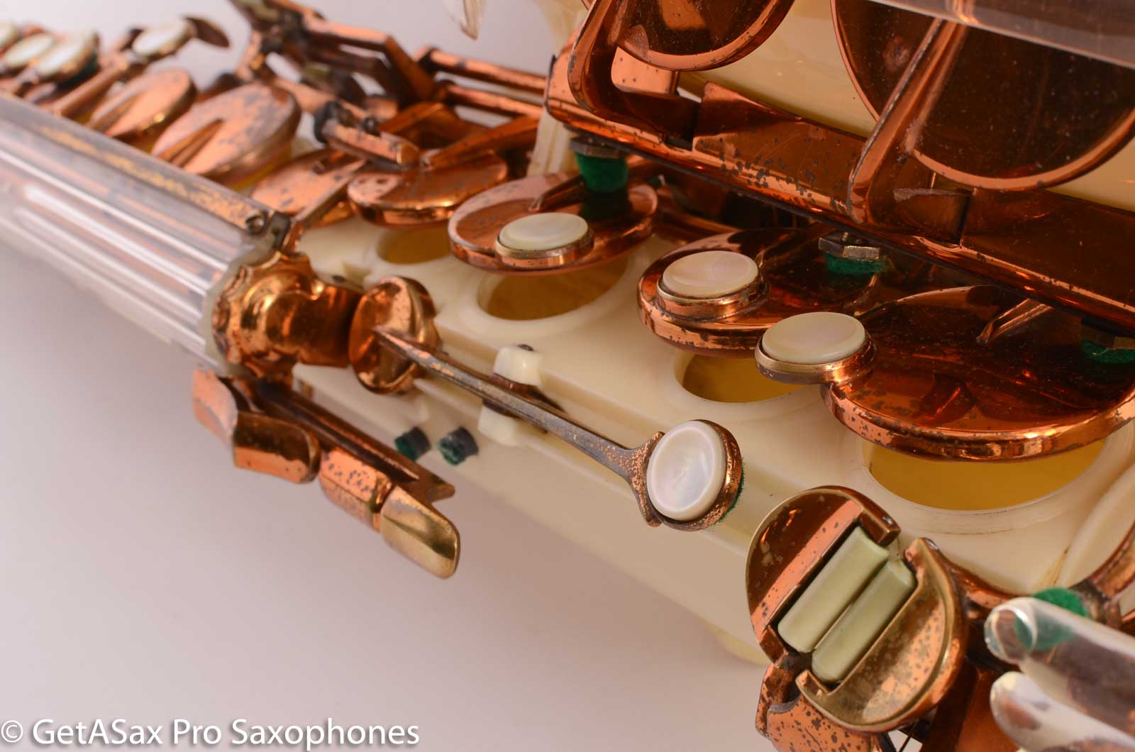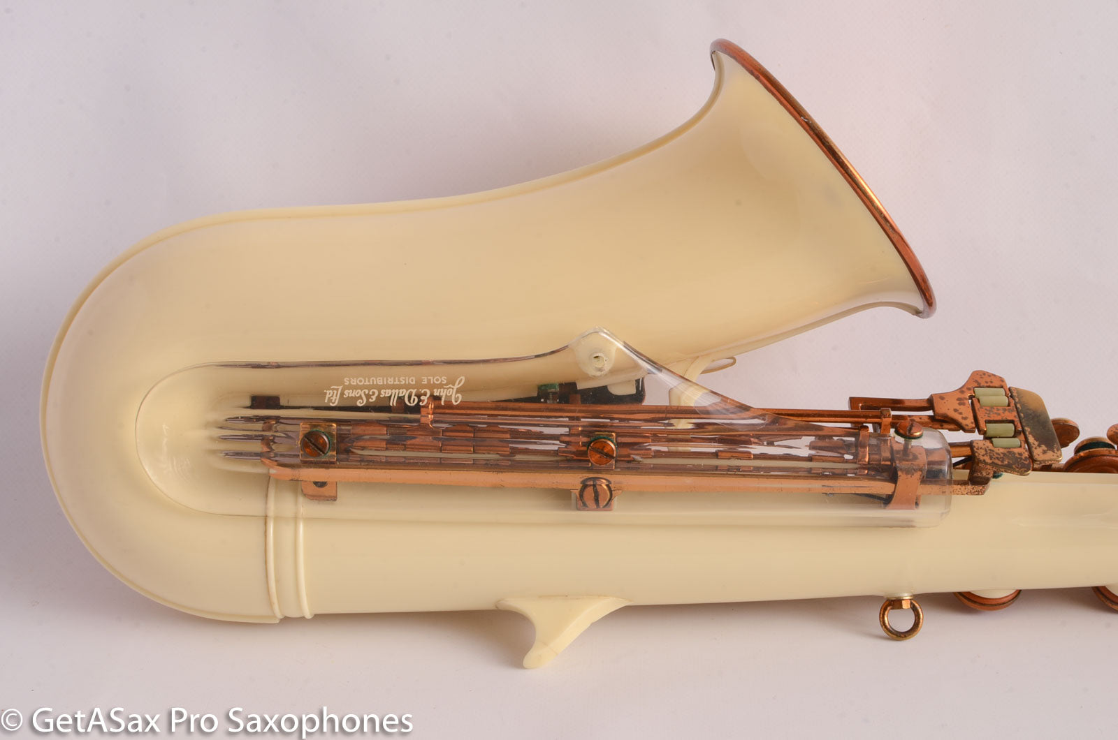 This particular example has actually been repadded by some enterprising repairer (I say it this way because they are notoriously challenging to work on) and it has been done rather well. It plays, as you may or may not expect, very much like a saxophone and there is not much in the playing of it to convey that the instrument you are playing is wholly unique, with new methods of manufacture and the completely singular keywork mechanisms that its injection molded acrylic body required. It is comfortable under the fingers, responsive, weighs about what a normal sax weighs, and plays with a warm, if somewhat uncomplex, tone. It is in fact quite an amazing instrument when taken as a whole, and the experience of playing it leaves me with wonder and respect for the company that made it.