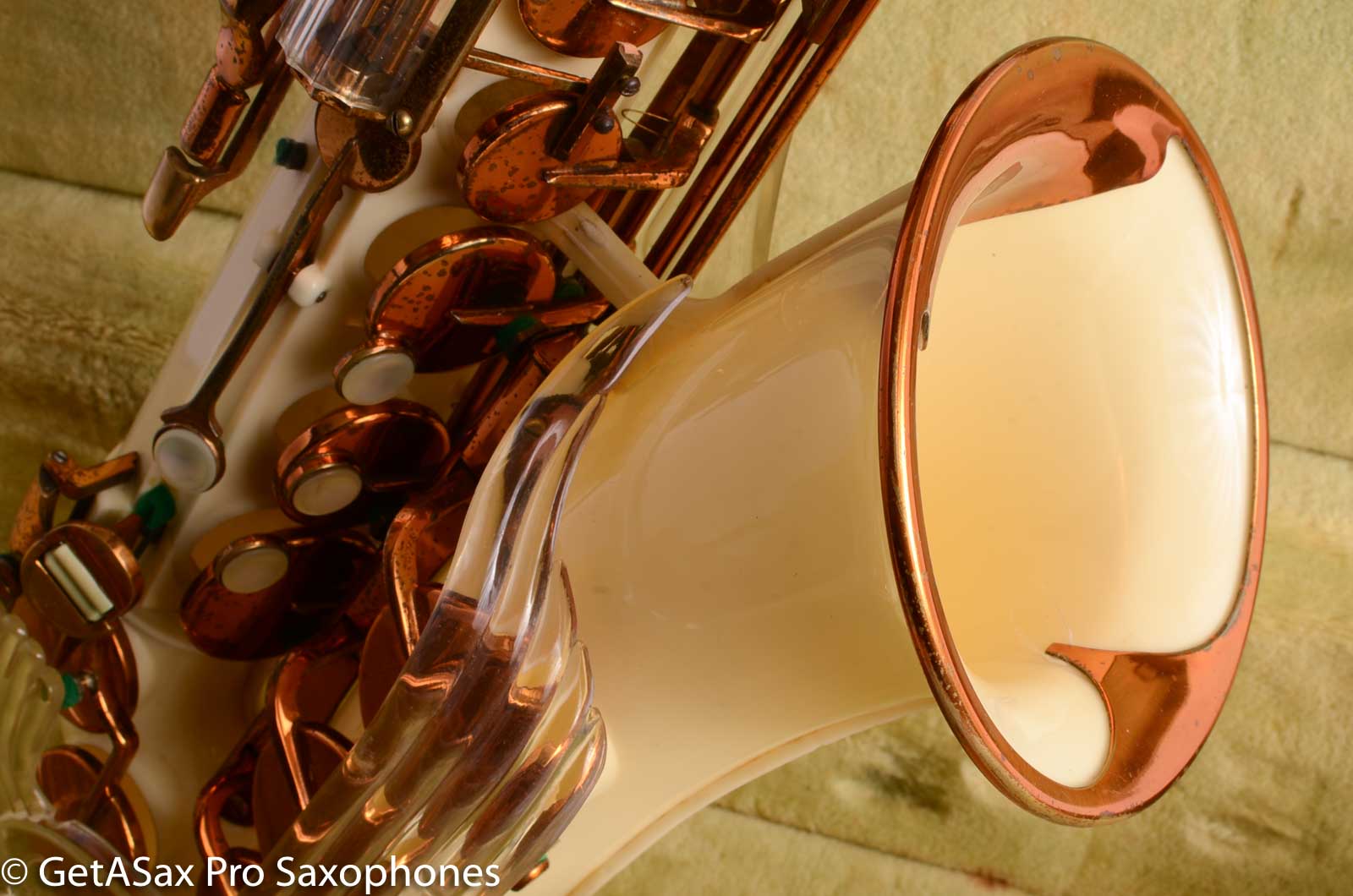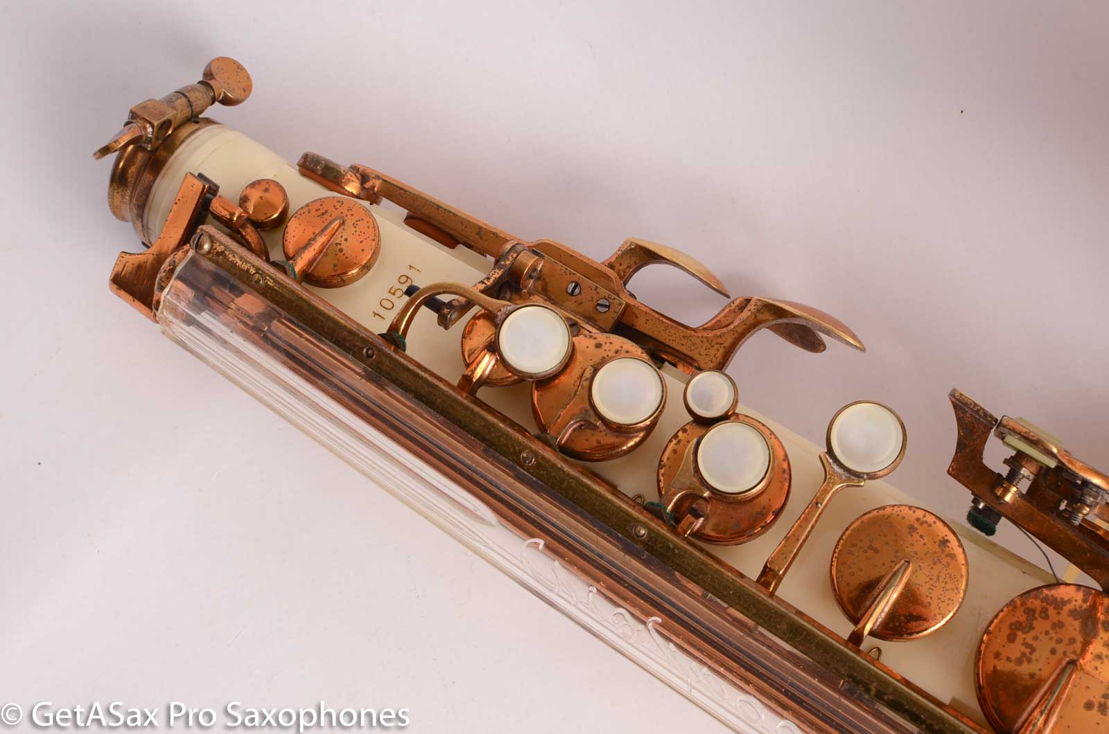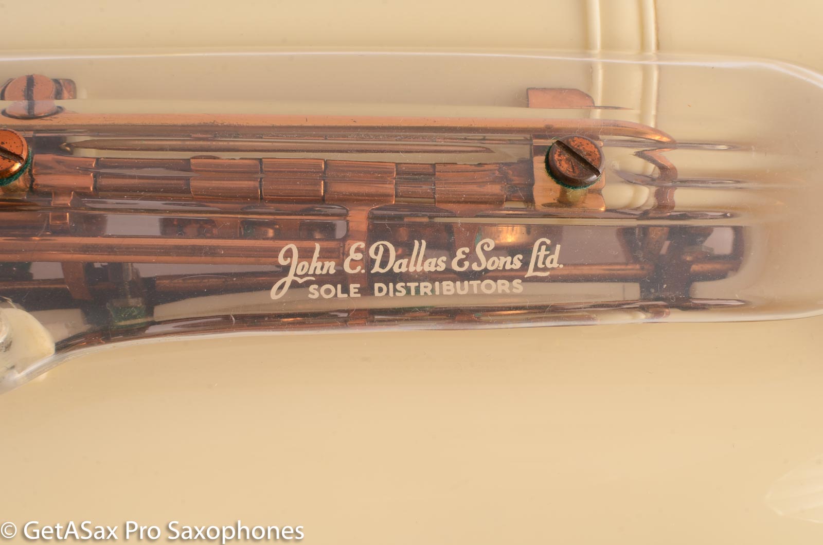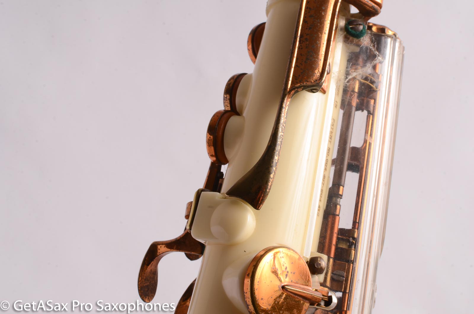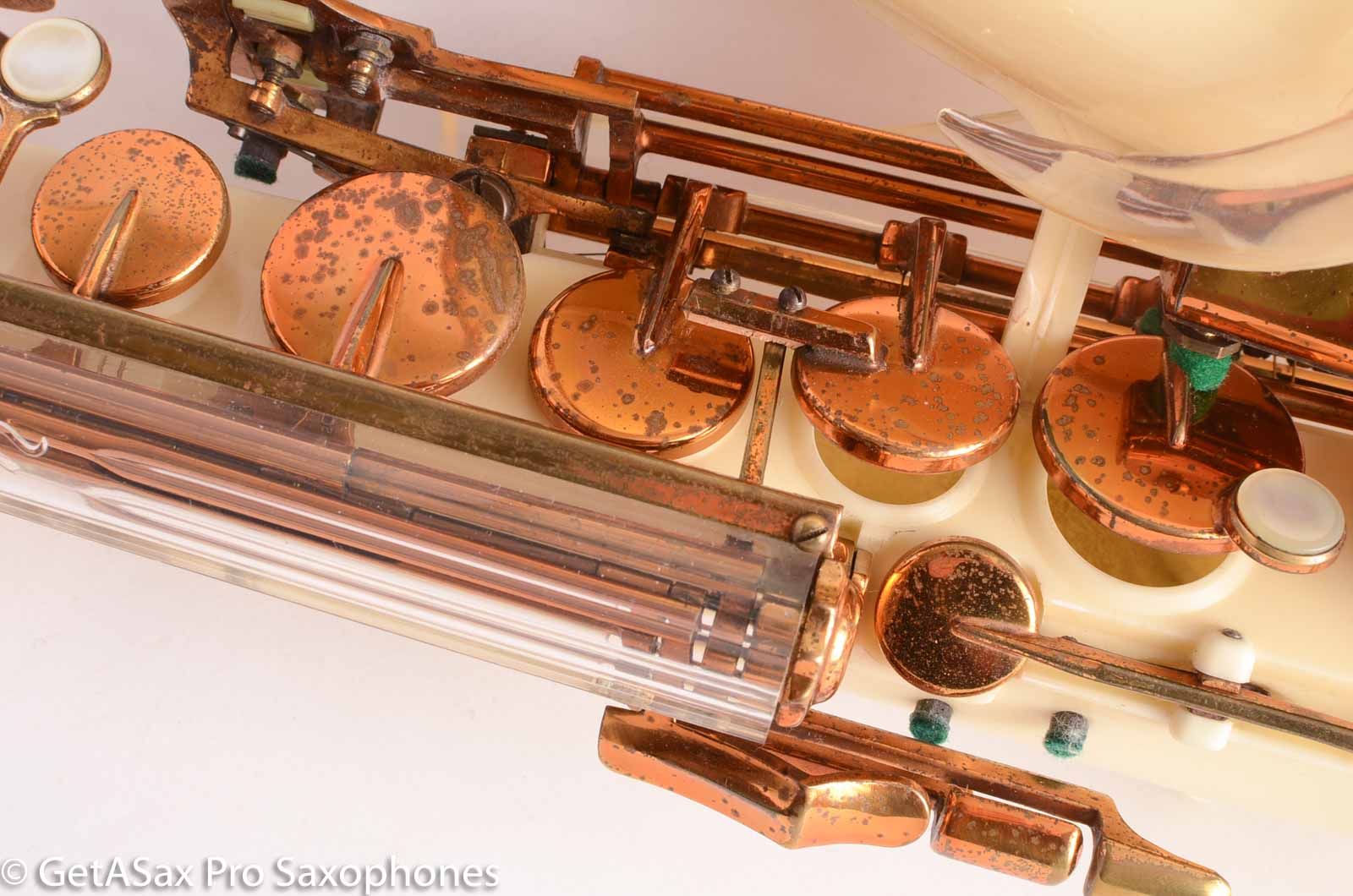 This particular example has actually been repadded by some enterprising repairer (I say it this way because they are notoriously challenging to work on) and it has been done rather well. It plays, as you may or may not expect, very much like a saxophone and there is not much in the playing of it to convey that the instrument you are playing is wholly unique, with new methods of manufacture and the completely singular keywork mechanisms that its injection molded acrylic body required. It is comfortable under the fingers, responsive, weighs about what a normal sax weighs, and plays with a warm, if somewhat uncomplex, tone. It is in fact quite an amazing instrument when taken as a whole, and the experience of playing it leaves me with wonder and respect for the company that made it.