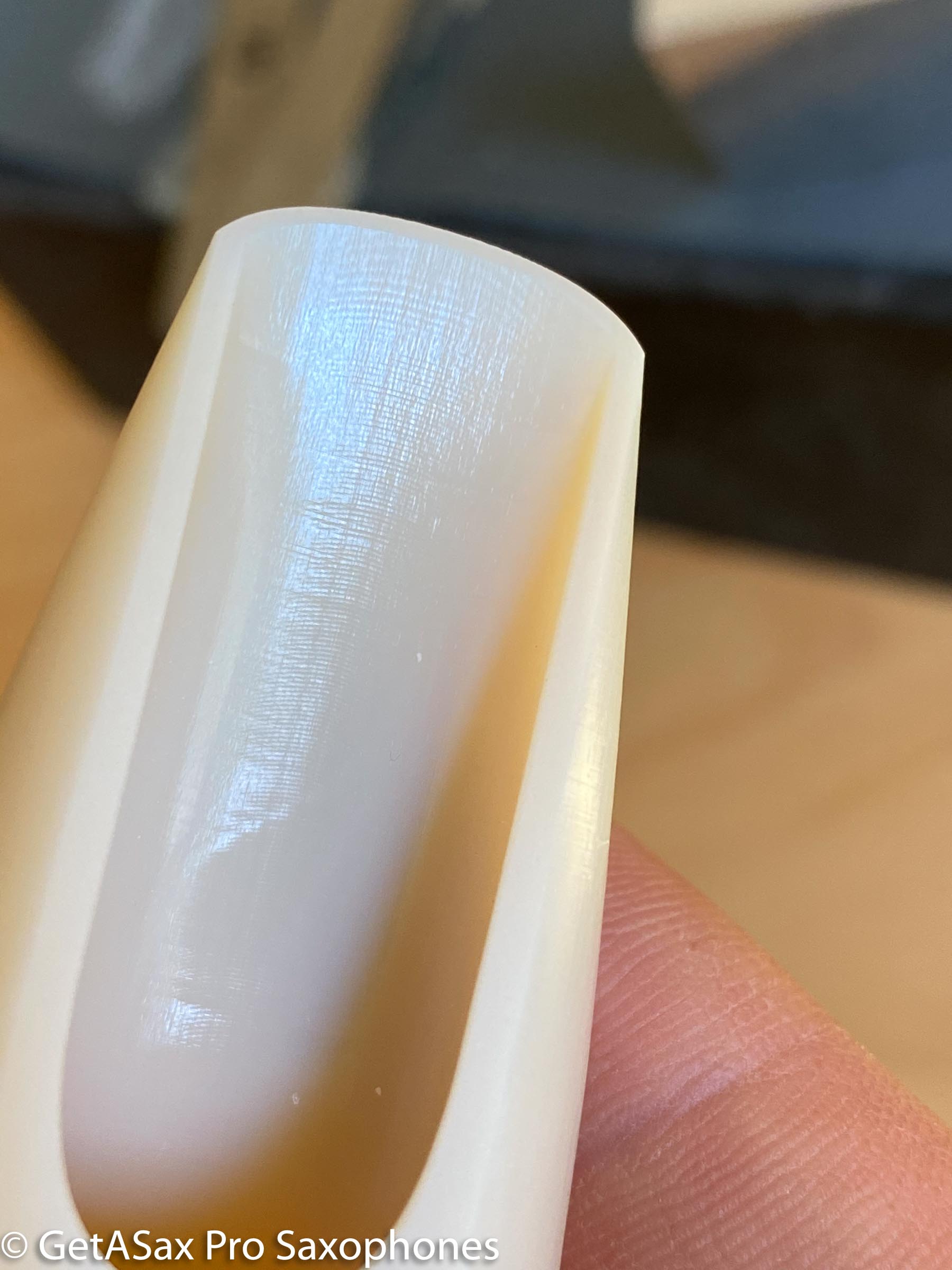 Each GS Reso gets carefully hand faced and finished before coming to you. This is super important. The magic of a mouthpiece is in the facing. If you buy a generic, mass-produced mouthpiece, chances are the table is not flat and the facing is uneven between the side rails. As a result, the reed vibrates unevenly. It feels stuffy and dead, resistant, and all-around disappointing to play. SO many people have this problem, whether they know it or not. I don’t know how many players I’ve helped to get their first actually good mouthpiece, and all of a sudden playing is fun!