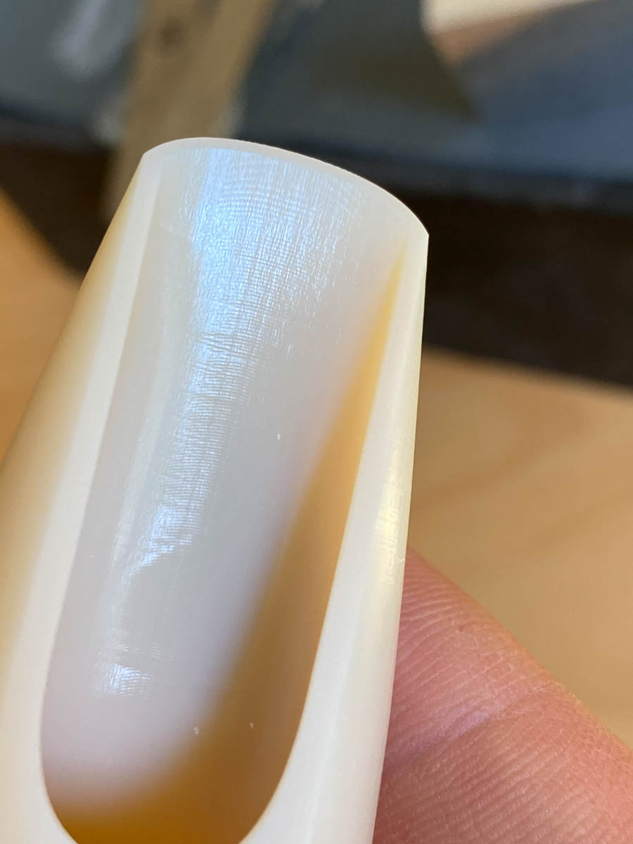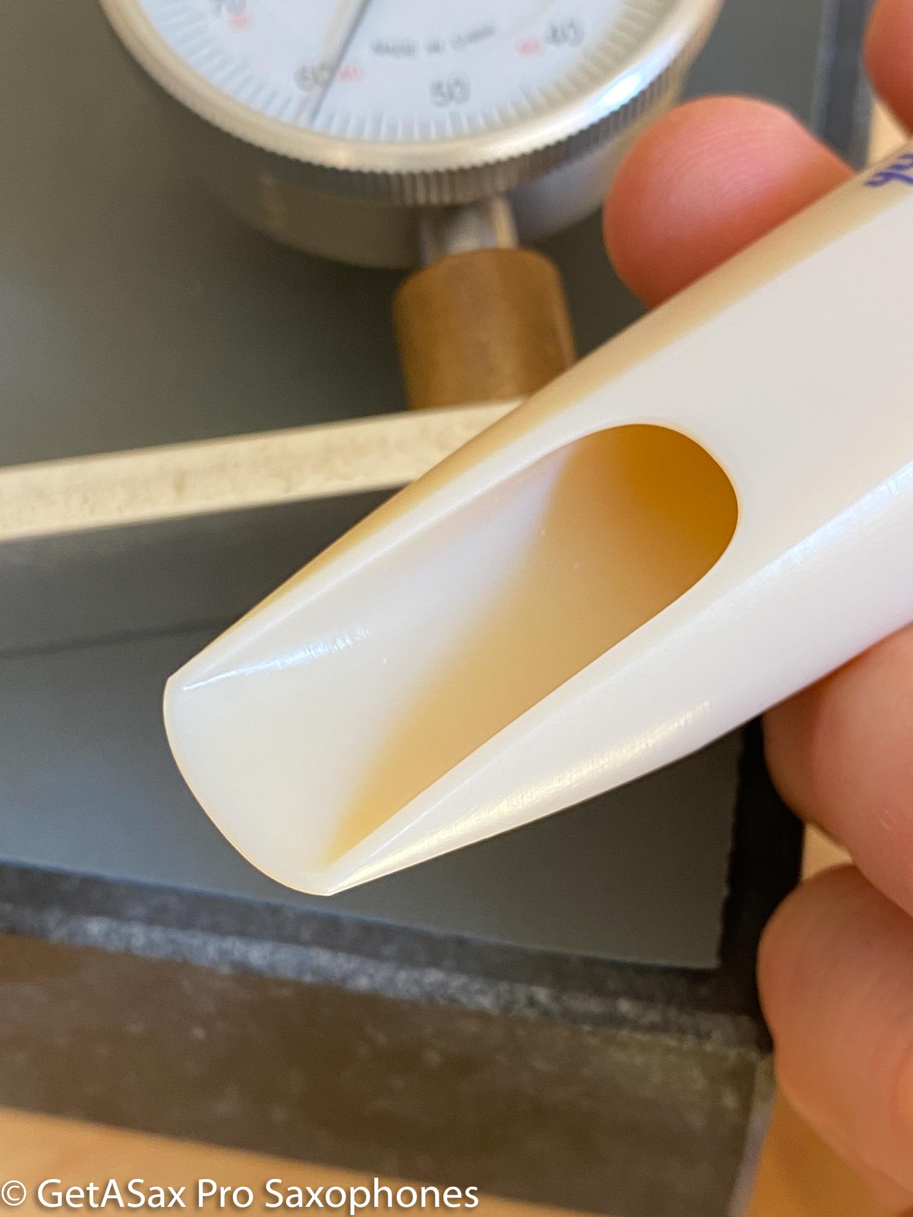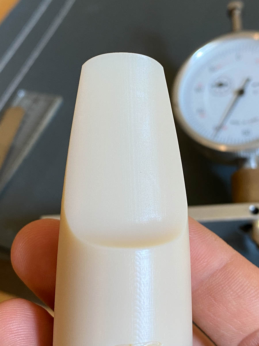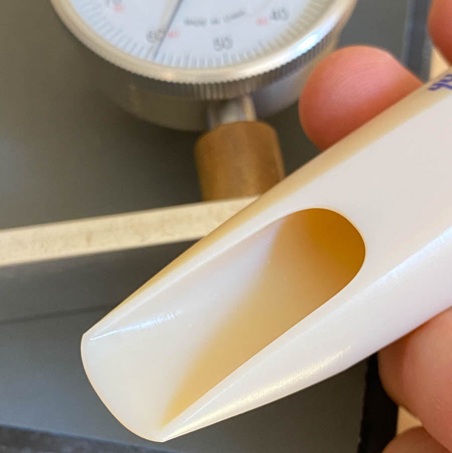 Since we flatten the table, you get an easy reed seal. There are no print lines or marks messing up the facing. It’s smooth and perfect like a boutique mouthpiece. The facing is also finished by hand, which is a BIG plus. I’m really picky about this, so I learned to do it myself so I could be sure these pieces were actually the same as my Freddie Gregory-faced Reso Chamber. Each facing is measured at ten points to make sure that it is even and consistent throughout.