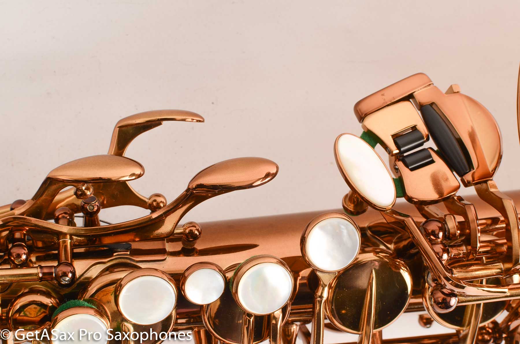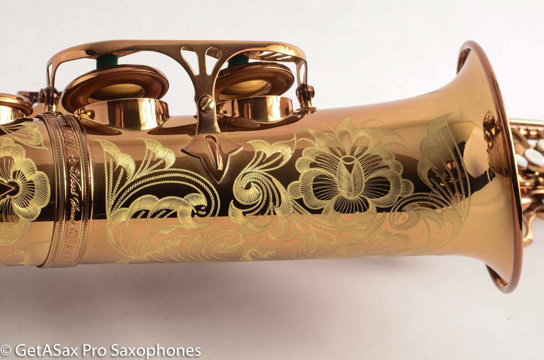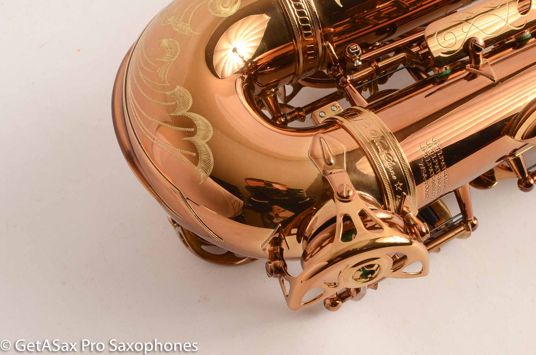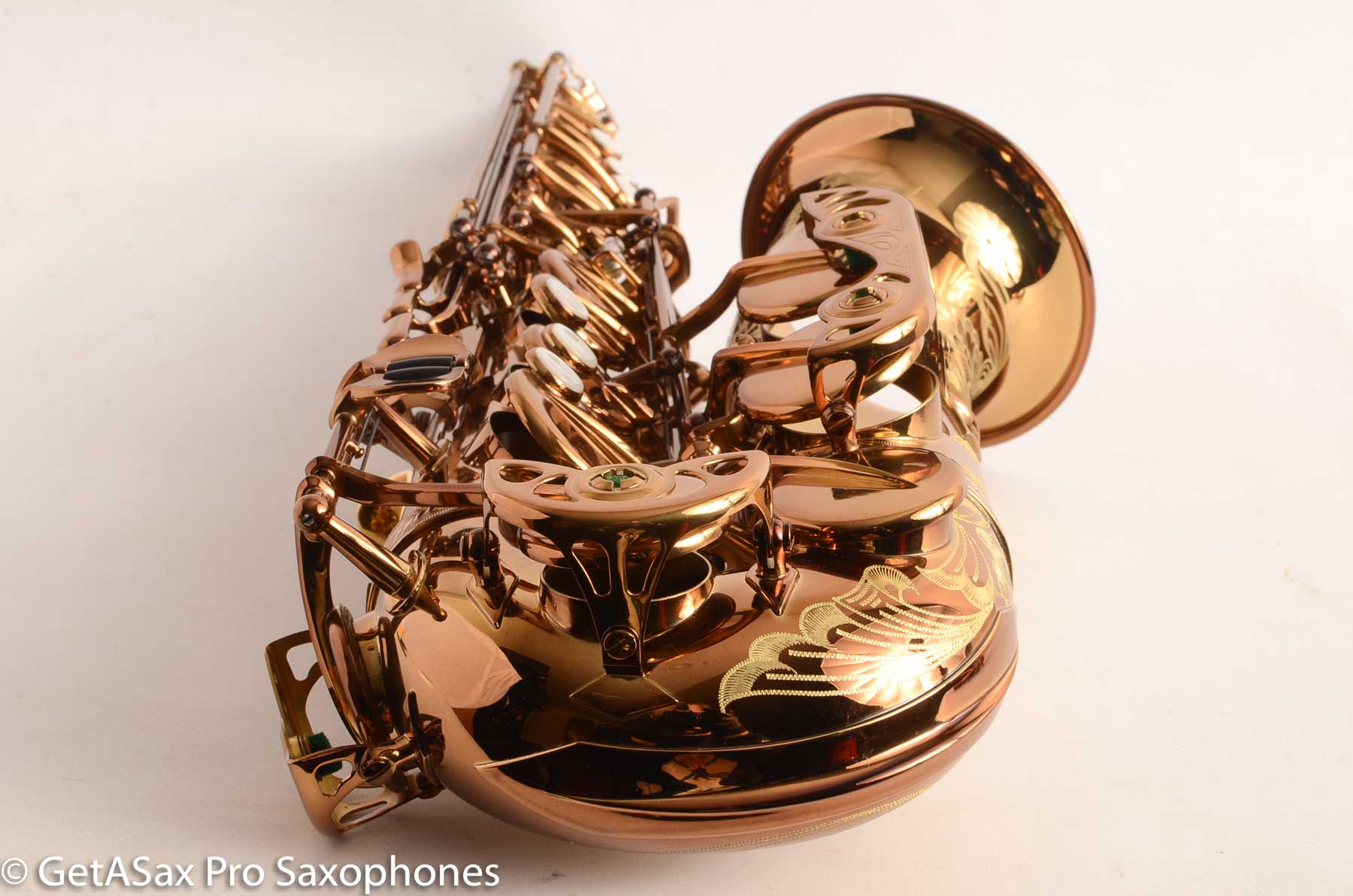 This is the highly sought-after Ishimori Wood Stone 'New Vintage' alto saxophone available. The model is WSA-VL with high F#. It has dark, cognac colored lacquer and beautiful hand engraving, the among the most elaborate of any modern saxophone. Effortless player. Hard to emphasize how effortless. Completely effortless low register, low Bb pops out like any other note. Altissimo is easy. Tuning is great. The tone is sort of Selmer-ish but punchier like a King Super 20. But it's not either of those. It's its own thing - the New Vintage alto. Easy to play delicately and softly with plenty of saturation and projection. Action is low, fast, and snappy. Great for jazz, concert, ballads-- really anything. I'm impressed! Here's our first demo video: