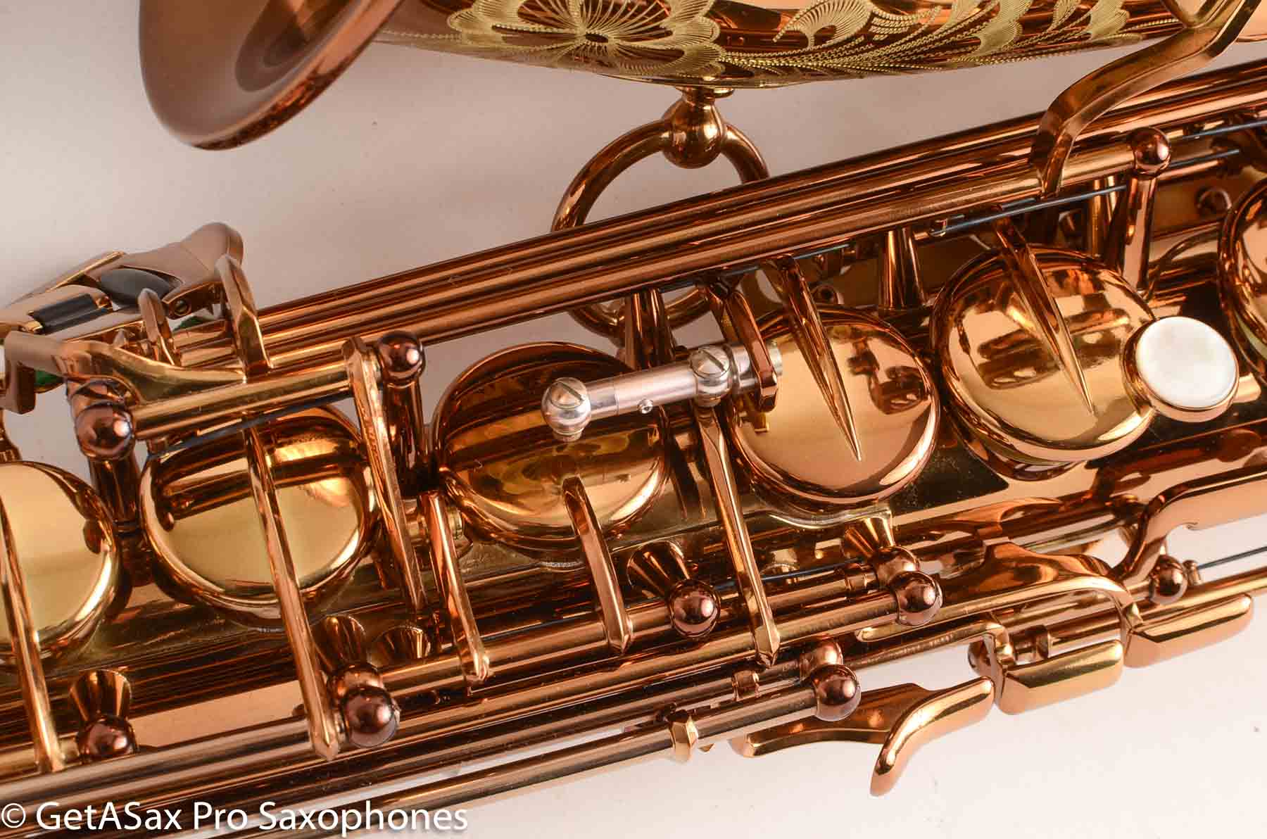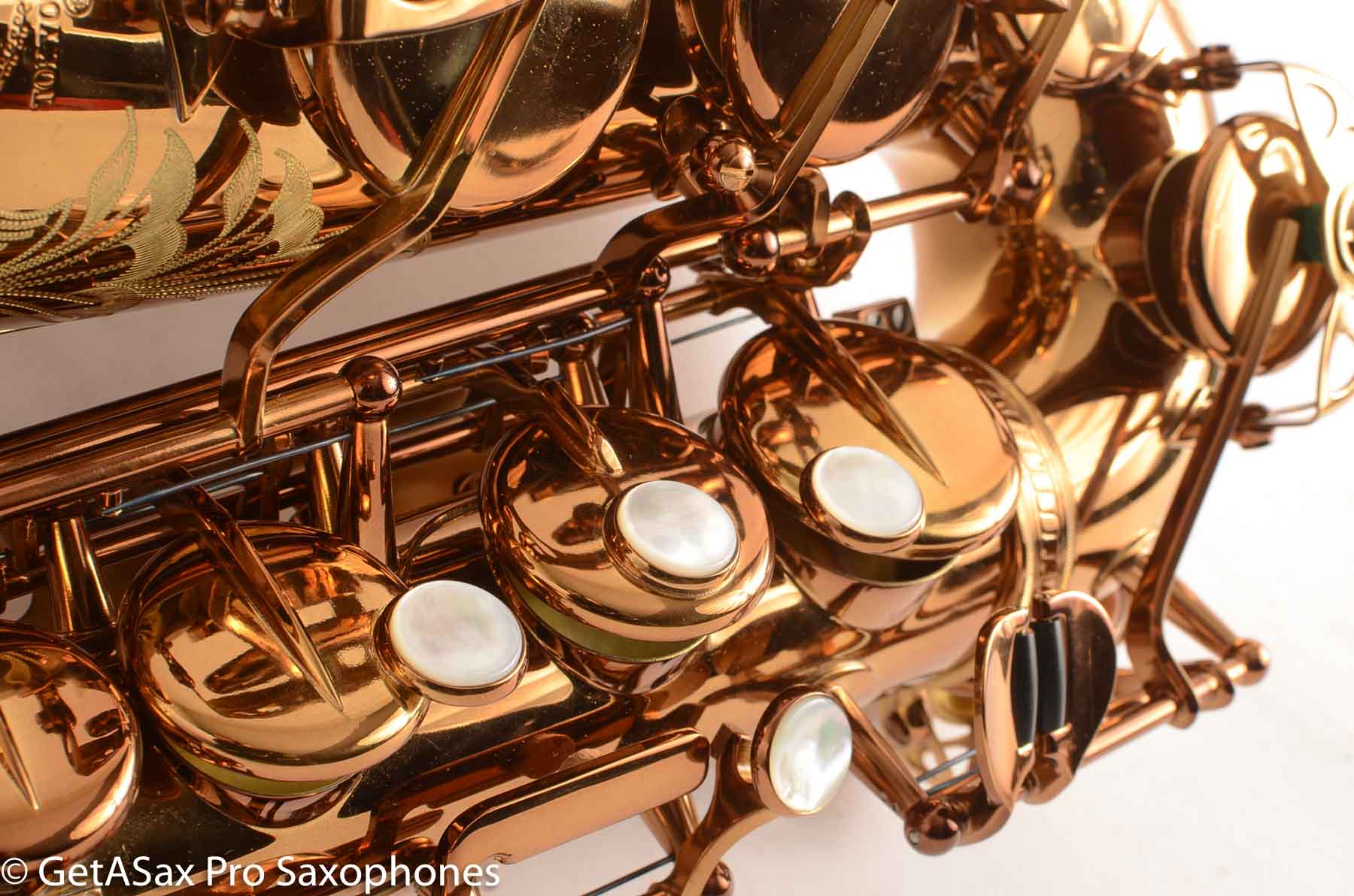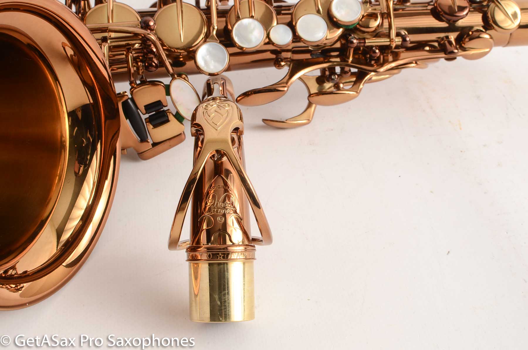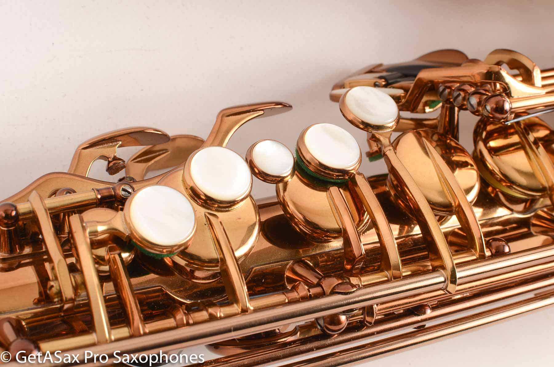 This is the highly sought-after Ishimori Wood Stone 'New Vintage' alto saxophone available. The model is WSA-VL with high F#. It has dark, cognac colored lacquer and beautiful hand engraving, the among the most elaborate of any modern saxophone. Effortless player. Hard to emphasize how effortless. Completely effortless low register, low Bb pops out like any other note. Altissimo is easy. Tuning is great. The tone is sort of Selmer-ish but punchier like a King Super 20. But it's not either of those. It's its own thing - the New Vintage alto. Easy to play delicately and softly with plenty of saturation and projection. Action is low, fast, and snappy. Great for jazz, concert, ballads-- really anything. I'm impressed! Here's our first demo video: