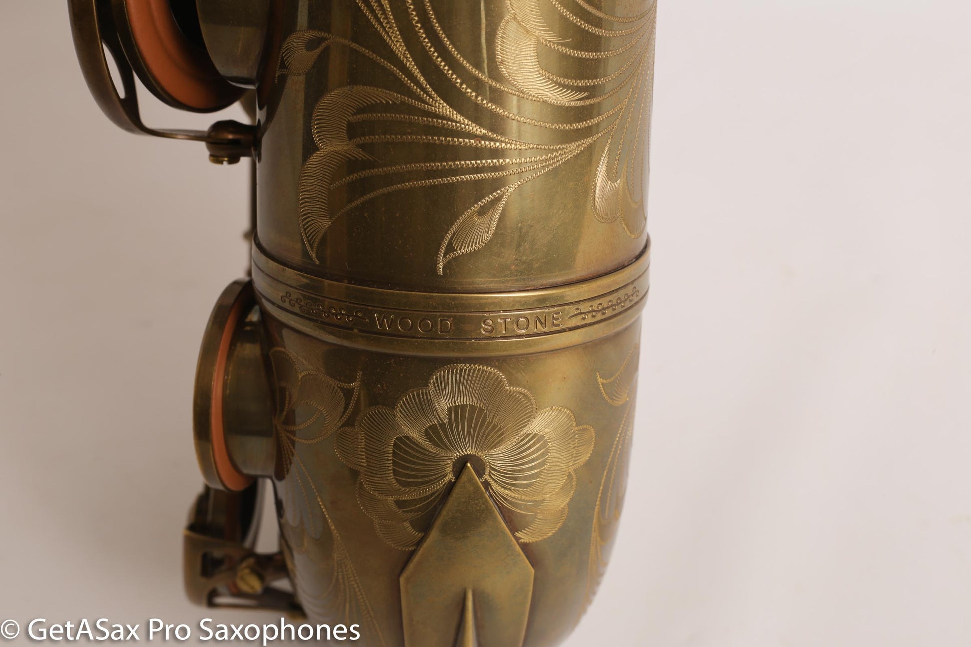 These tenors not only sound great, but they stand out from the crowd with their excellent new horn setup done in the Ishimori workshop. The Ishimori New Vintage tenors hold up extremely well over time, and every detail of construction and assembly is optimized for ease of play. The tone on this Ishimori tenor is meant to remind you of a vintage Selmer - to my ear, it plays like a late SBA - not as loud and wide open as some Mark VI's, but more focused than earlier Selmers also. The neck and the engraving are meant to evoke the Selmer Super Balanced Action, so I suspect that the neck is an SBA bore. The tuning is excellent. This body tube is designed to have the high F# tone hole present, so it tunes well with the high F#, and that's also just a convenient feature. The finish is a stable patina applied to the bare brass. While it will continue to change in appearance somewhat, it will basically look like this. You get the bare brass finish plus a great unique look to the horn that ages well - much nicer than the completely shiny unlacquered finish that Yamaha does. This looks really classy.