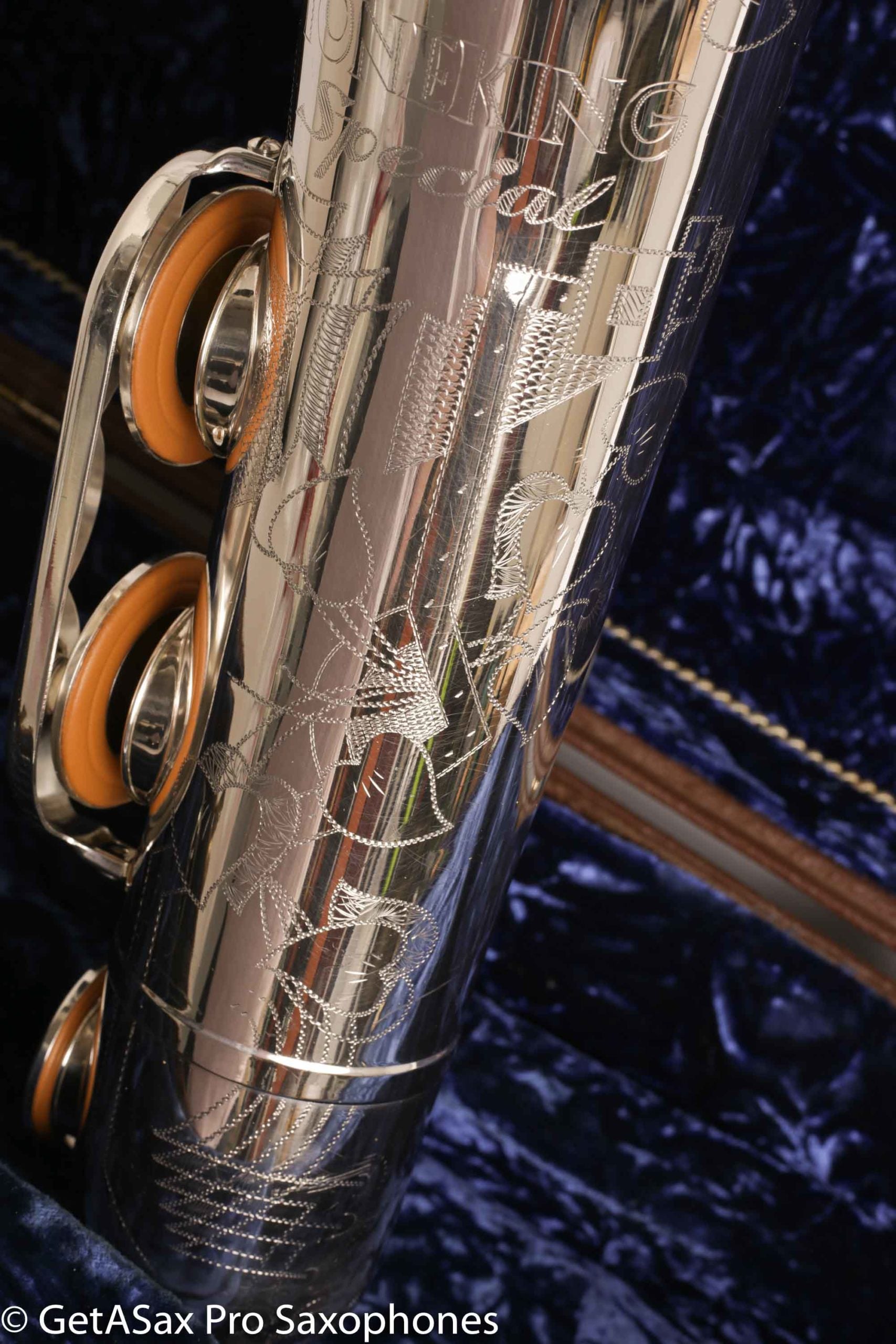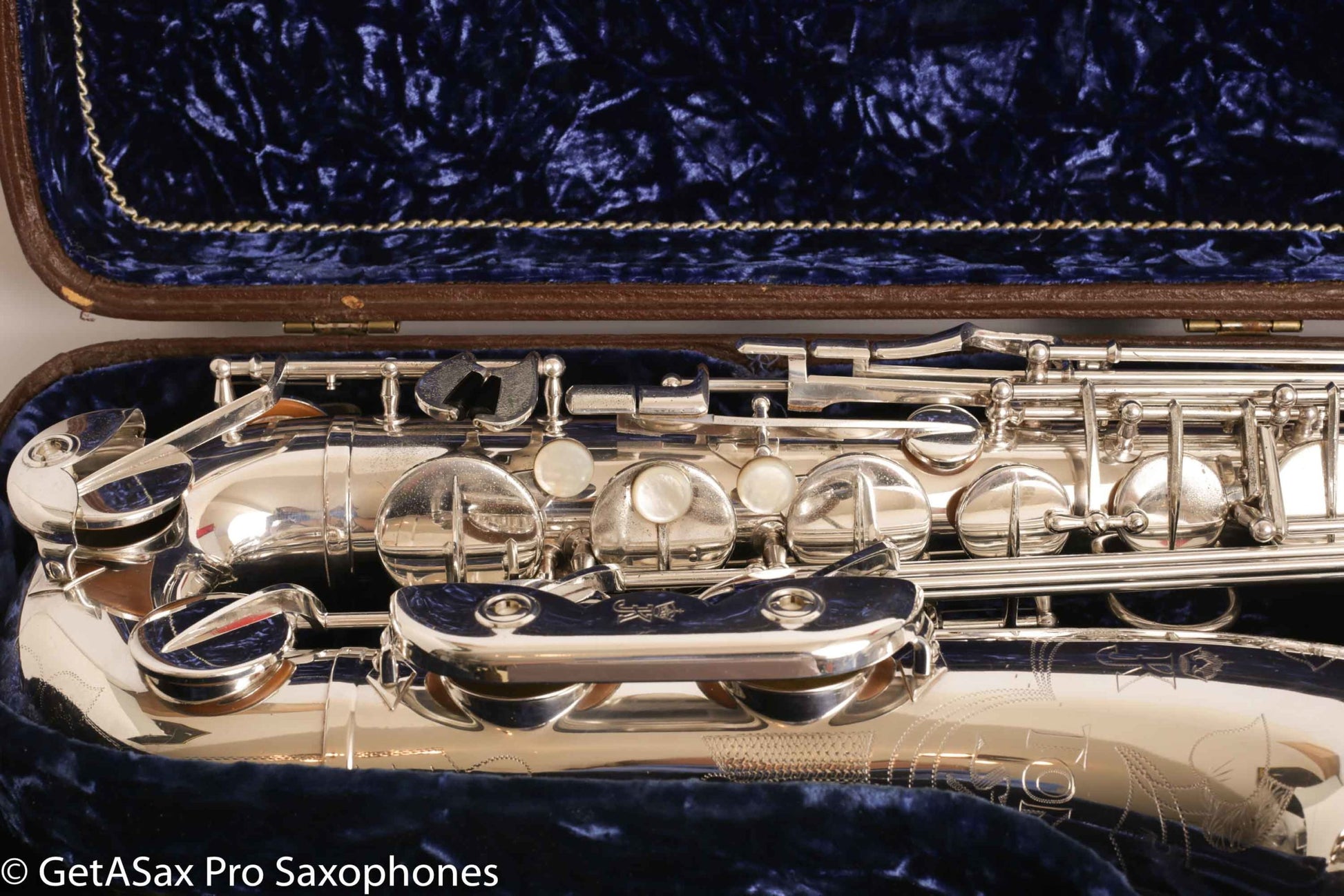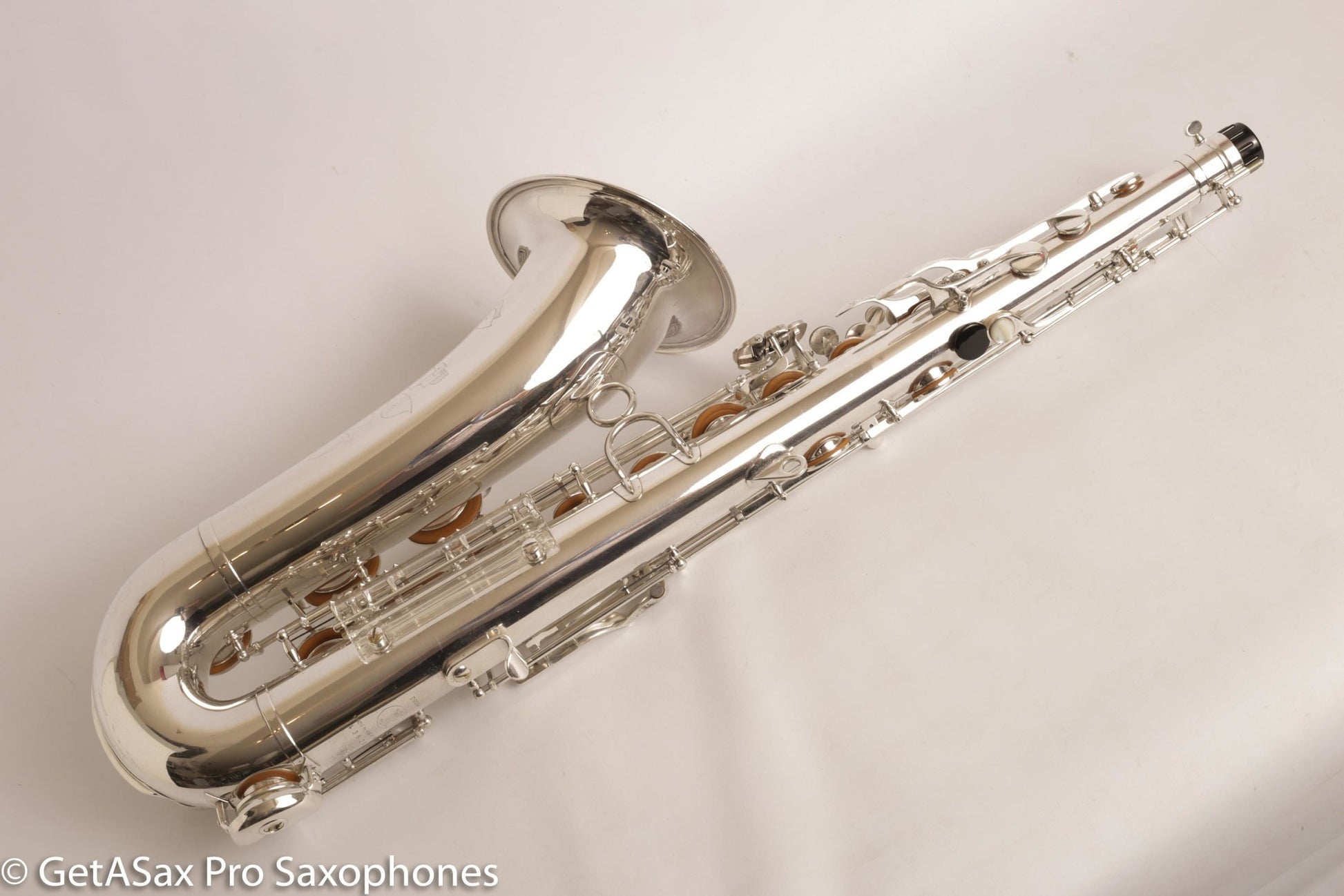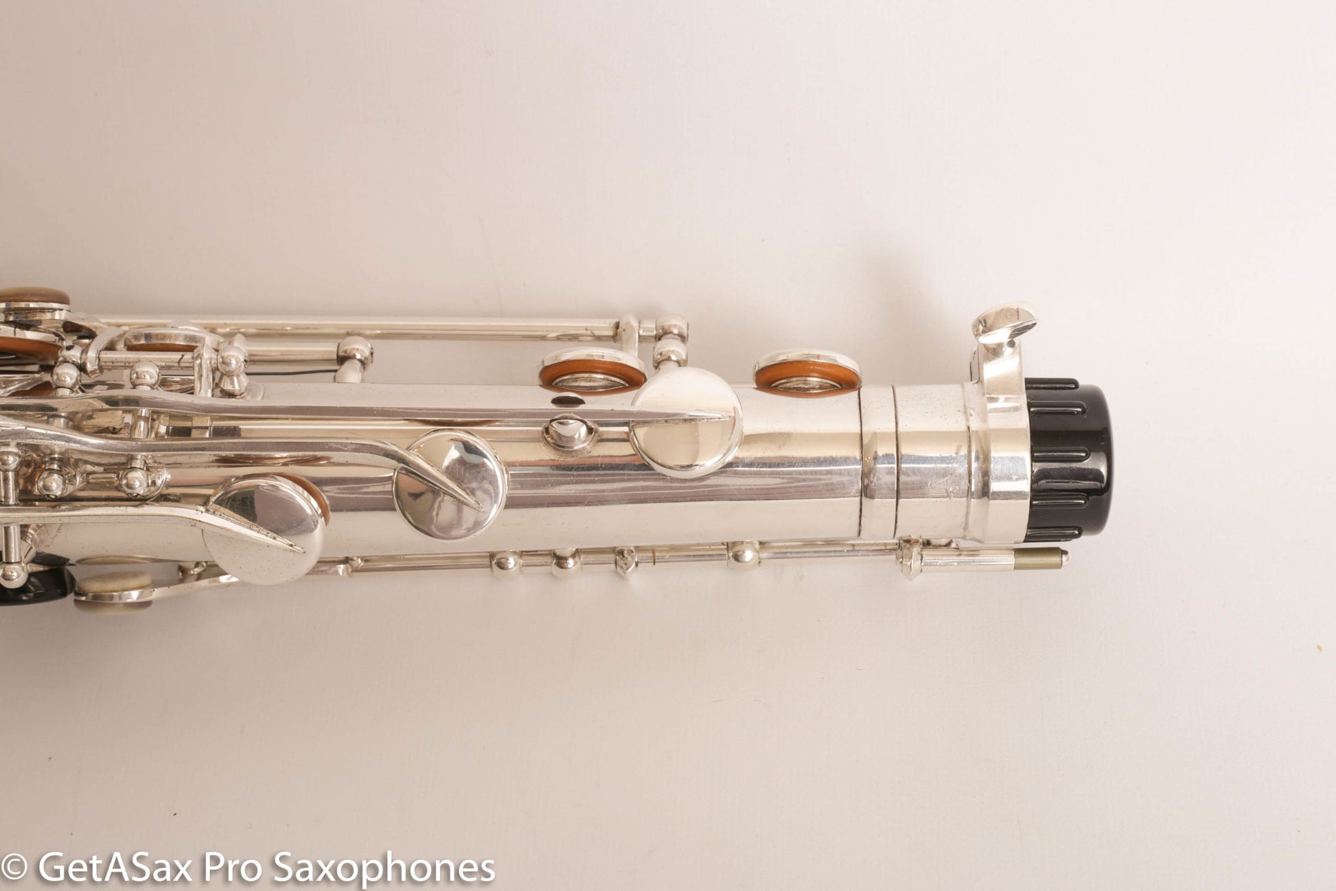 This is as good as it gets in a vintage Keilwerth saxophone. This rare original silver Tone King Special was Keilwerth’s first really top quality horn, and this is the earliest example of one that I have had. It just got a complete overhaul and plays AMAZINGLY. Nothing plays like a Keilwerth. These early ones are like a Conn 10M + a Selmer SBA. Big fat upper register like a Conn, and a dark tone, but with a focused core like a Selmer, and modern keywork!. I had Ernie Watts in the shop not too long ago, and he sounded like Coltrane on his Keilwerth + FL Link 13* metal! A lot of that is style, of course, (Ernie is a legend) but the SBA sort of tone is in there. What an outstanding tenor! This is also the version that morphed into the Couf Superba 1 with some slight changes (smaller bell etc.) The Tone King Special / Superba 1 is one of the best all-around tenors in my opinion. Vintage tone, modern keywork, great build quality. The overhaul on this horn is top quality. It feels better than new under the fingers, and it has all the little touches completed that take a horn from good to great. (Thorough neck fit, correct adjustment materials, thorough cleaning, correct pad heights, pad feel, hand polish).