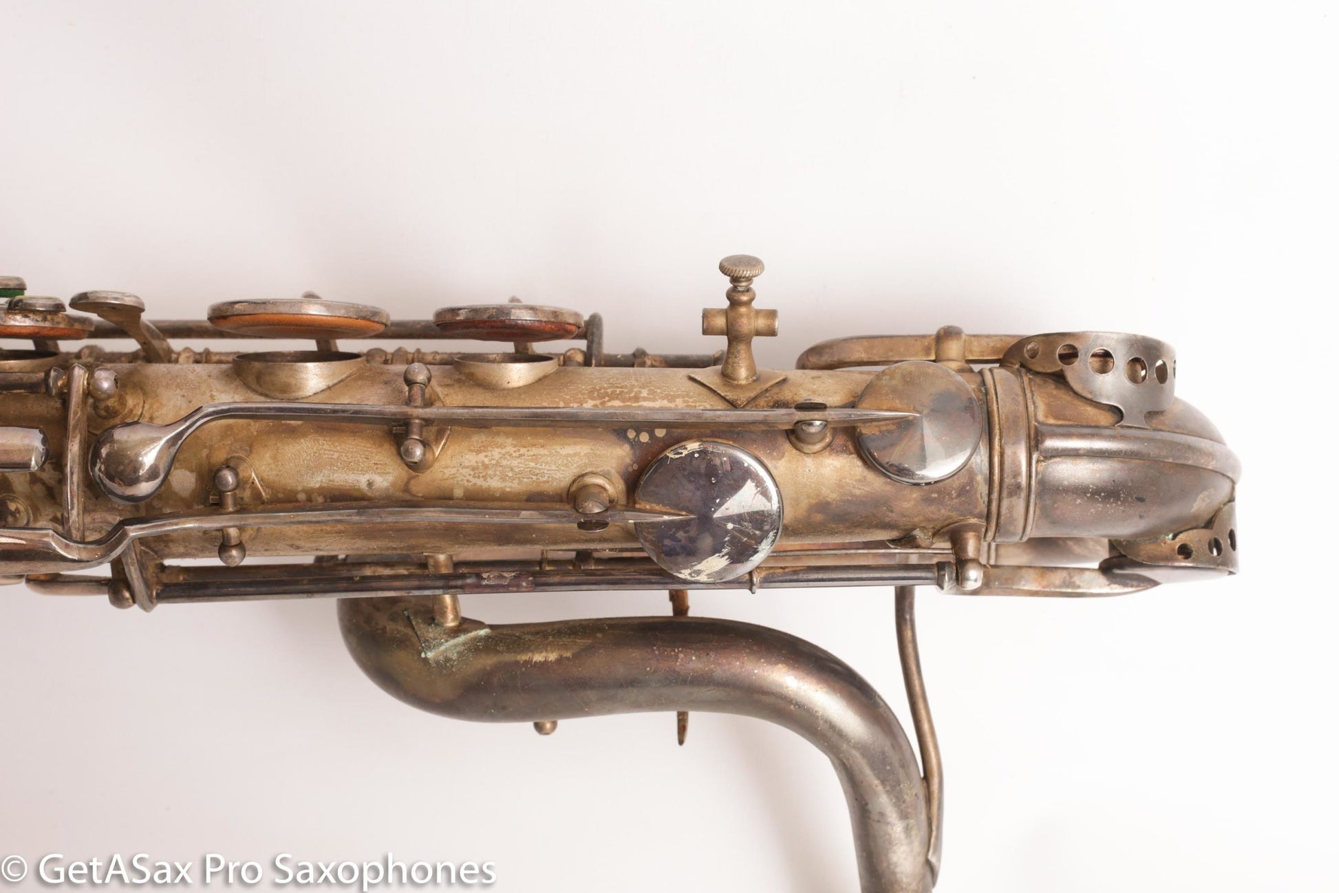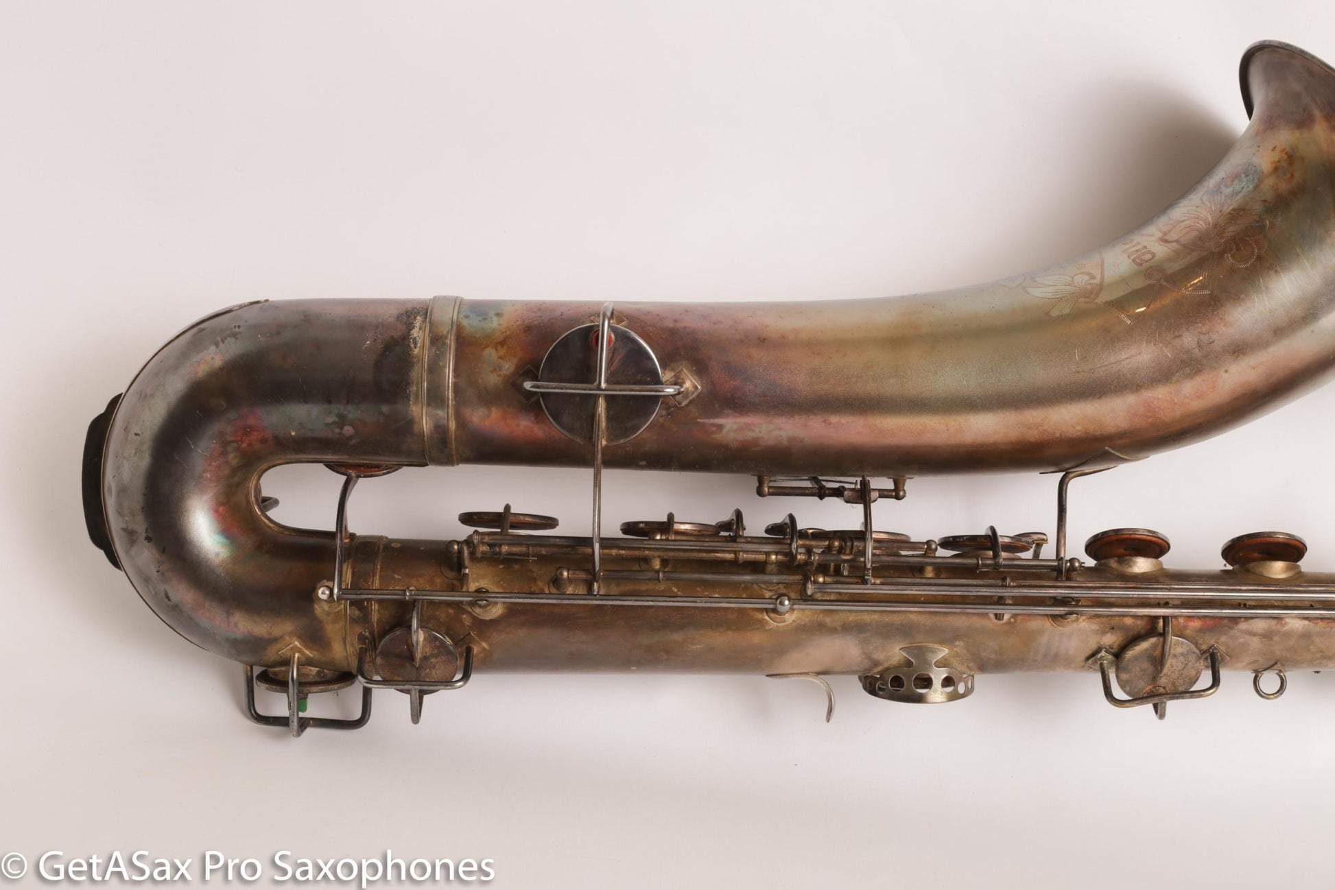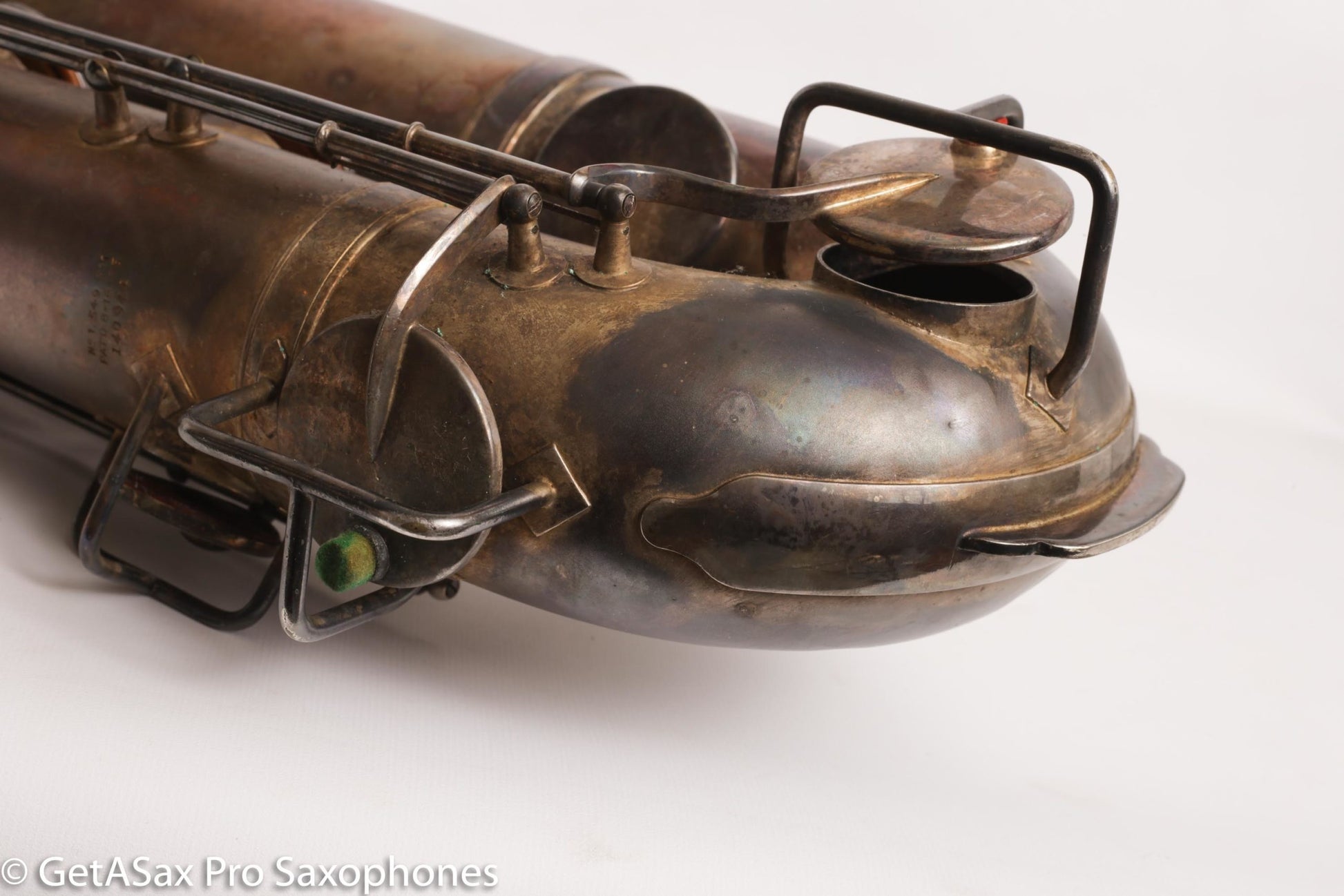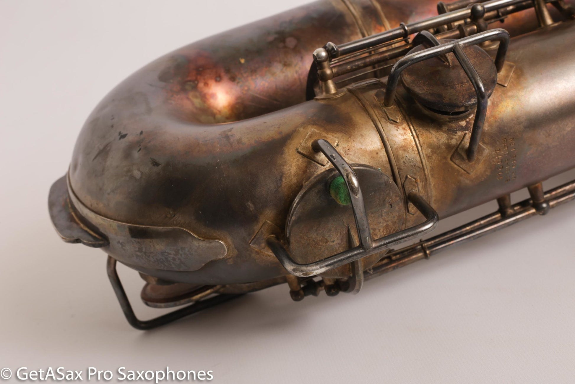 Original pads on this amazingly well-preserved original silver plate King baritone saxophone. It has to have an overhaul if you want to play it. But then you will have the nicest King baritone saxophone of this model in the world in all likelihood.