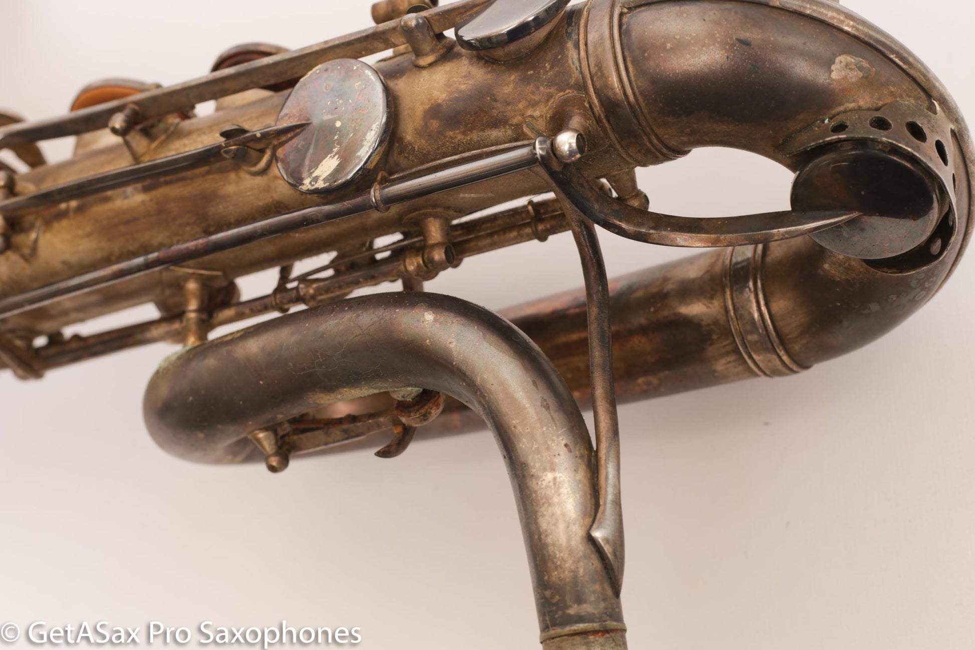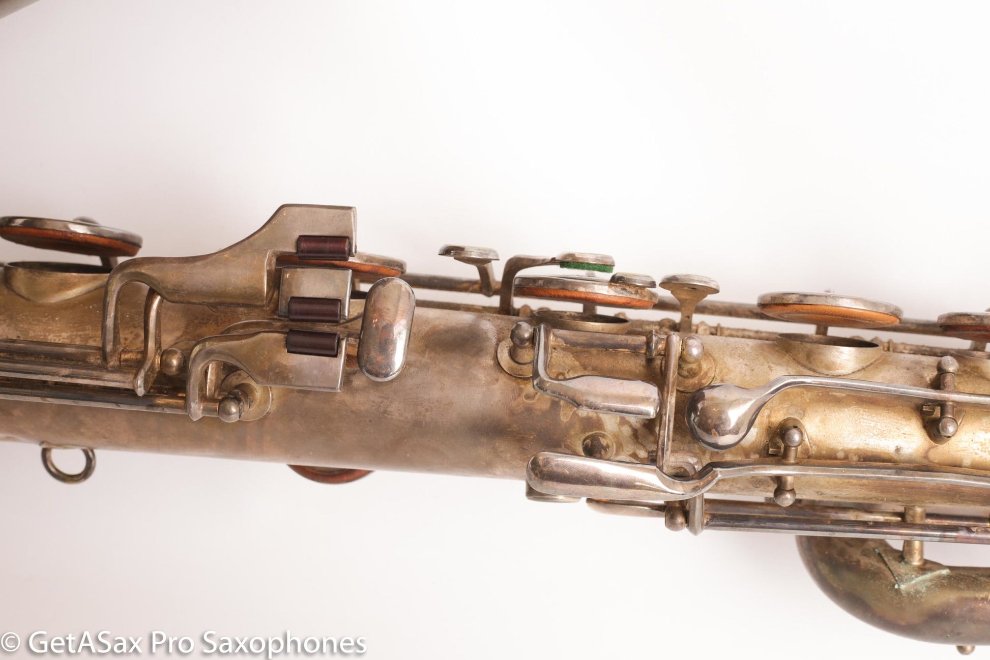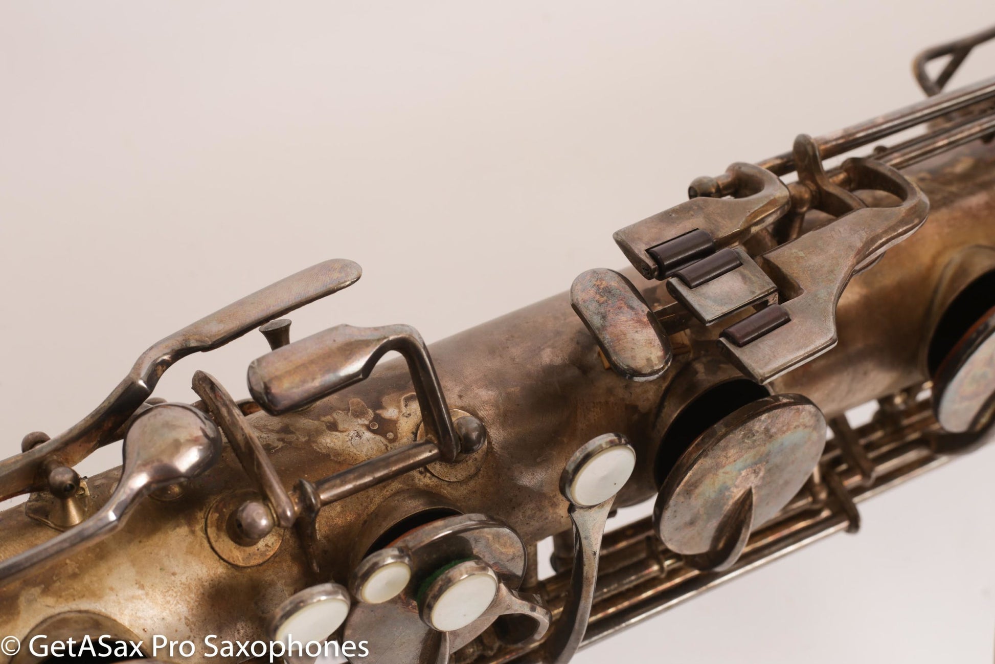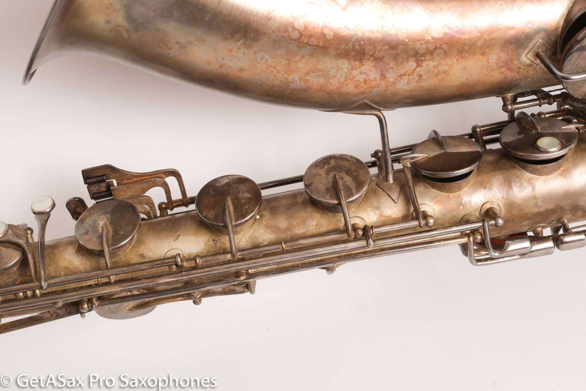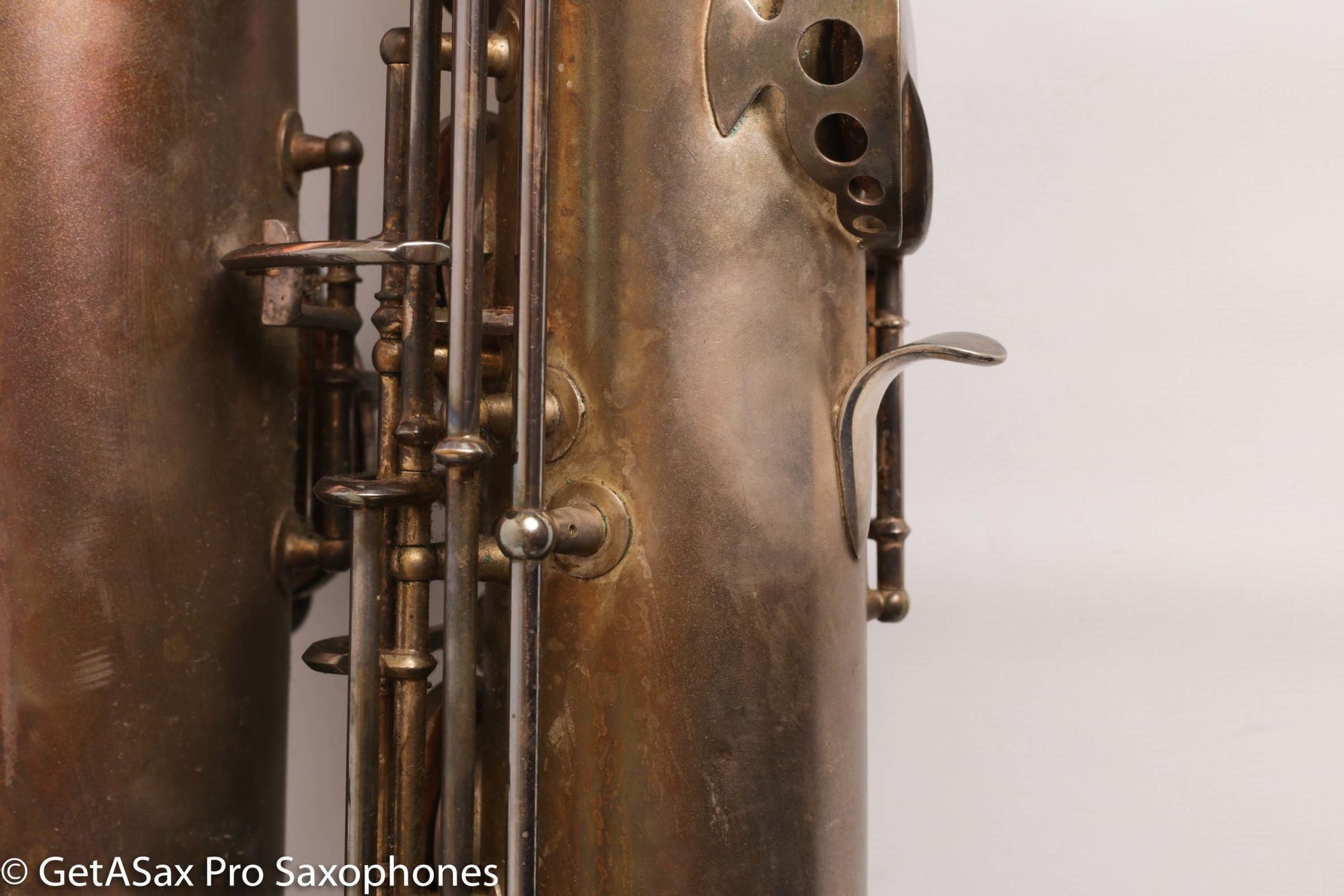 Original pads on this amazingly well-preserved original silver plate King baritone saxophone. It has to have an overhaul if you want to play it. But then you will have the nicest King baritone saxophone of this model in the world in all likelihood.