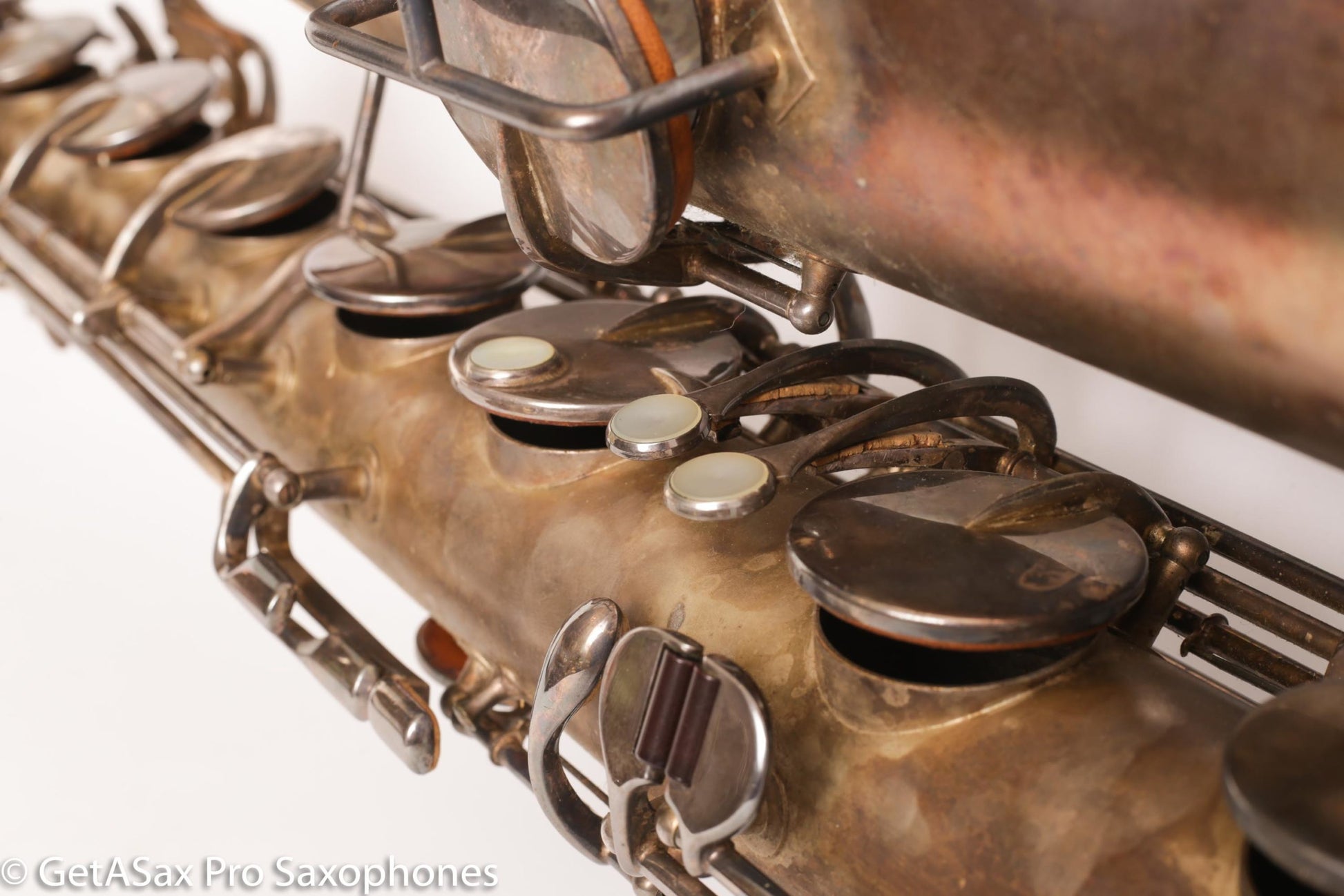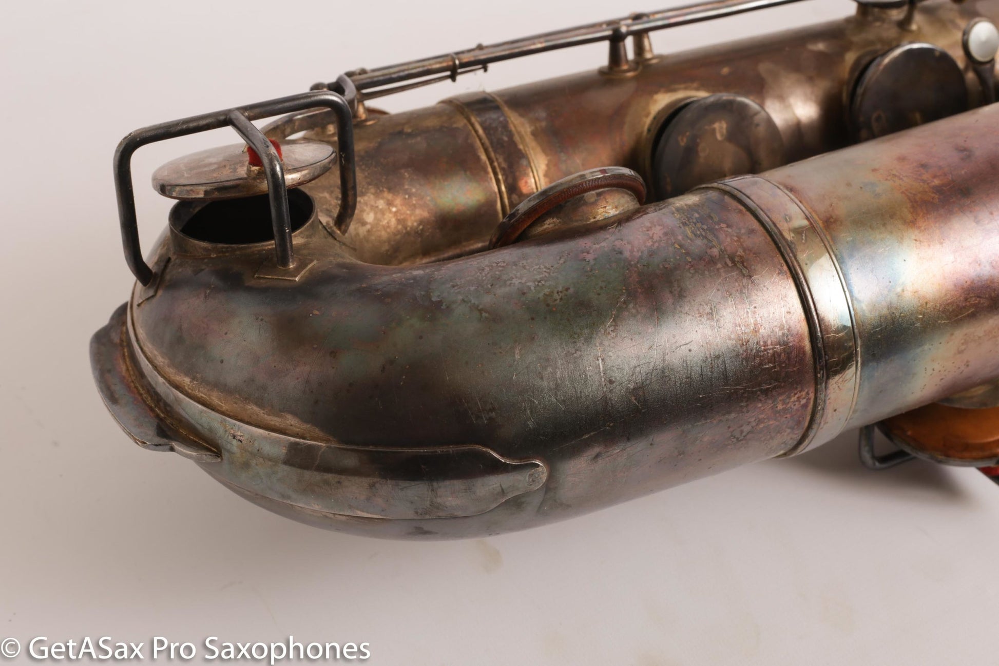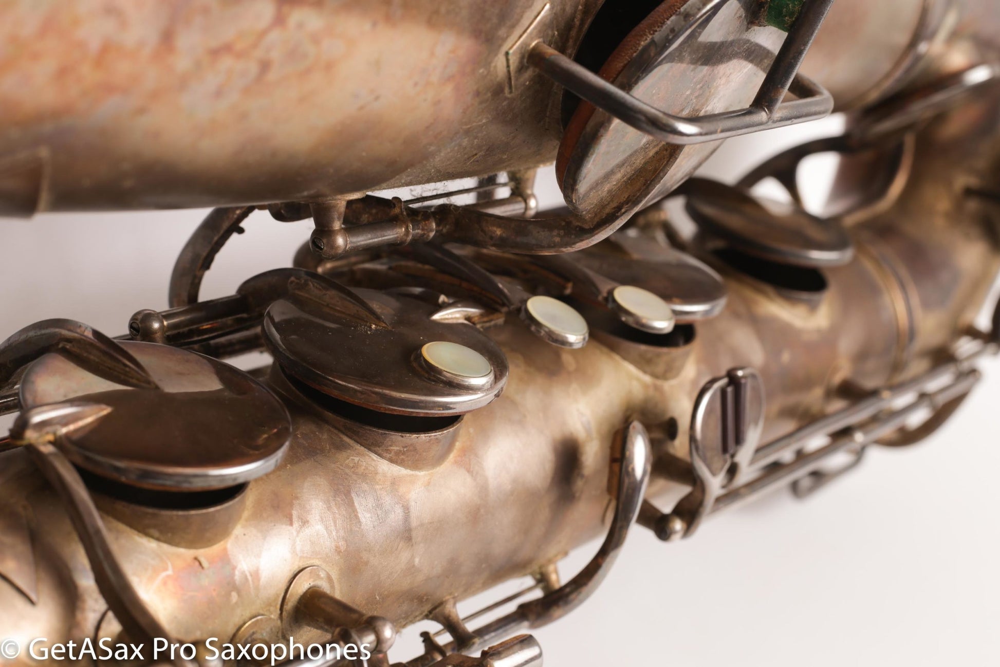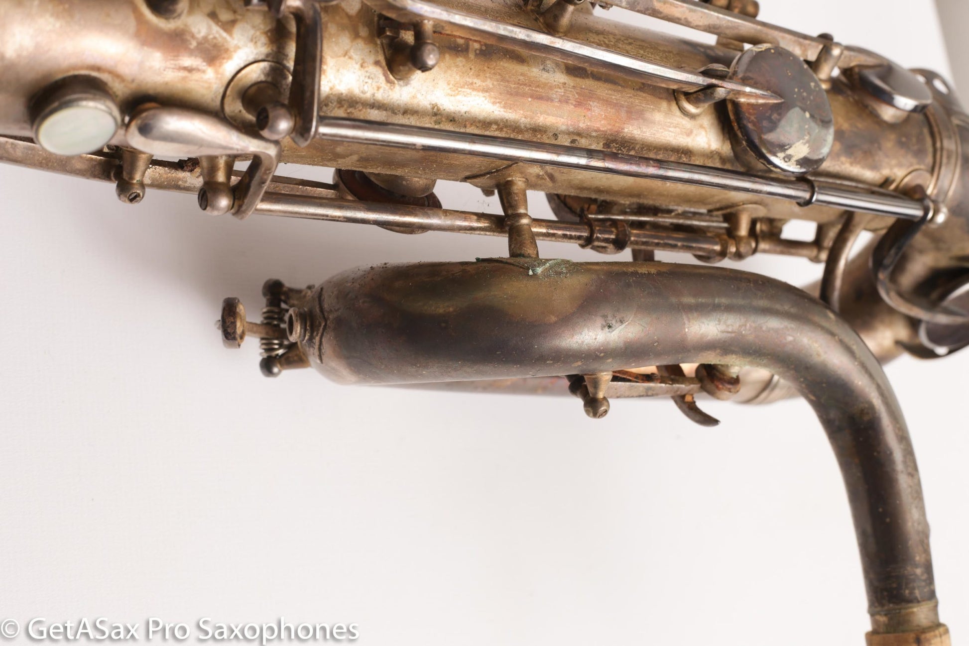 Original pads on this amazingly well-preserved original silver plate King baritone saxophone. It has to have an overhaul if you want to play it. But then you will have the nicest King baritone saxophone of this model in the world in all likelihood.