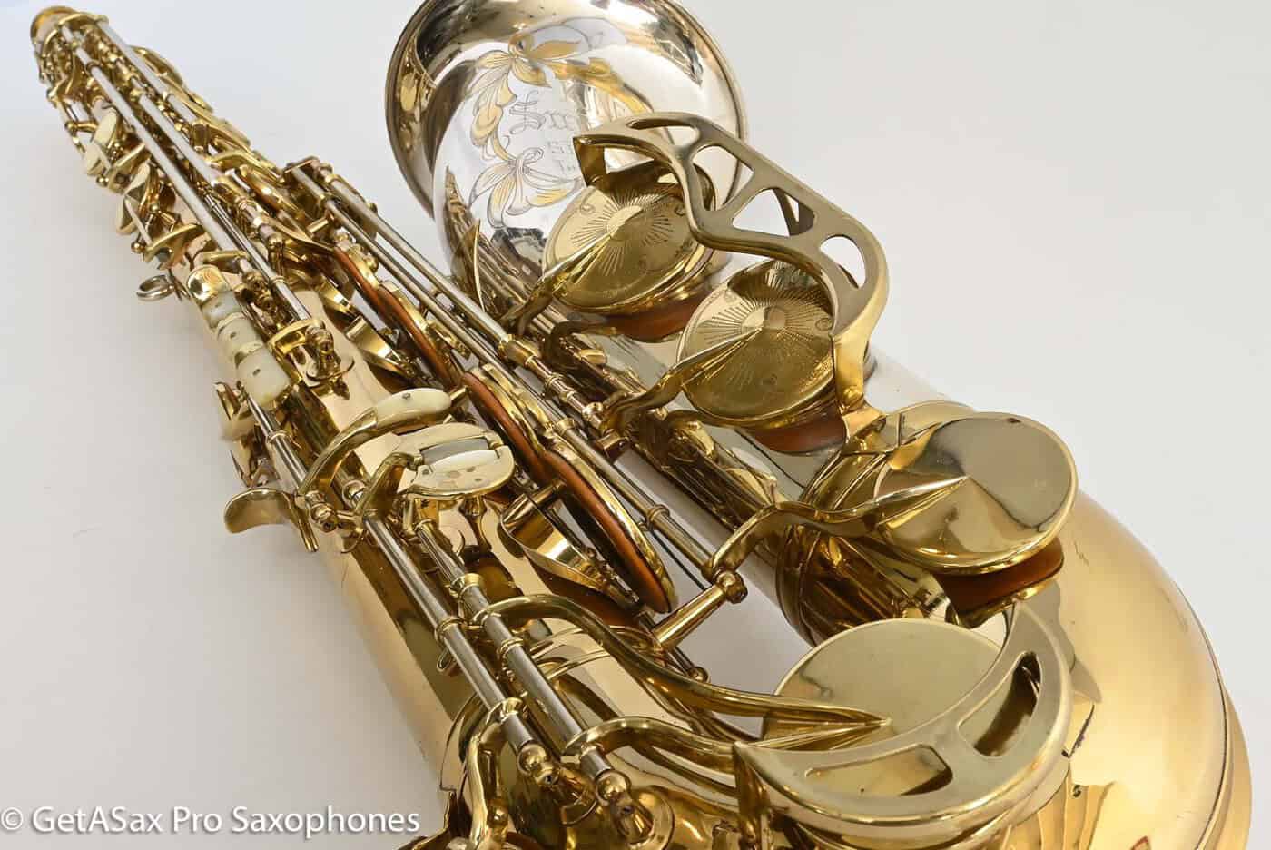 These horns are kind of the ultimate saxophone collectible because they have both qualities that usually are mutually exclusive – they’re the best version of the Super 20 that King made, and they’re also ridiculously rare at the same time. In the early 50’s King was focused on selling brass bell Super 20 saxophones, and it seems you had to know somebody to get them to make you a SilverSonic, so it rarely happened. I don’t know of any other example of a saxophone that is the best of its class and similarly rare. The Conn saxophones in F are rare and are fun to play, but they’re not like THE best saxophone Conn ever made (that would be the rolled tone holes 10M/30M). The Mark VI C melody is similarly rare, but also not the best C melody ever made, nor particularly outstanding just in itself. But these Series II King Full Pearls Silversonics should please the person who wants both a really rare, collectible investment sort of saxophone, and the person who wants a great playing horn. Anyway, to get back to this horn, it has the original case in nice shape, and the original solid silver neck with matching serial number, also in excellent condition. I would keep this one if I could afford to!
