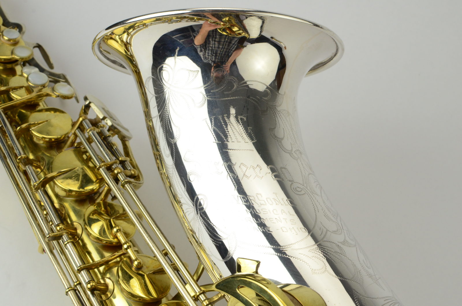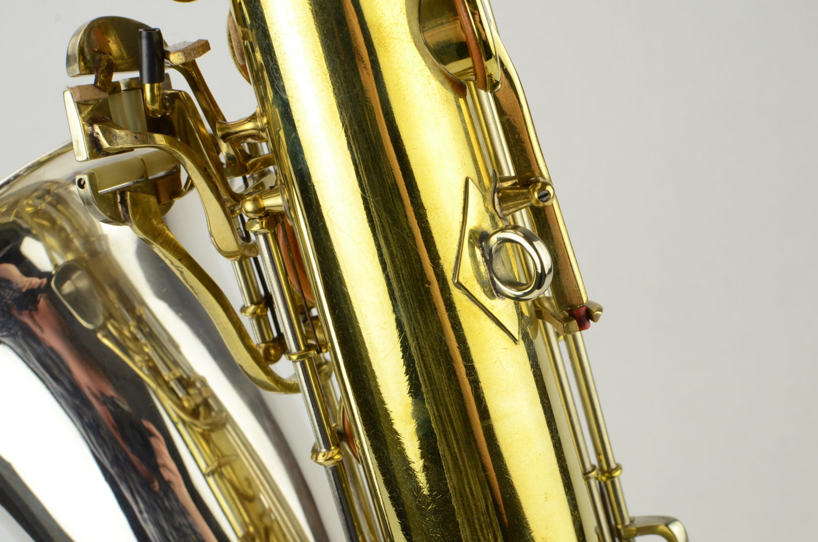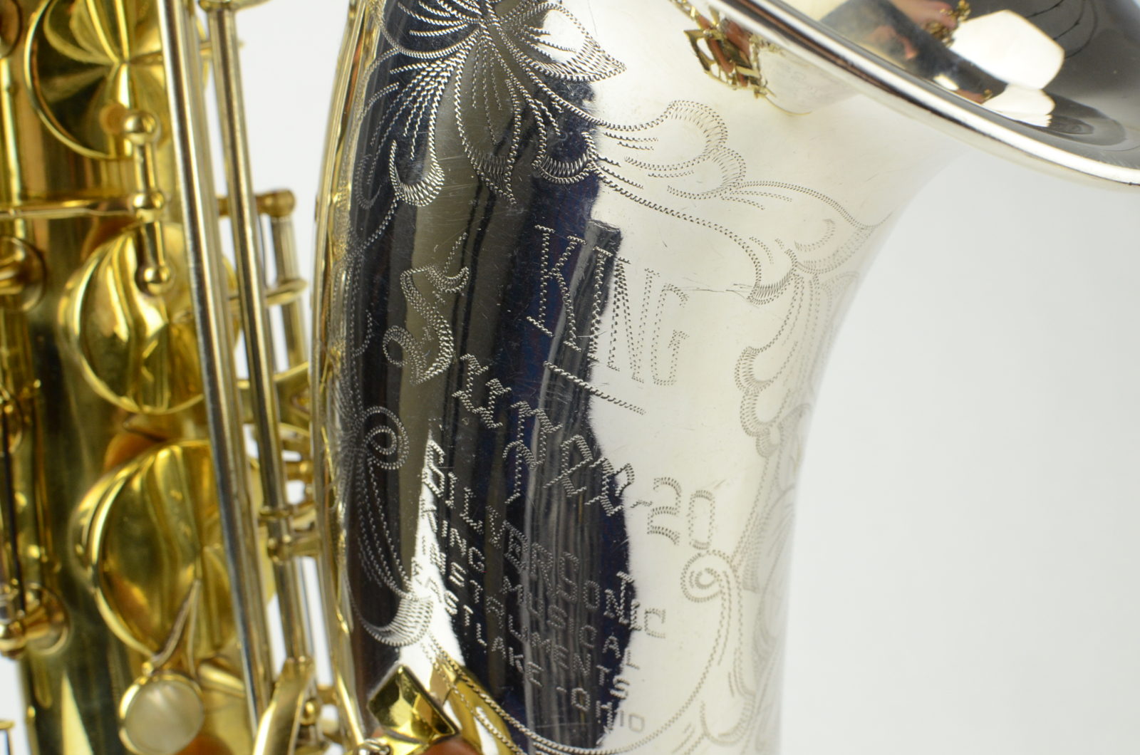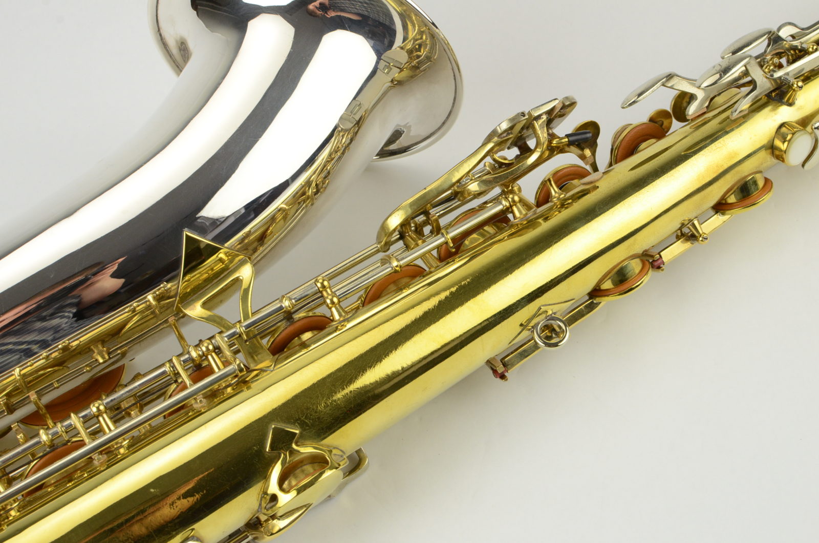 This is a great deal on a King SilverSonic Tenor that is beautiful, has a fresh, full overhaul, and is a superb player. It is loud and projecting. This horn was original lacquer when I got it, at about 75%, and I had the lacquer stripped and the horn gently hand polished when it was overhauled to remove the dirt and tarnish. It cleaned up great! It's now bare brass and silver, and it has all new everything: a complete restoration consisting of mechanical work, new pads, corks, felts, everything leveled and properly setup. This horn is now ready to go for many years to come, and it is in better than new playing condition. It feels great under the fingers and has medium-sized flat metal resonators on leather pads.