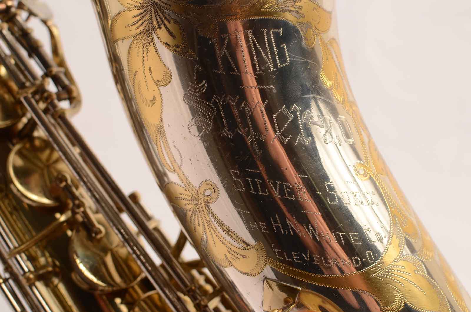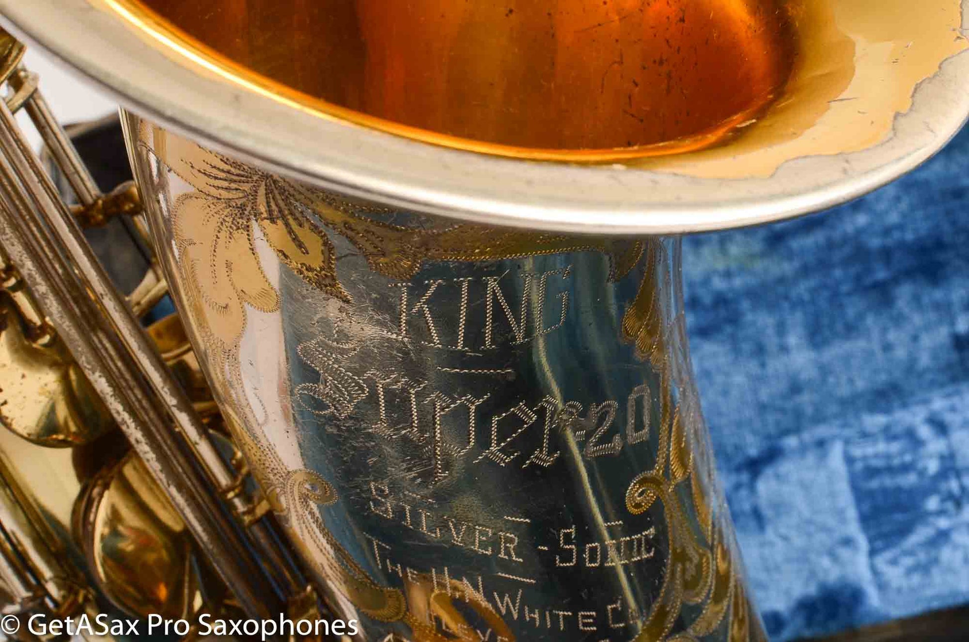 Here is a freshly overhauled King Super 20 SilverSonic (solid sterling neck and bell with gold inlay engraving) in excellent shape with a *monstrous* sound. The overhaul is extremely clean and well done, and sports high-end reusable Tenor Madness resonators. The action is quick and light and smooth and feels absolutely fantastic under the fingers. Even the left hand pinky table, which can be challenging for some repairers to get right, is light and snappy as it was designed to be. Seriously, hand this horn to the guy next to you on the bandstand just to let him feel it for a sec if you want to ruin his day.