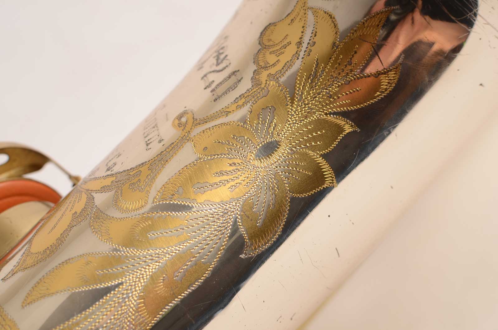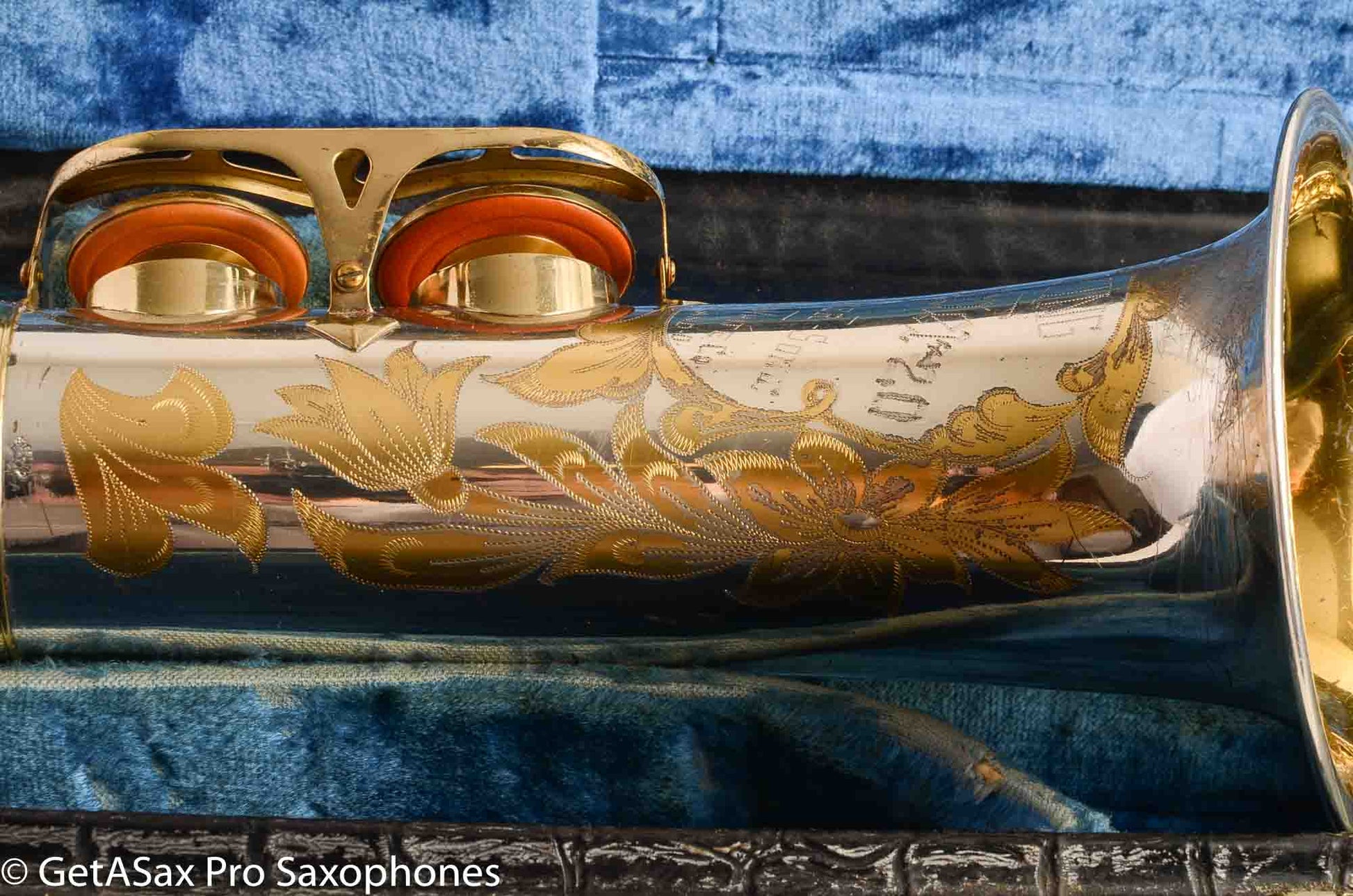 Physically, this sax is in great condition as well. The lacquer is original and has signs of honest wear, but there are no signs of any major or even minor damage or resolders, past or present. The body is straight and the keys are all tight with no lost motion. Owner's name lightly engraved on bottom of bell. Could be removed if you wanted to, but it is not noticeable. SilverSonics like this with the gold in the engraving on the silver bell are few and far between, and this one is bona fide Great.
