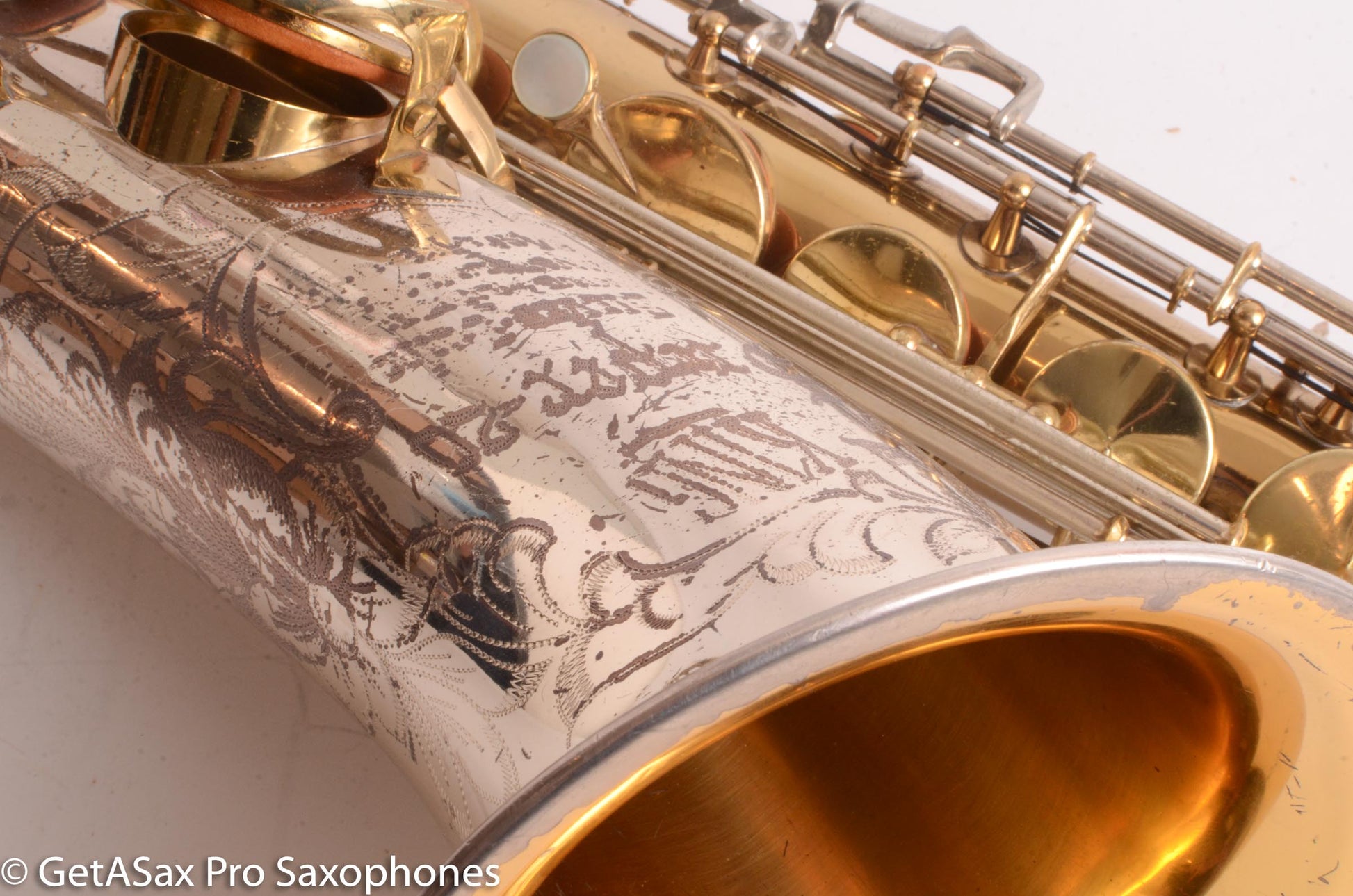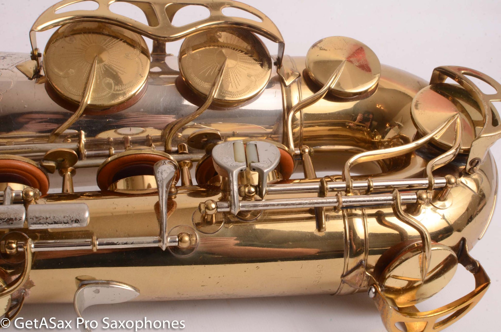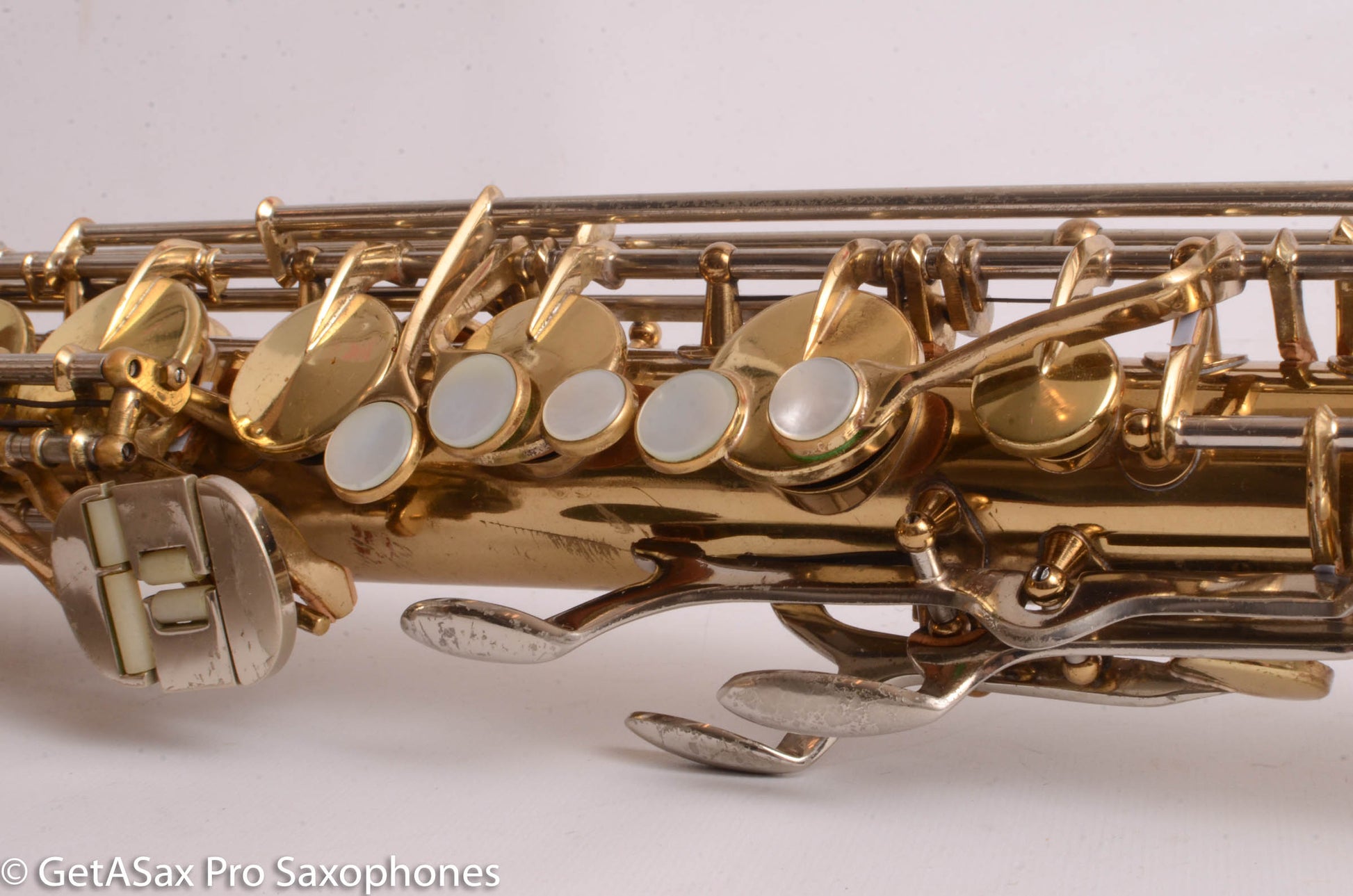 This is a very early original lacquer Eastlake King Super 20 SilverSonic tenor saxophone with solid silver neck and solid silver bell. It plays reasonably well on older pads and comes with the original case in good condition. Many players love the early Eastlakes for their huge, powerful tone and comfortable keywork. They’re also priced a lot lower than a typical Cleveland SilverSonic (despite the early Eastlakes being the exact same horn). If you want to get into a beautiful vintage professional King Silversonic tenor that doesn’t break the bank, this would be an excellent option.
