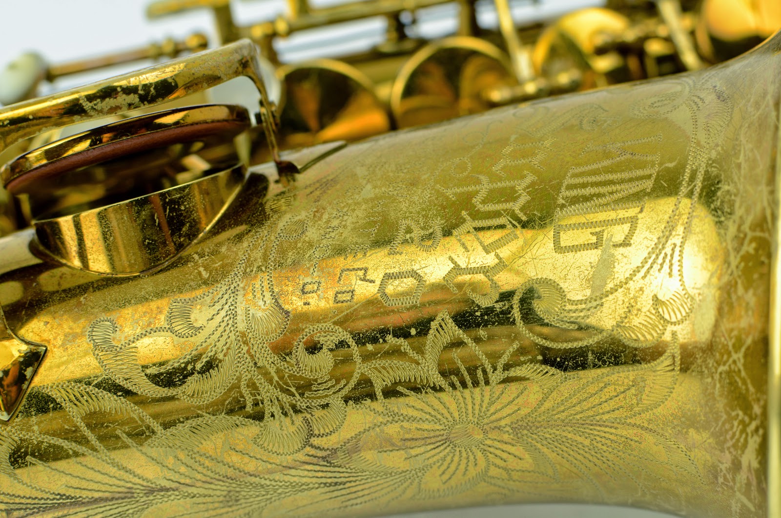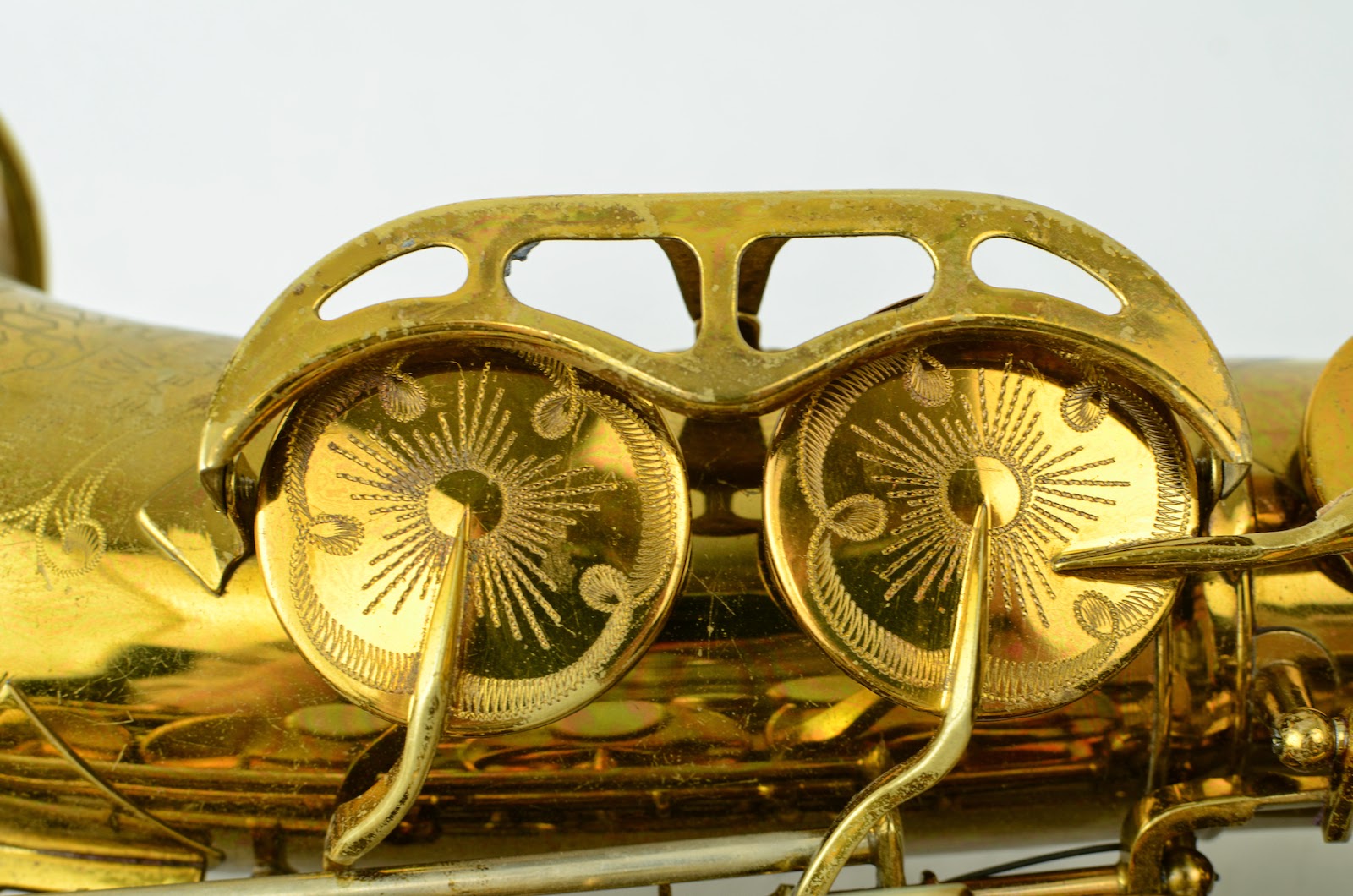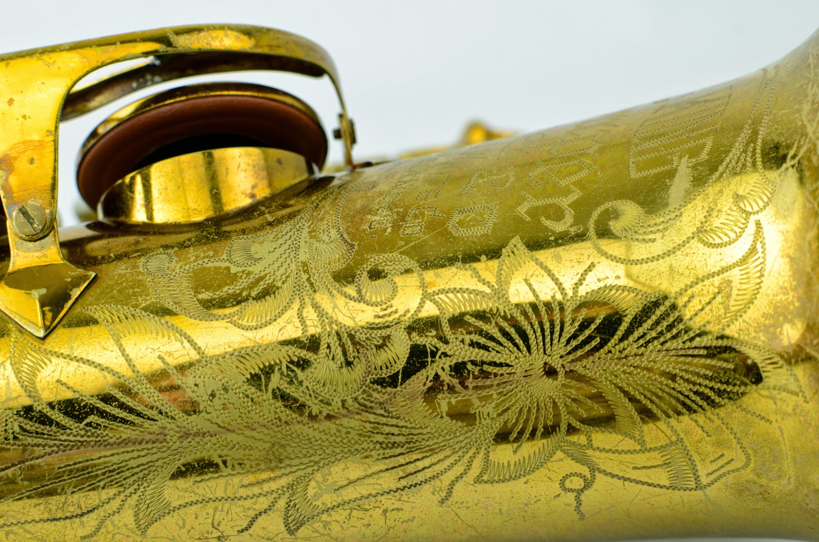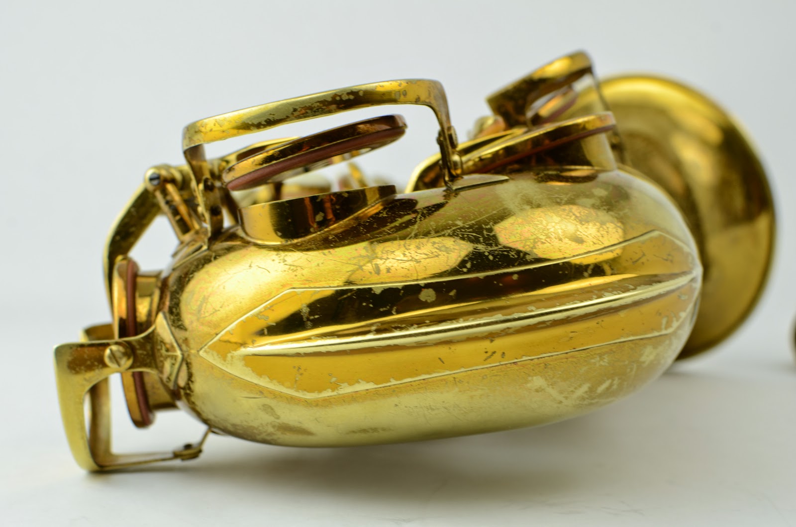 This horn is very clean mechanically, with only some light lacquer wear to speak of. The color is gorgeous. I need to do new photos in natural light because it actually looks way better than this! The neck serial matches the body, and the double socket is in good shape. The neck is in excellent condition and is not pulled down. The pearls are also nice and sharp, and not worn down. The pants guard on the back is an exact copy of an original one and will match the horn as it starts to get a bit of pants wear on it. Or you could give it a bit of lacquer wear yourself if you want to, and it would be literally impossible to tell that it's not the original part!