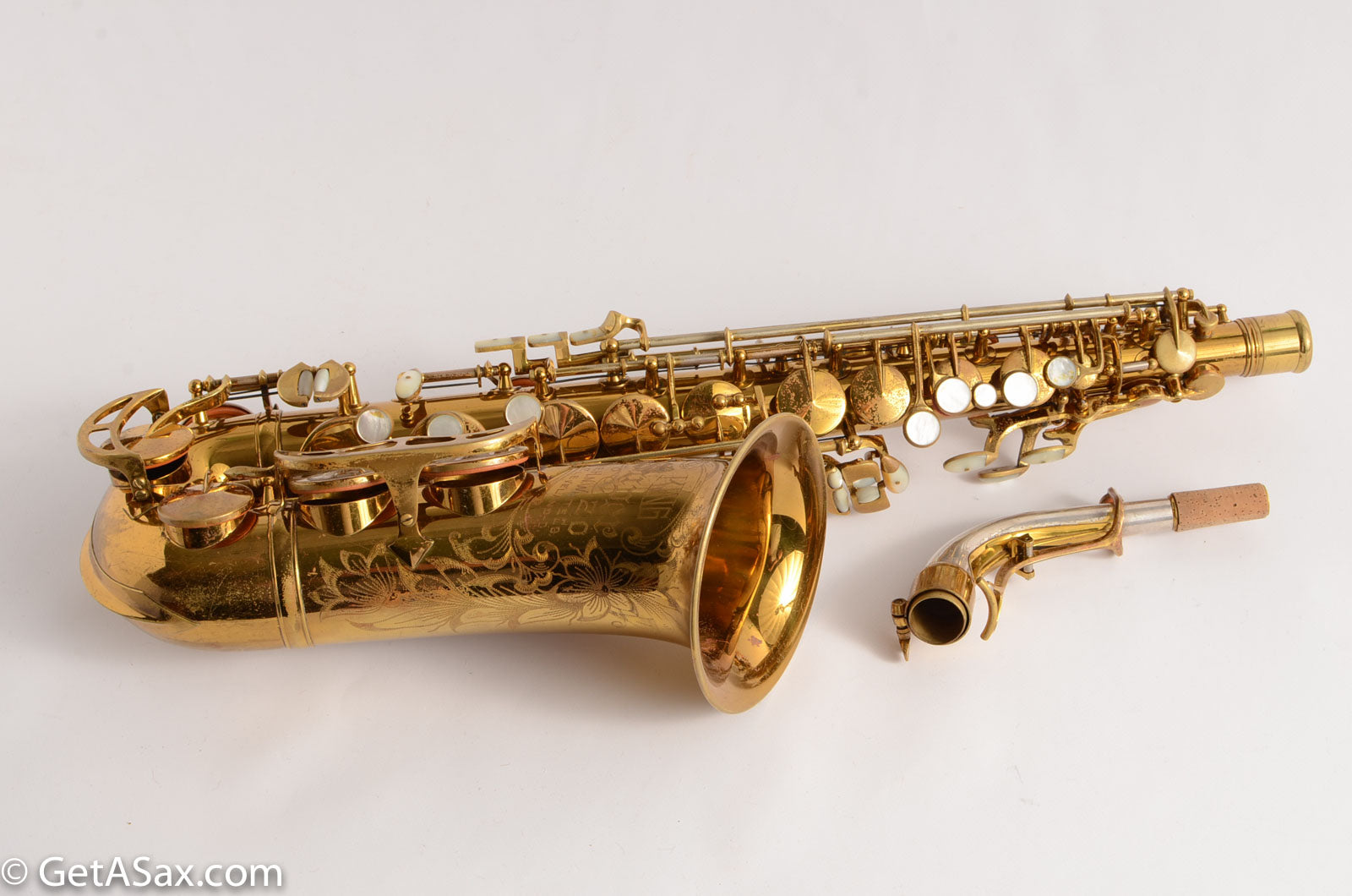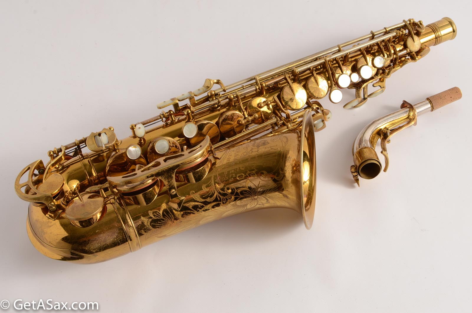 Beautiful original lacquer King Super 20 Alto. Cannonball Adderley's full pearls 323xxx alto was right near this one in serial number. This one has the most desirable combination of features with the more comfortable pinky keys together with the extra pearls on the side keys, G#, and octave key, extra engraving on key cups, and solid silver, double-socket neck. It had some small dents removed from the back of the bow, but it looks good now. The rest of the horn is nice and clean. There are no resolders except for the low Eb keyguard (which is common and not serious) The neck, body tube and bell are all in clean, undamaged, original condition. The neck on this horn is beautiful, double-socket looks good, and it has the matching serial number to the body.