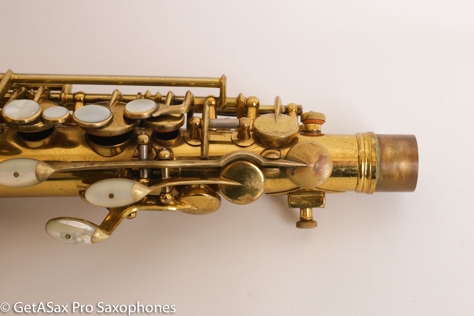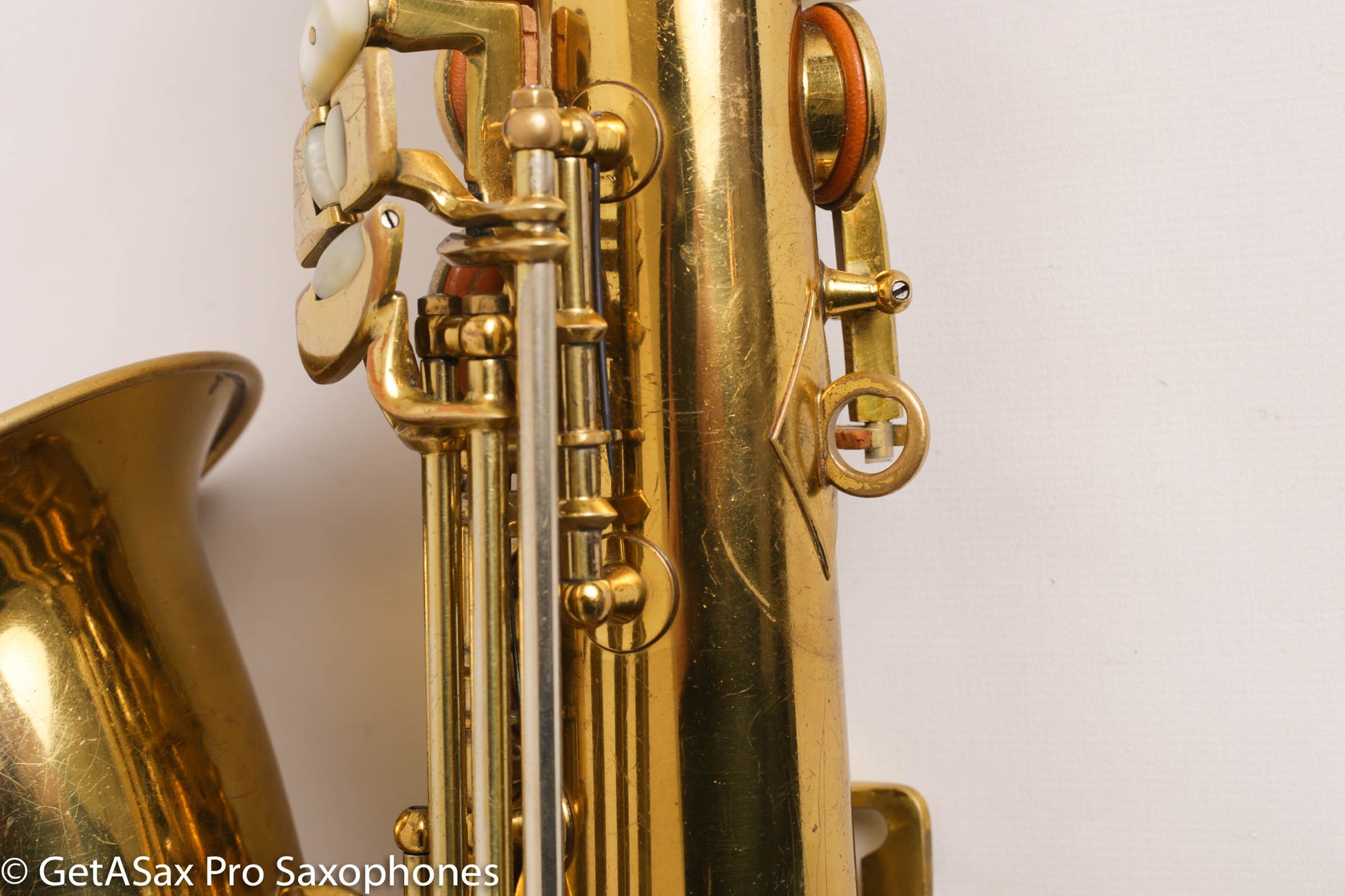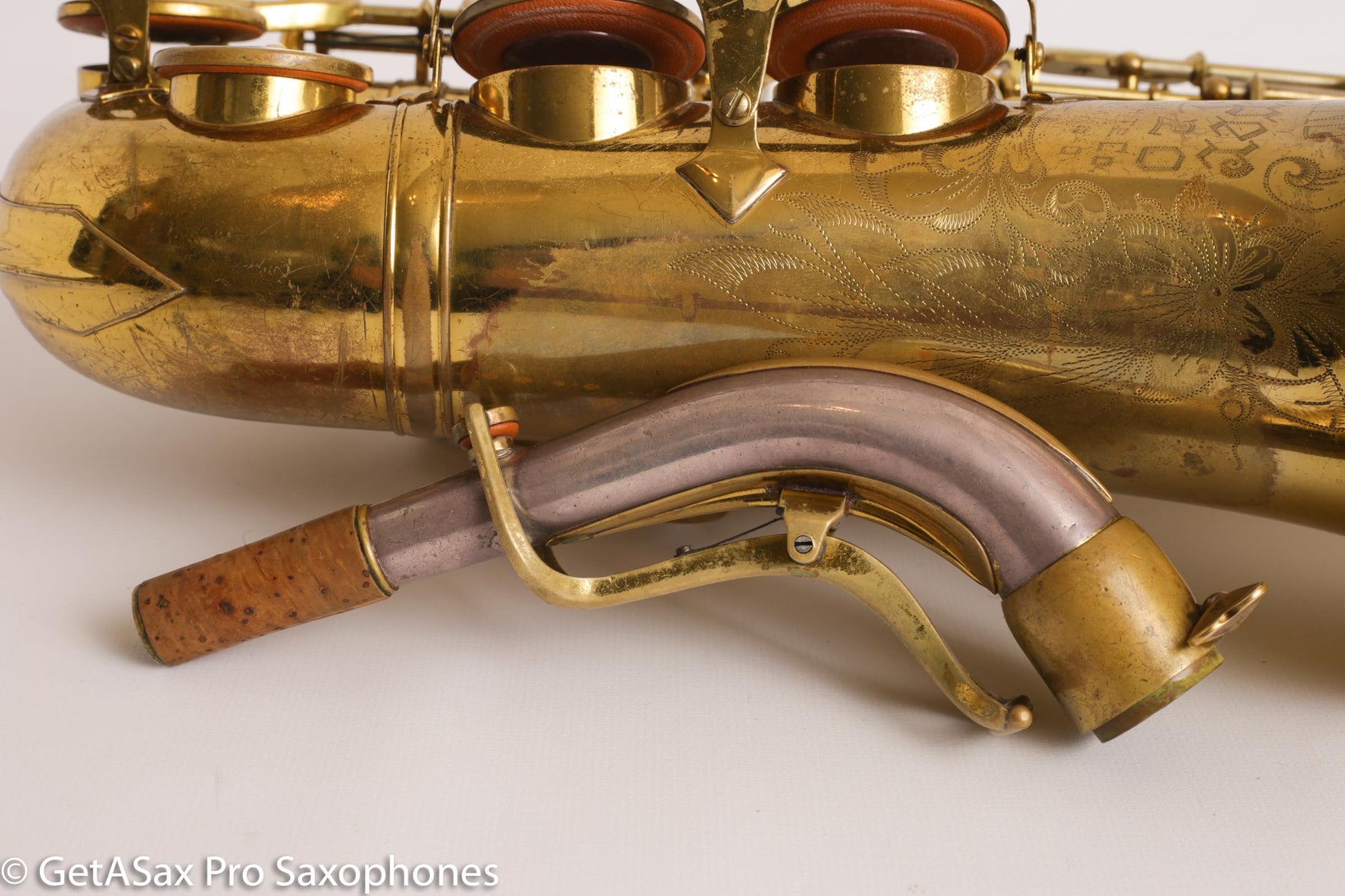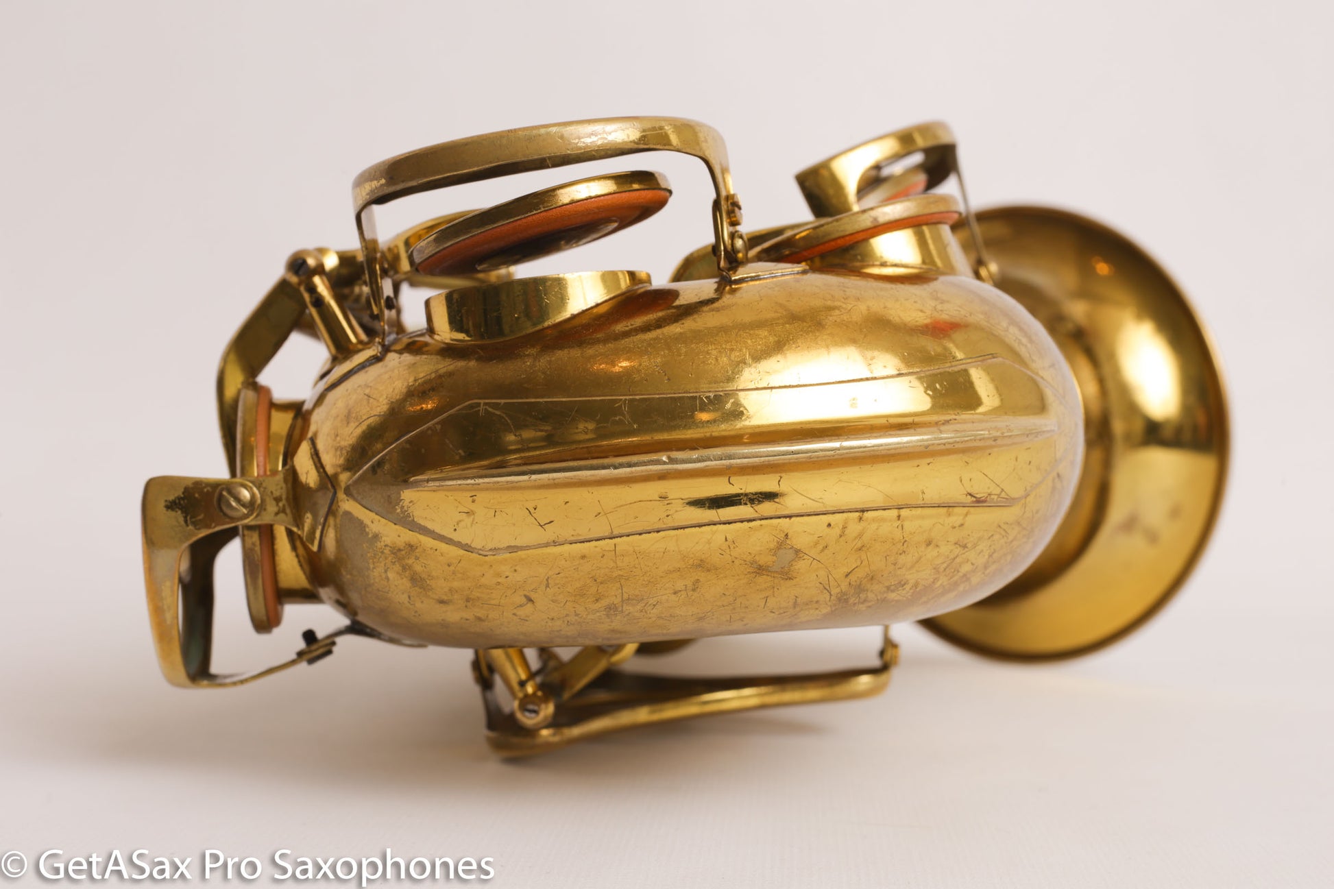 Ah, in my enthusiasm, I almost forgot to list past repairs – this alto has been played professionally by a superb local alto player, who is only selling it because he has to for financial reasons. It had some key guard feet slightly pushed in and some dings on the back of the bow when I got it, and those are now gone, leaving little trace. No major repairs, and no current repair issues. The pads are medium through their usable life, and I wouldn’t overhaul this anytime soon. It currently absolutely roasts on the current setup.