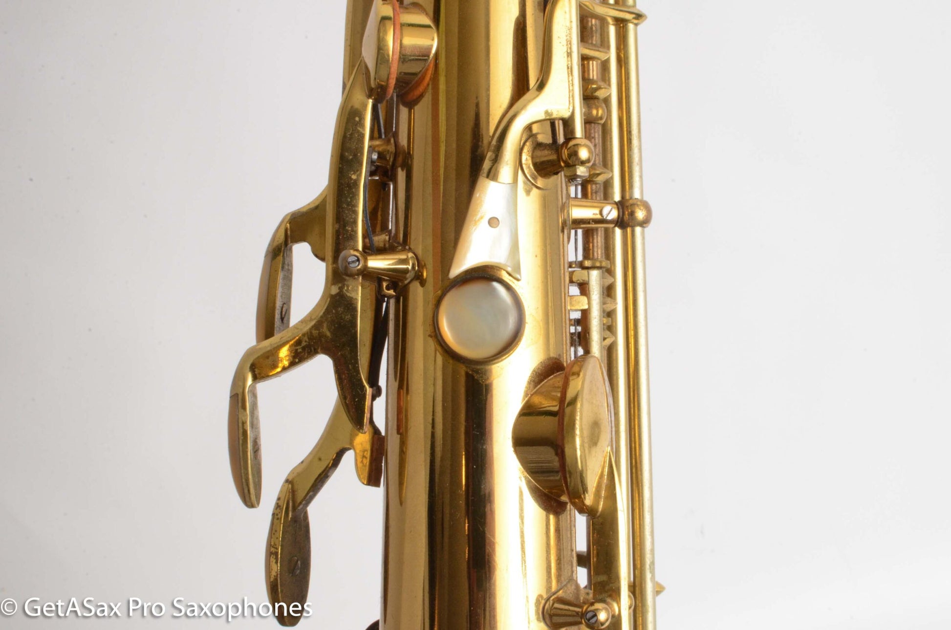 This is one of the nicest original condition King Super 20 tenors with full pearls that I’ve seen. This is the ‘series II’ version which has the best combination of keywork and deluxe features and is the most desirable vintage of King in most people’s book. The solid silver double-socket neck still has the factory gold lacquer over the silver, and the factory pads and setup are still intact. This horn needs an overhaul to play well. It has pads from 1953 after all. You won’t find a nicer example for sale anywhere. Even the original case is still in quite good shape. Everything about these horns says premium. I play one just like this myself.