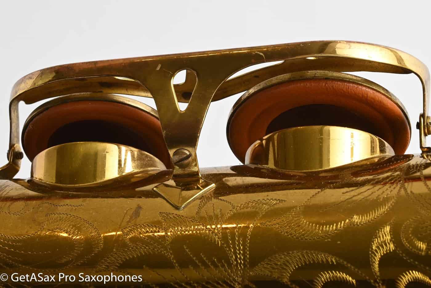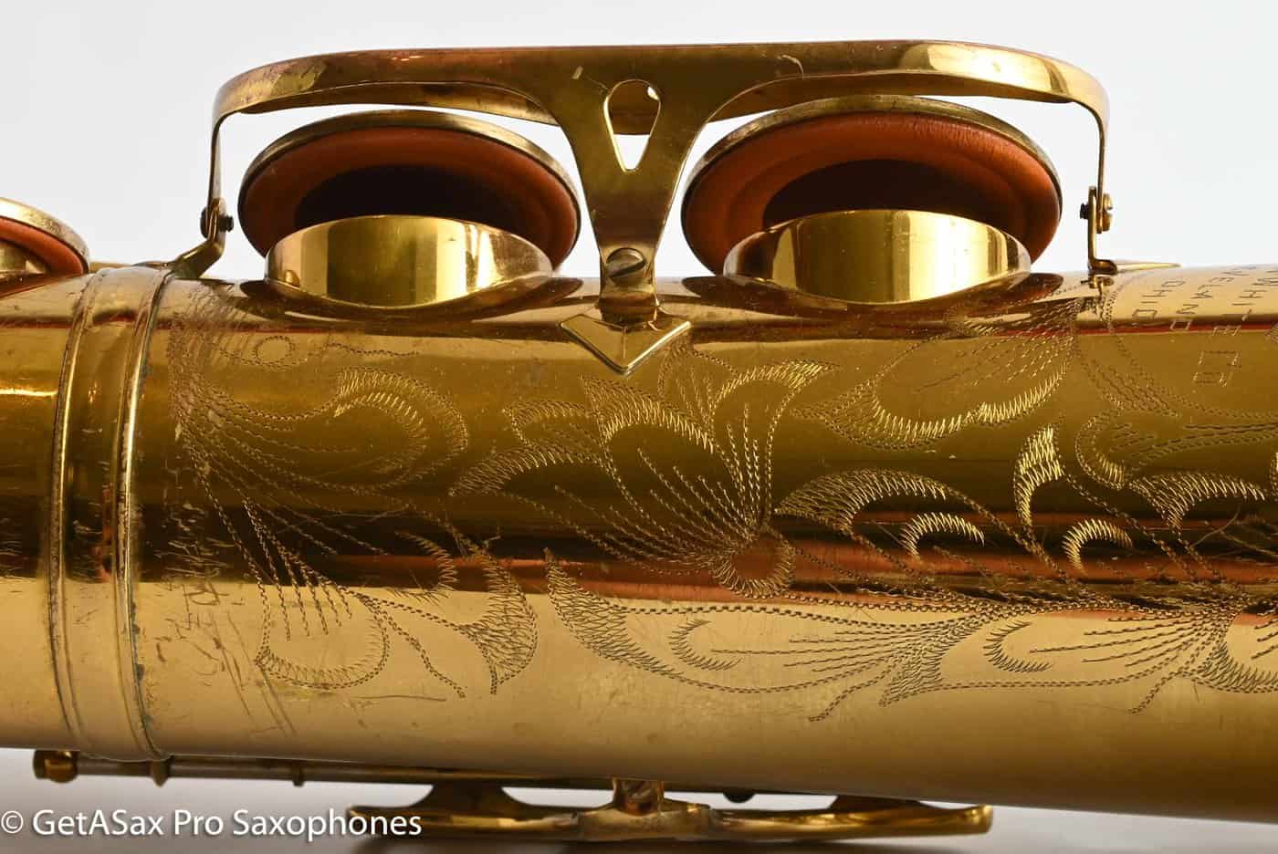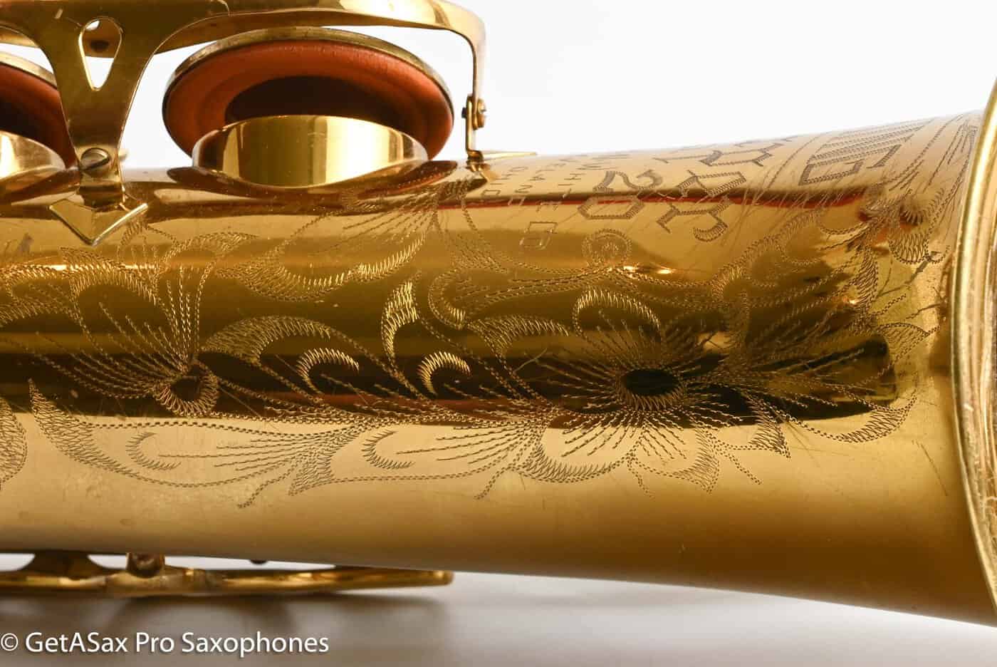 This gorgeous original lacquer King Super 20 tenor from 1948 is in beautiful shape. This is the same vintage as Charlie Parker’s King Super 20 Alto, and Charlie Ventura’s tenor. In 1948, King was at the height of its powers and making some of the best saxophones that have ever been made. This one is in very good condition with nearly all of its original lacquer intact and no dents or dings. it has almost all the original gold lacquer over the solid silver neck (with matching serial number). To me, the Super 20’s that have the lacquer over the silver neck are the most desirable as collectors horns as well, since it is much rarer to find one with the neck lacquer intact — people always polish it off and shine up the silver. There have been some dings removed from the back of the body tube and bow here and there where you see a little smudge in the lacquer, and there are some stand scratches on the bell. The pads are old, so it’s time for an overhaul, but I prefer to buy them in clean original condition myself anyway, and then get them overhauled how I like. The price is great for a horn like this, so you can overhaul it and still be in good shape price wise. There’s almost no saxophone that brings together all the factors of desirability like one of these early ‘full pearls’ King Super 20’s. You’ve got a HUGE – absolutely enormous – tone. It’s powerful and medium dark, but cuts through a band with ease. Brightens up a lot when pushed or with a bright mouthpiece. You get the full pearls everywhere, engraved bell keys, solid silver neck, and the gorgeous original lacquer. It’s the total package!