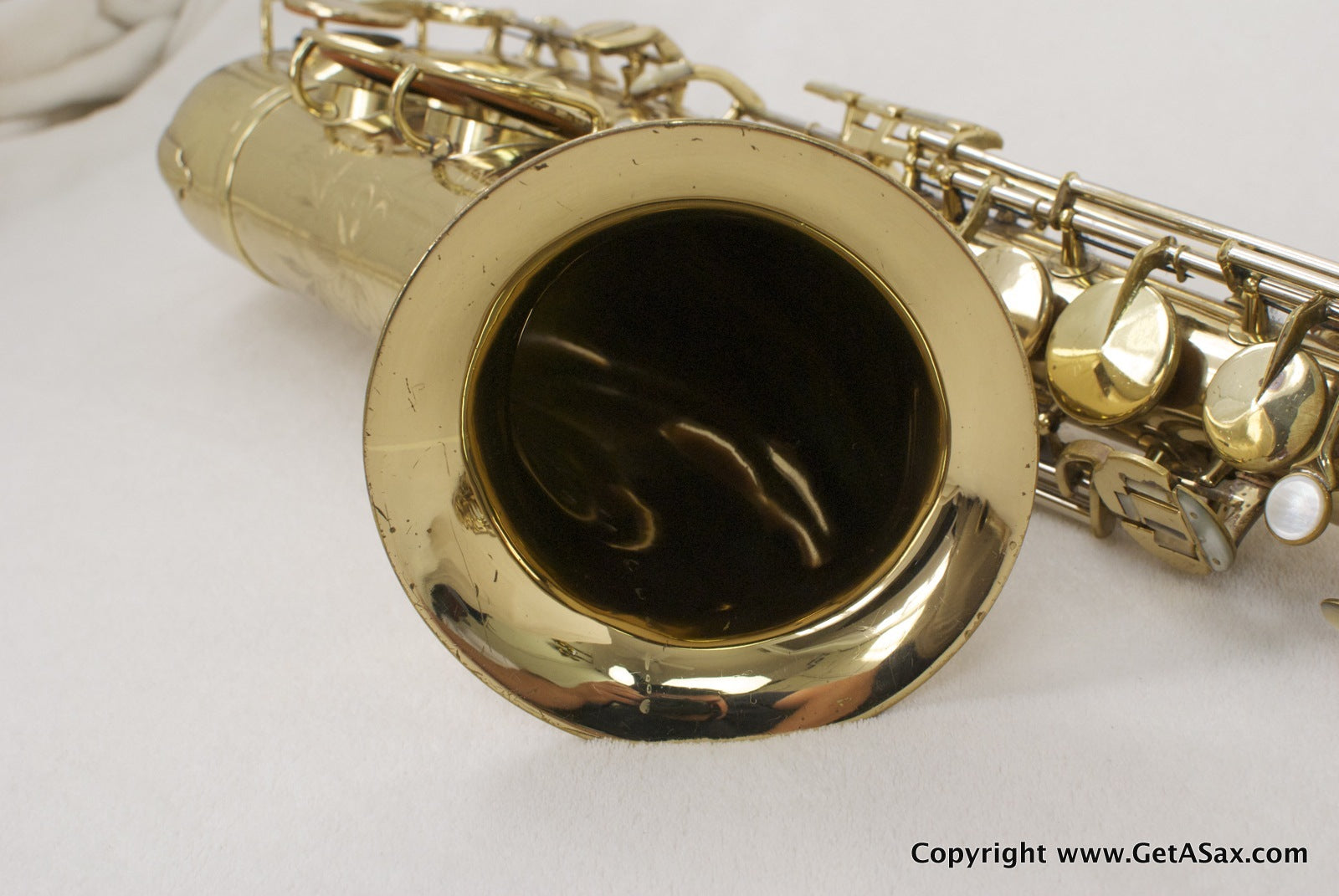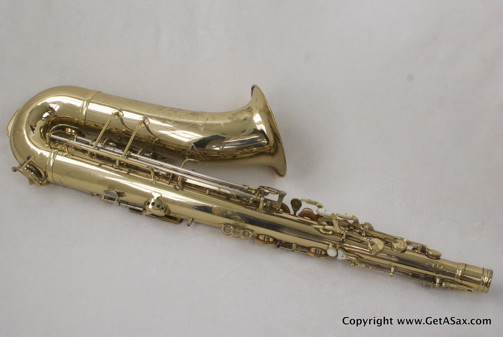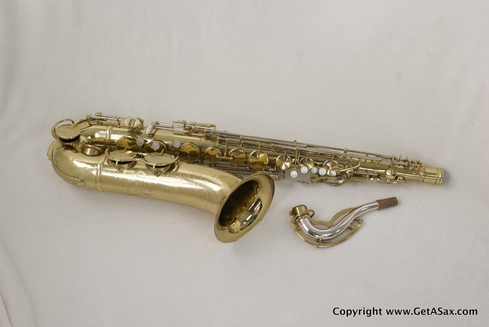 The Zephyr Special is a great vintage pro tenor make by the King company. This horn has a solid silver neck and the desirable extra pearls on the side keys and G#. It has been relacquered, and it looks like a recent job to me, based on the light color of the epoxy lacquer. The engraving is still sharp, even on the fine lines on the engraved bell keys, and there is no evidence of heavy buffing, so the job was done well. You can see a bit of waviness to the brass in the back of the bow and body in a couple of spots, so some dents or dings have been removed from that area. The original neck (matching serial number) looks great with no evidence of past damage. Pads are medium between new and old. The horn plays well and has lots of power, but the pads feel kind of squishy.