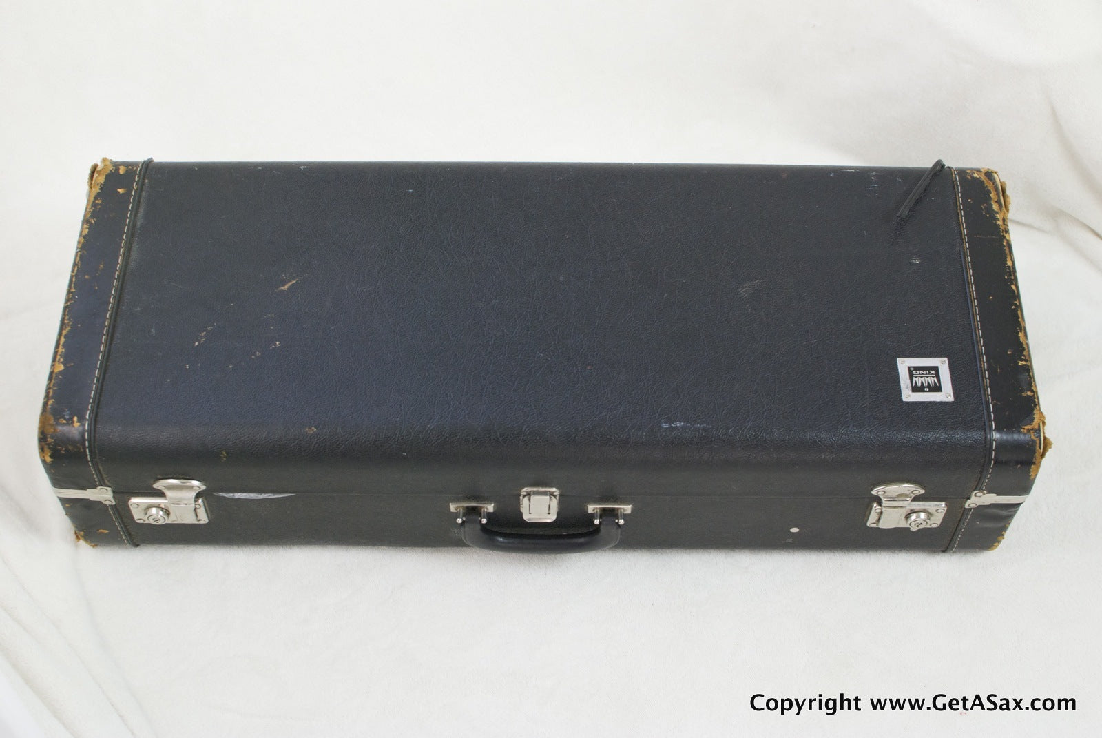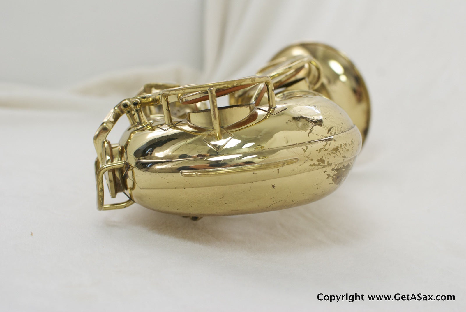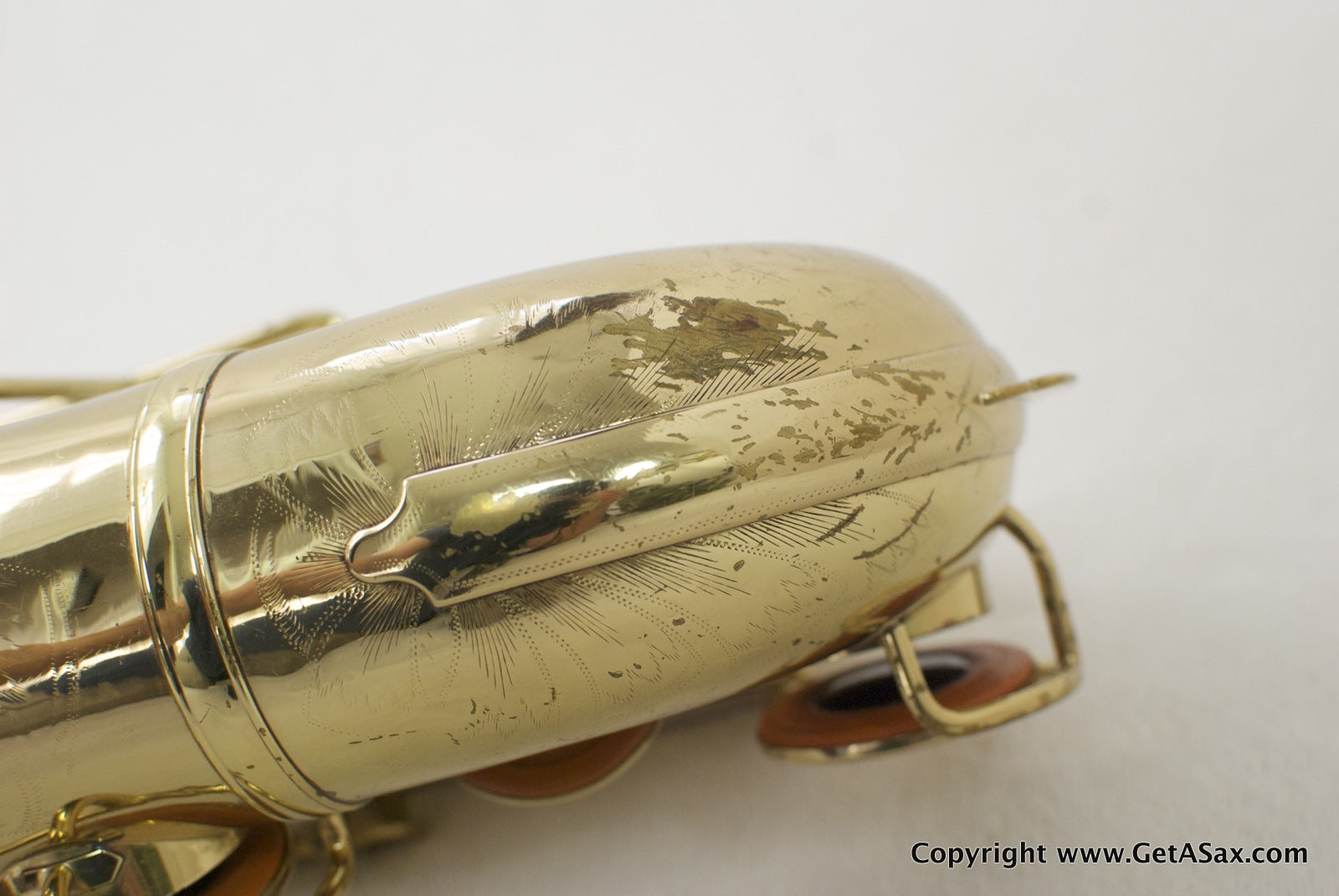 The Zephyr Special is a great vintage pro tenor make by the King company. This horn has a solid silver neck and the desirable extra pearls on the side keys and G#. It has been relacquered, and it looks like a recent job to me, based on the light color of the epoxy lacquer. The engraving is still sharp, even on the fine lines on the engraved bell keys, and there is no evidence of heavy buffing, so the job was done well. You can see a bit of waviness to the brass in the back of the bow and body in a couple of spots, so some dents or dings have been removed from that area. The original neck (matching serial number) looks great with no evidence of past damage. Pads are medium between new and old. The horn plays well and has lots of power, but the pads feel kind of squishy.