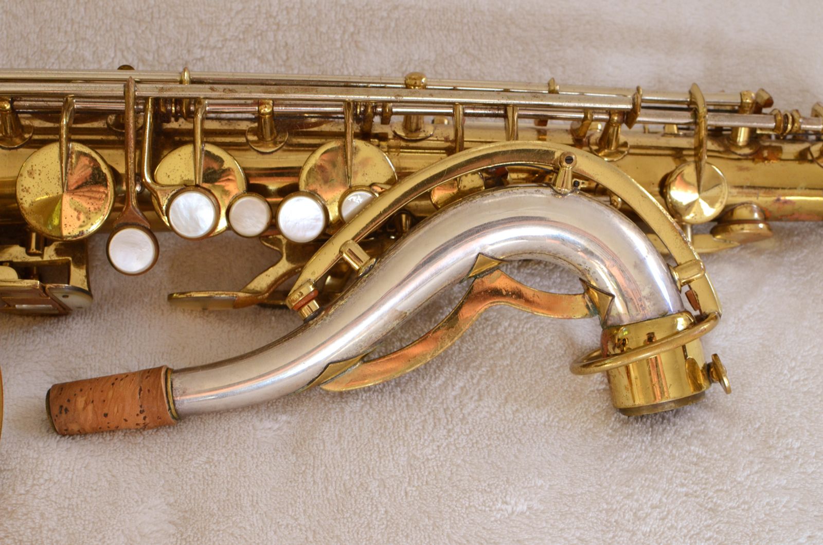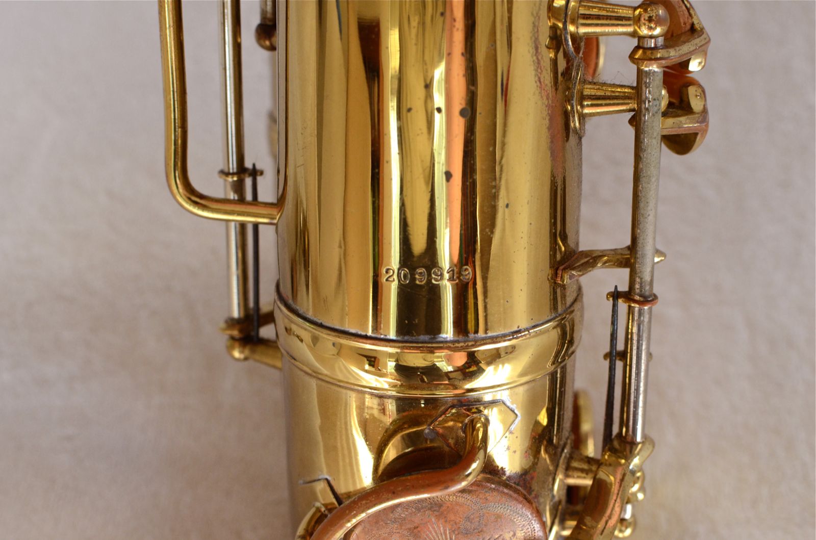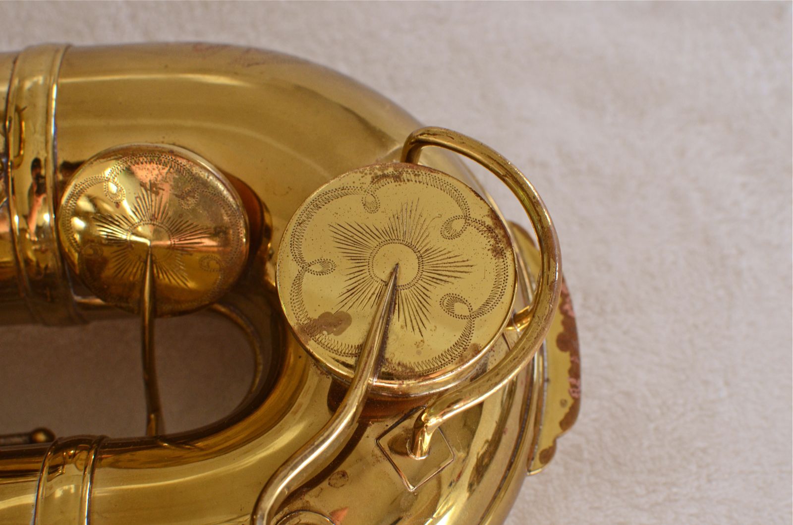 This beautiful Zephyr Special was made in 1937, which is the first year that these horns were made, and it is a beautiful example as well! It's rare to find any saxophone that looks this good after 75 years, and finding such a rare and desirable one is really special. This horn has no dents or dings, and looks gorgeous with full pearls on palm and side keys and G#. Most people would sell this horn as original lacquer, because it looks really really good, and the engraving could hardly look any better. However, the color of the vintage lacquer is usually a little darker on these horns, and there's just a hint of fading in some of the fine engraving on the front of the bow that is a telltale sign of the horn having been relacquered very carefully at some point a long time ago. This horn has the solid silver, double-socket neck and the desirable three ring strap hook that would show up on the Super 20 a bit later. Compared to a full pearls Super 20, the Zephyr Special is darker, smokier, and more spread, but it also has tons of power and will shake the walls when pushed. It's really a great all-around vintage tenor if you're into Kings and you want something on the darker side of the spectrum. If you're going to buy a relacquered horn, this is the kind to buy - a super clean relacquer that has very little buffing and that is in superb physical condition. I don't see any signs of past dent work, and the original neck has not been pulled down. It's a deal at this price!