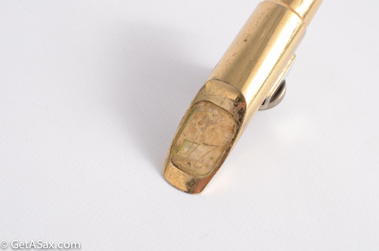 This is a vintage gold-plated Geoff Lawton alto mouthpiece that is perfect for smooth jazz alto or Rock&Roll / R&B alto where you want that brassy, screaming alto tone. The cool features of a Lawton are the large bullet chamber (so it tunes well on a range of altos, and maintains some warmth) and the carefully done high slant baffle to give you the cut and projection you want. The ligature workmanship is also satisfying. You can slide the lig around on rails and tighten it just how you want. This piece measures .084" which will give you as much volume as you need. The bite plate area is filled with a clear resin where the original bite plate fell off. It works just fine. The oval shaped are of plating on the table shows where the table is designed to accommodate your reed's natural expansion when it gets wet. This is an important feature if you are not in the habit of scraping your reeds in this are to level them because it greatly improves reed consistency and response.