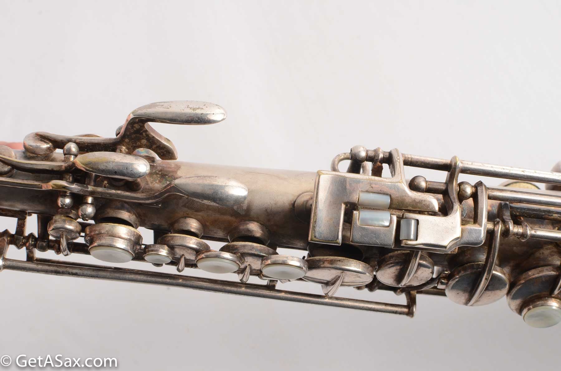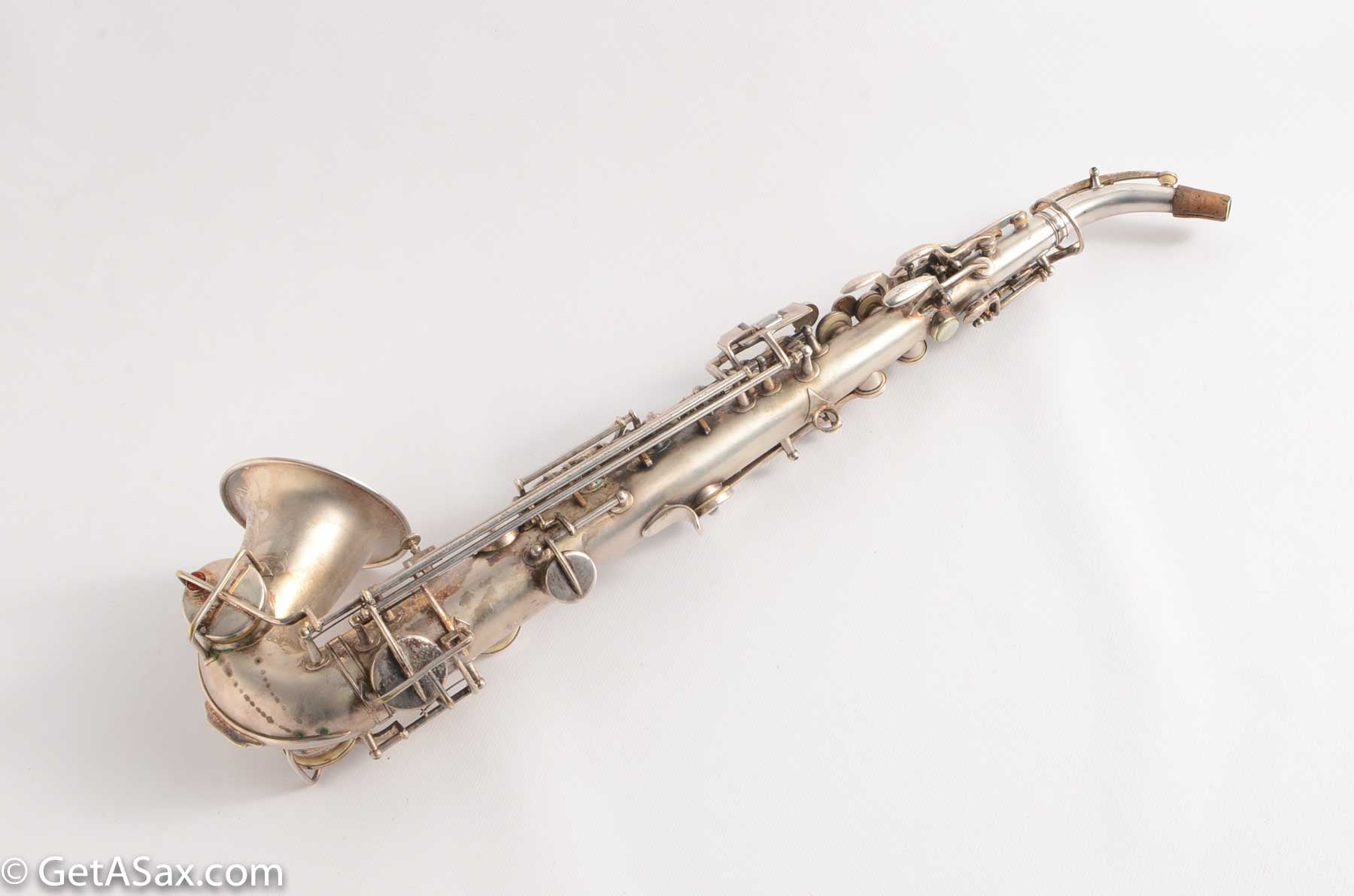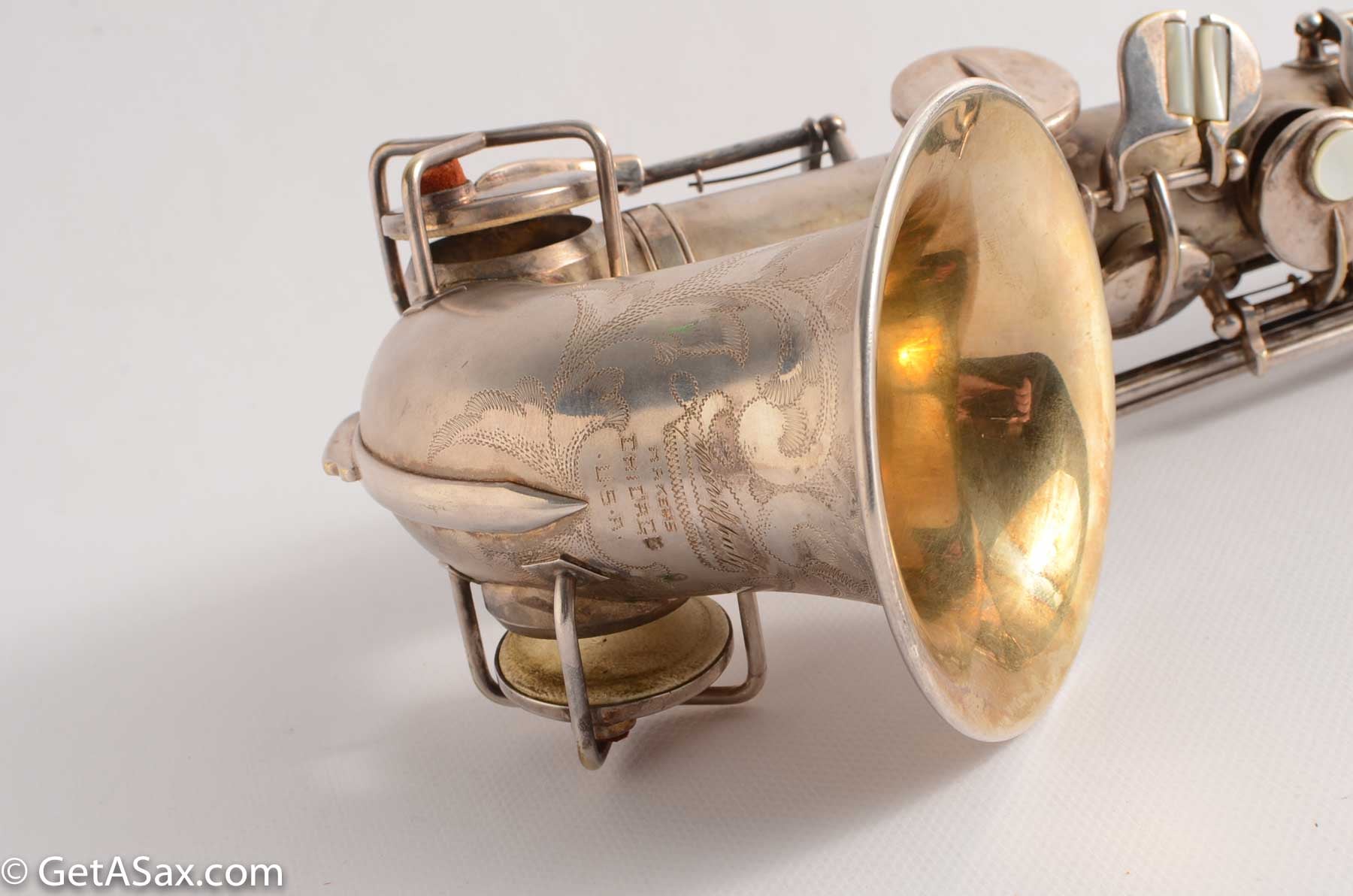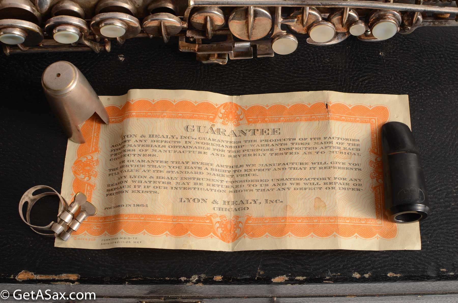 The Lyon and Healy Semi-curved soprano is a collector's treasure. Extremely rare and extremely hard-to-find, I did not expect ever to see one. And this may be the nicest one in the world. It is in near mint condition with virtually all of the original silver intact. It has all original white pads. It includes the original mouthpiece, ligature and cap. It has the original warranty card!!! There is even a Lyon and Healy paper reed case and probably the original neckstrap. The joint where the neck attaches was getting weak, so I had Matt Stohrer carefully resolder it. But he did such a good job that it is nearly invisible, and it could not have been done better. It also includes the beautiful original case with hot pink velvet lining, and the original silver-plated lyre is in there also. It would be easy to disassemble and polish this horn so that it looked brand new, but I wanted to just leave it original. For a collector, this is hard to beat.