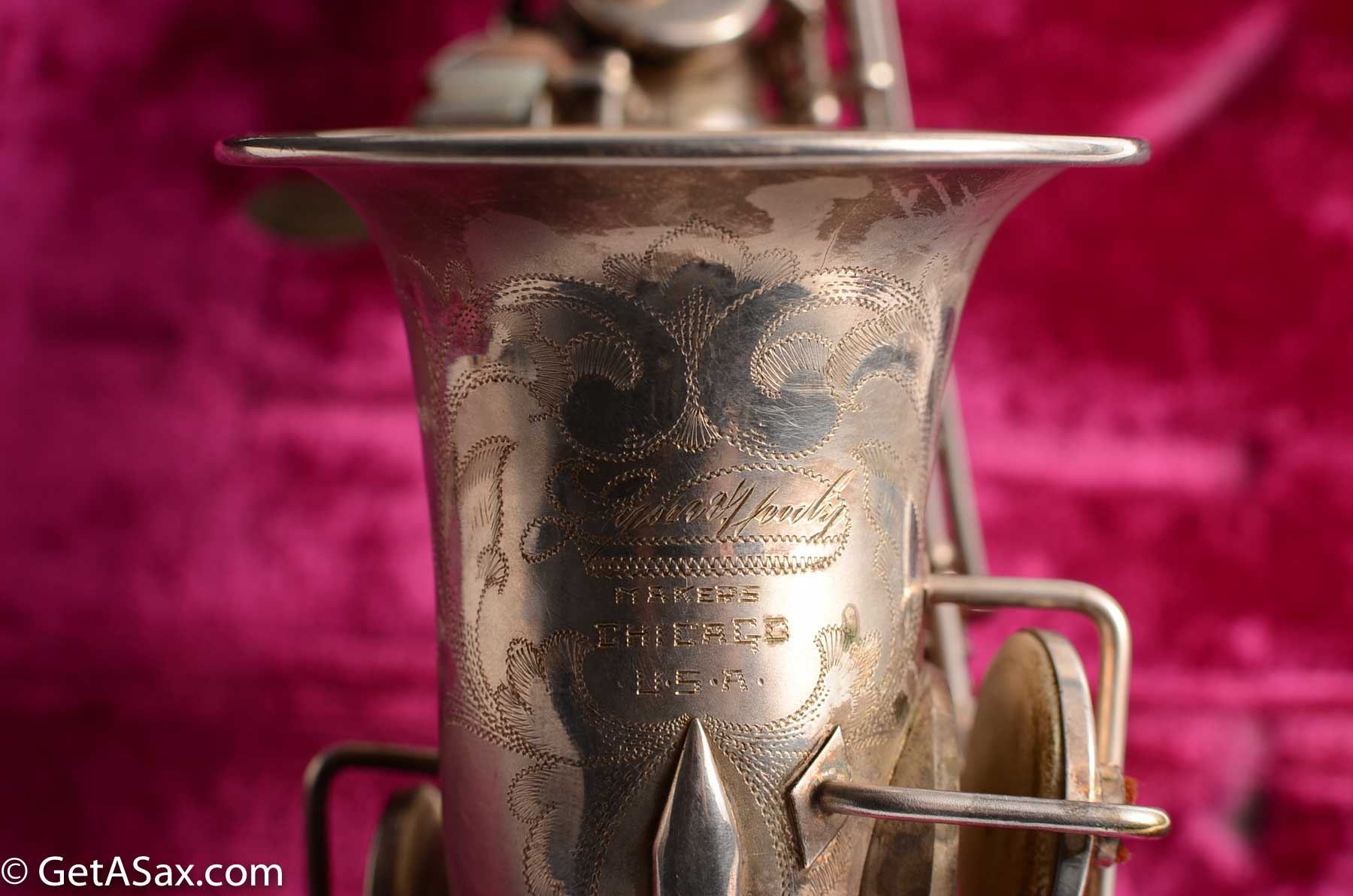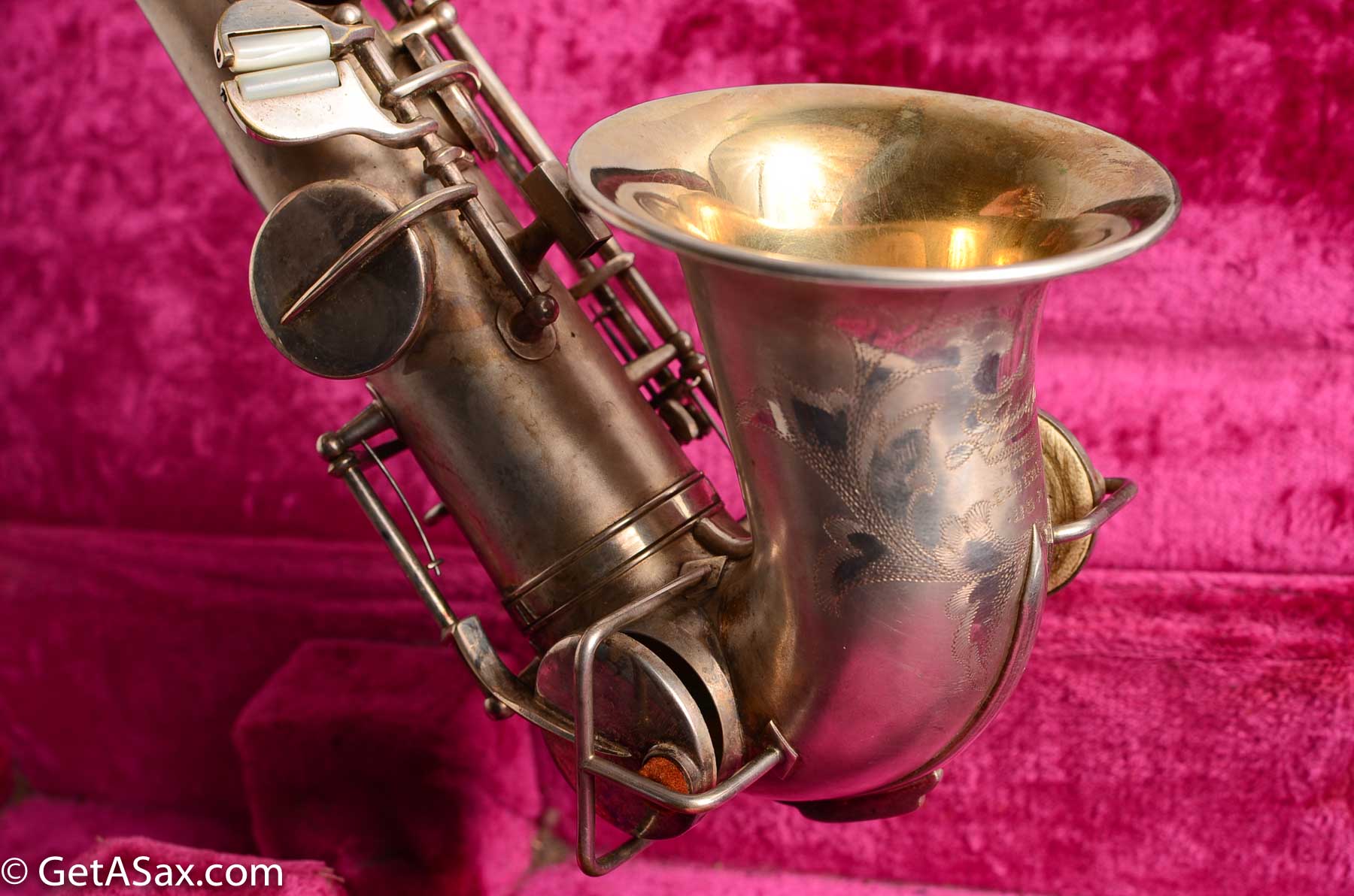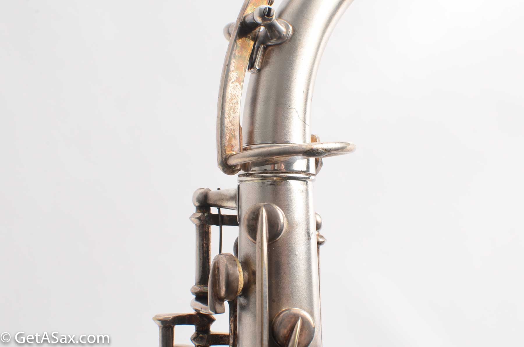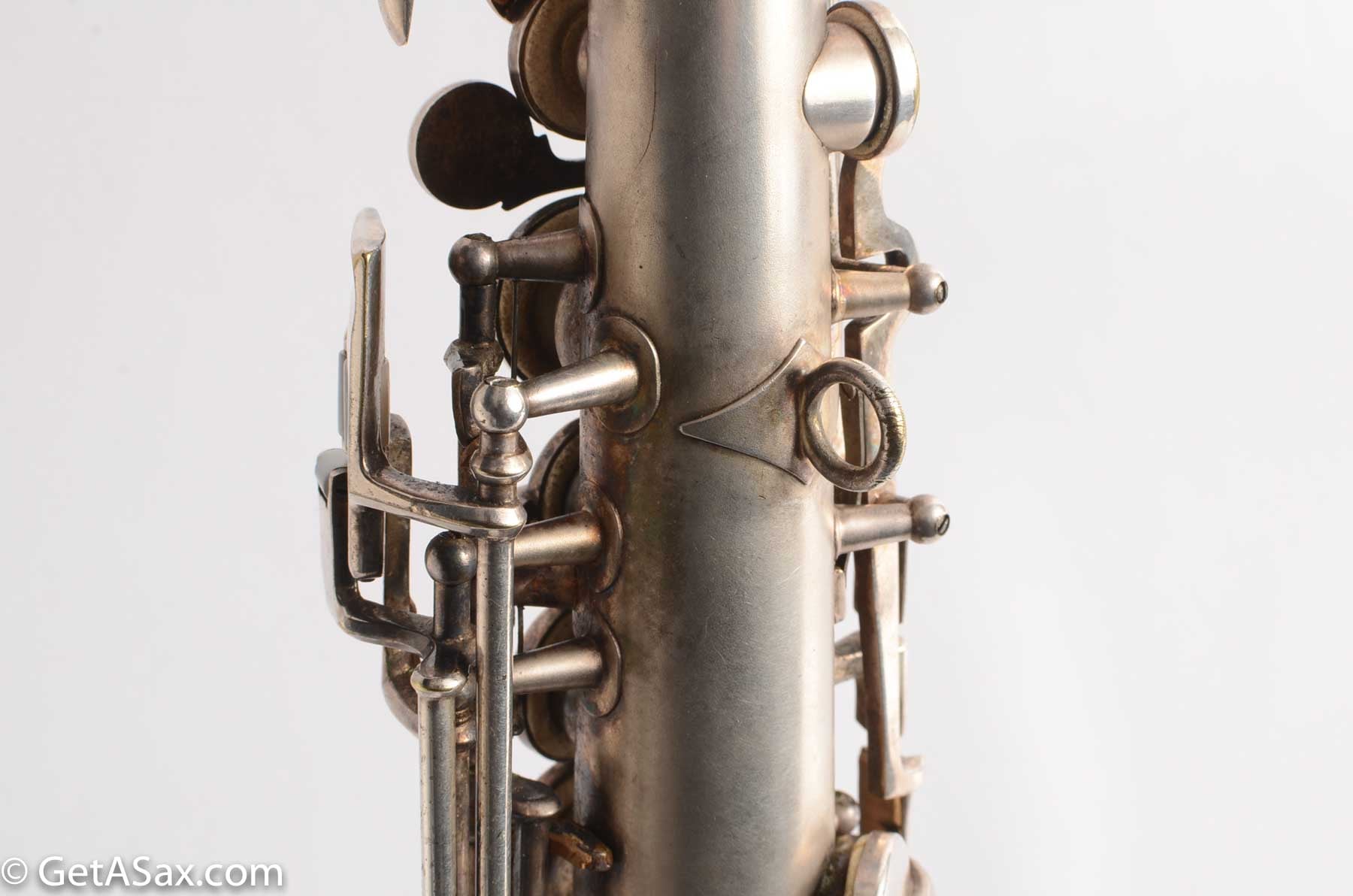 The Lyon and Healy Semi-curved soprano is a collector's treasure. Extremely rare and extremely hard-to-find, I did not expect ever to see one. And this may be the nicest one in the world. It is in near mint condition with virtually all of the original silver intact. It has all original white pads. It includes the original mouthpiece, ligature and cap. It has the original warranty card!!! There is even a Lyon and Healy paper reed case and probably the original neckstrap. The joint where the neck attaches was getting weak, so I had Matt Stohrer carefully resolder it. But he did such a good job that it is nearly invisible, and it could not have been done better. It also includes the beautiful original case with hot pink velvet lining, and the original silver-plated lyre is in there also. It would be easy to disassemble and polish this horn so that it looked brand new, but I wanted to just leave it original. For a collector, this is hard to beat.