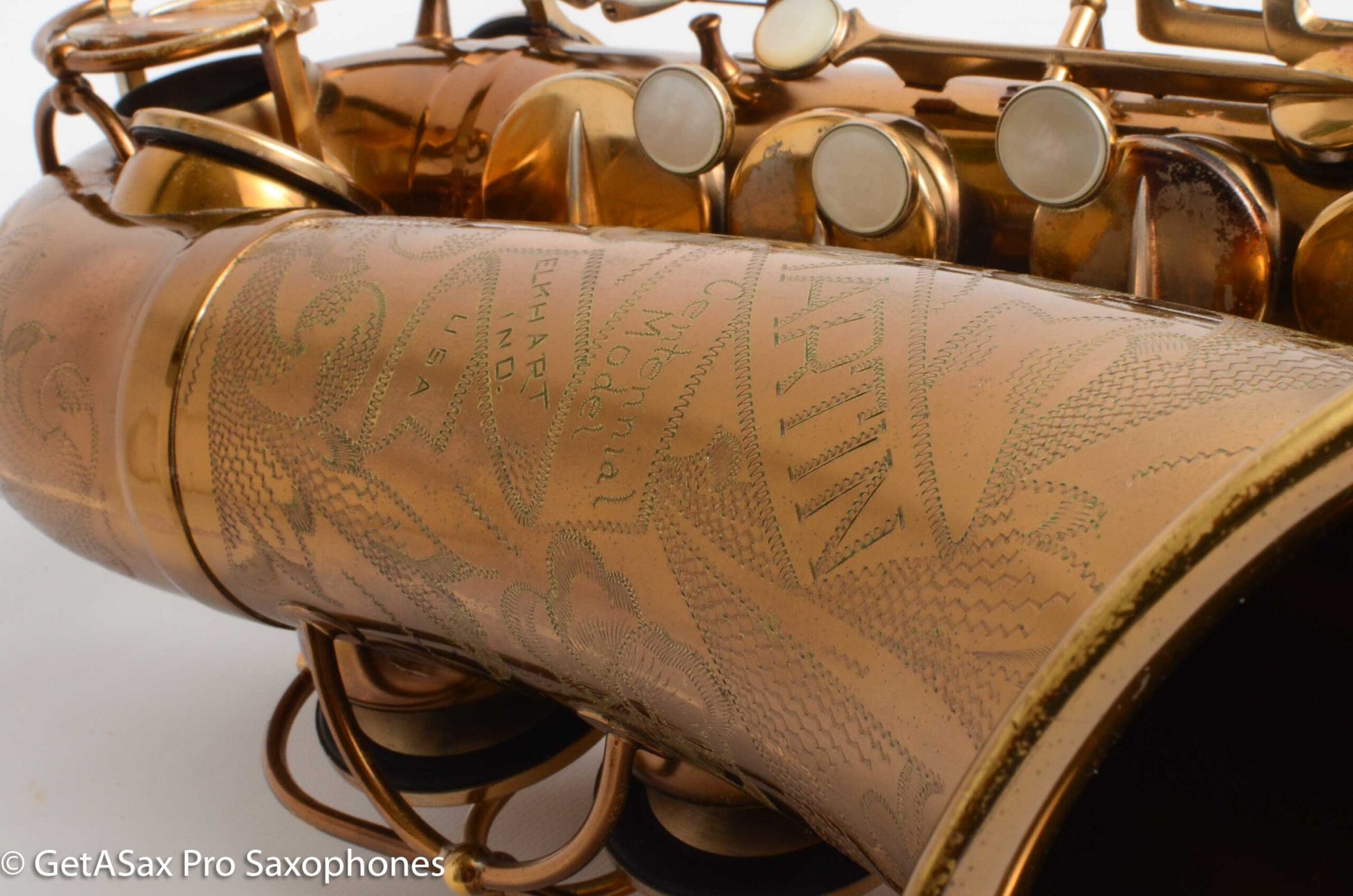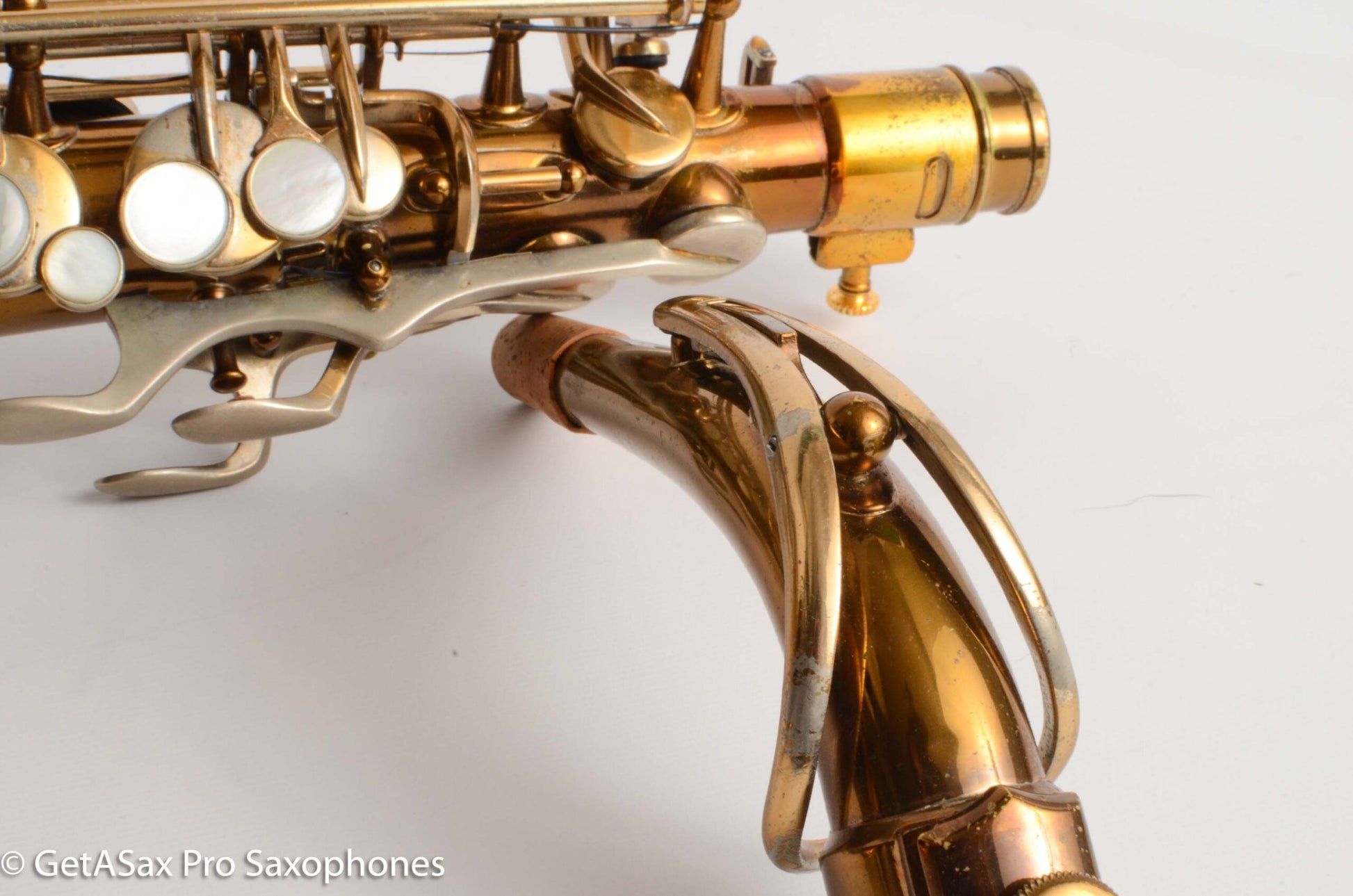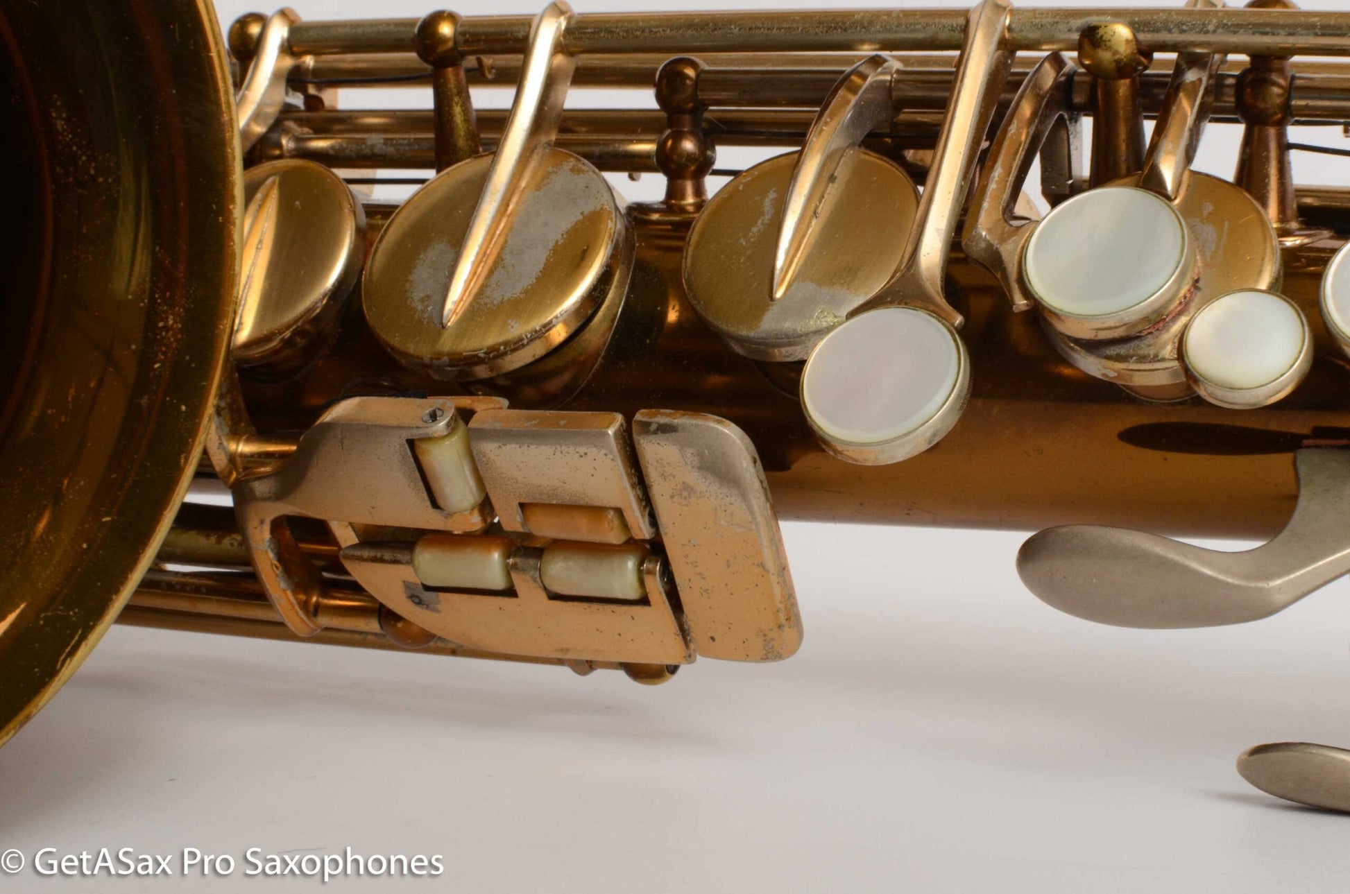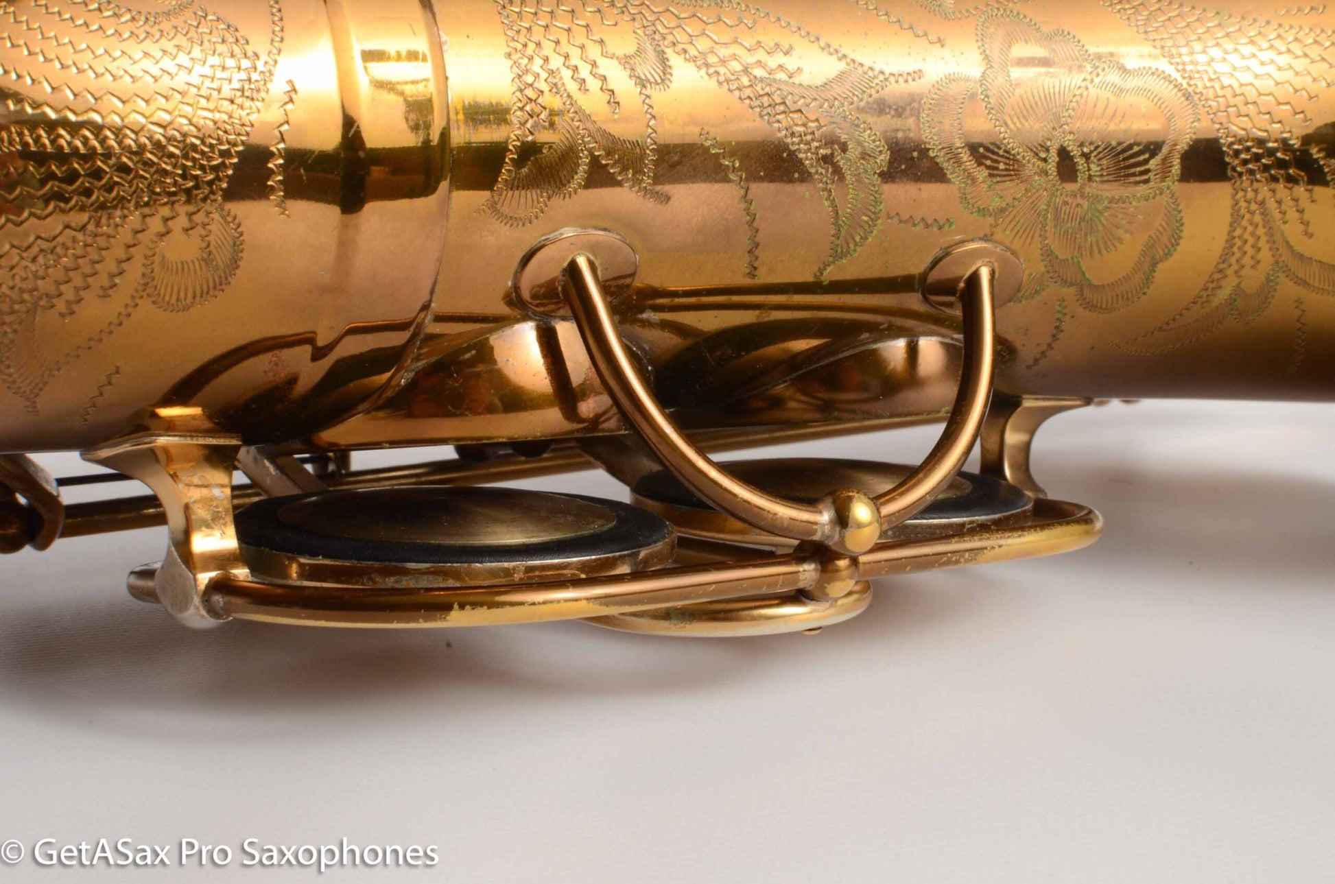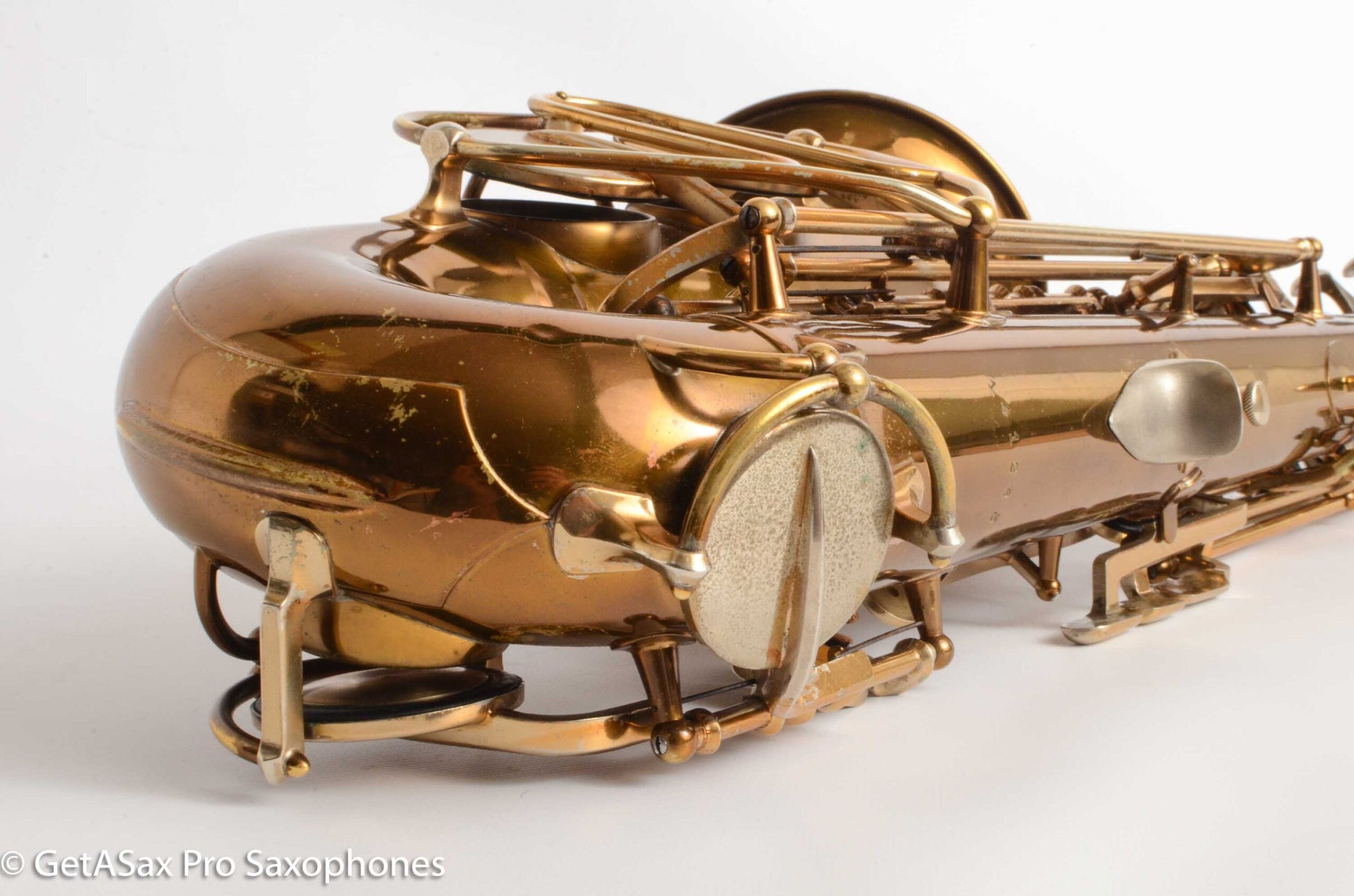 The Martin Centennial is an early version of the Committee III “The Martin Alto” design that also has some styling from the Committee II era. It has a beautiful, dark, powerful tone that projects very well. The whole horn is built like a tank, with thicker brass than other saxophones and beautiful, art-deco styling on the key shapes and guards. This horn got a high end overhaul and is playing its best. It feels dry and snappy under the fingers and is setup for quick key action and lots of tone. The original lacquer is almost all present, and there is no significant damage. If you’re in the market for an overhauled The Martin Alto (Comm III) and want something that is also a little extra-special, then this would be the one to get. The Centennial is at least 20x rarer than a regular Comm III, but it doesn’t cost more, which is pretty cool!