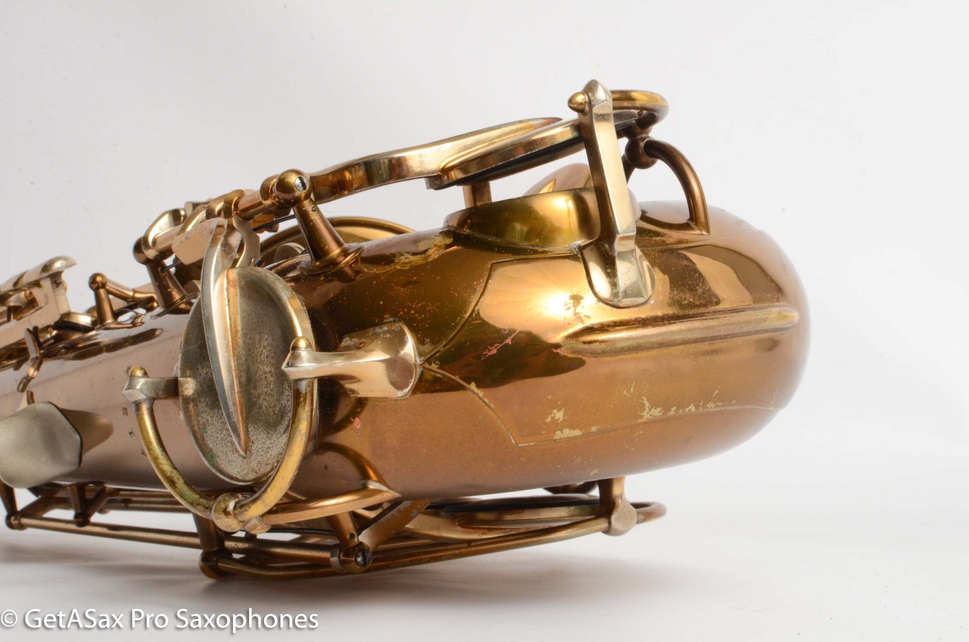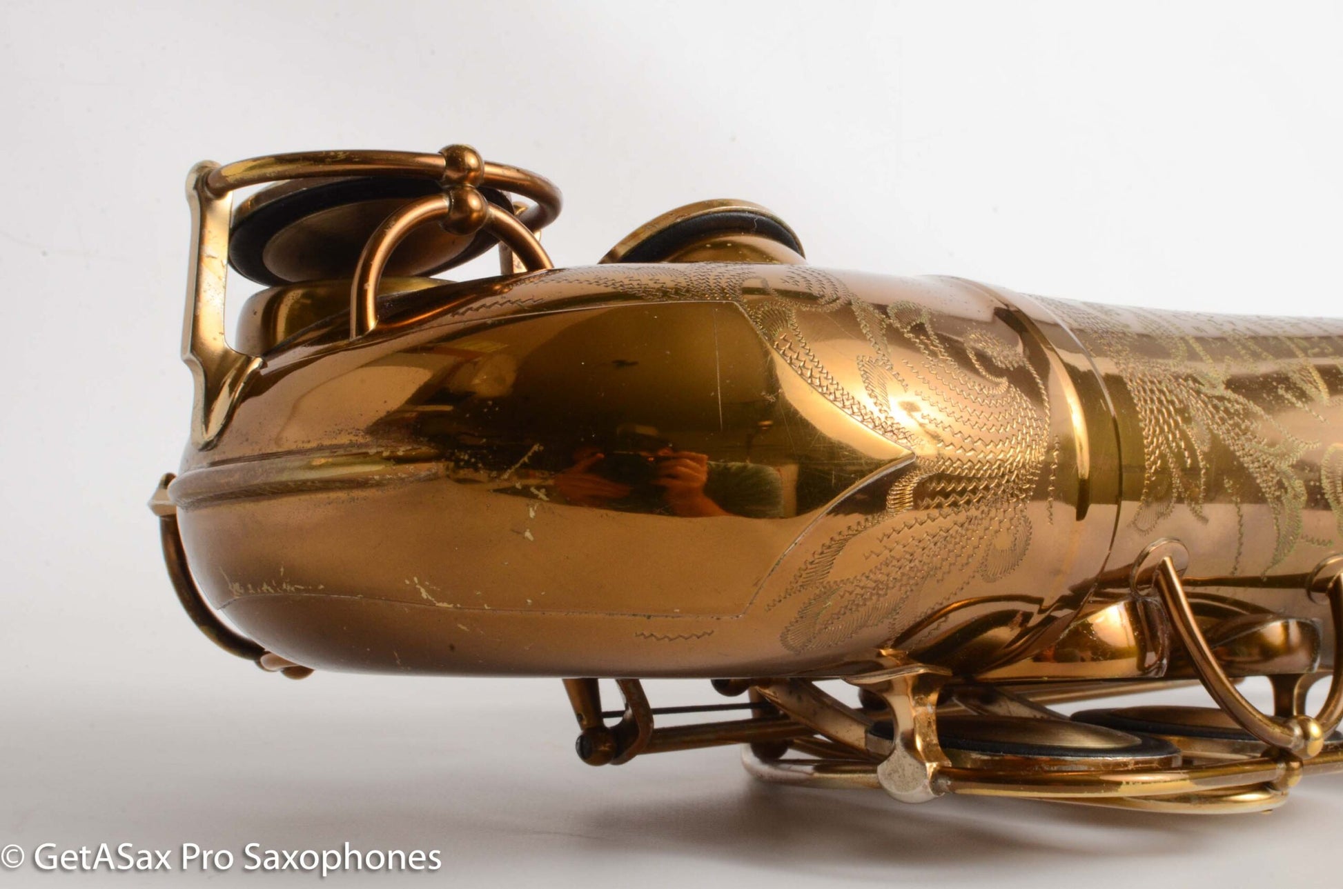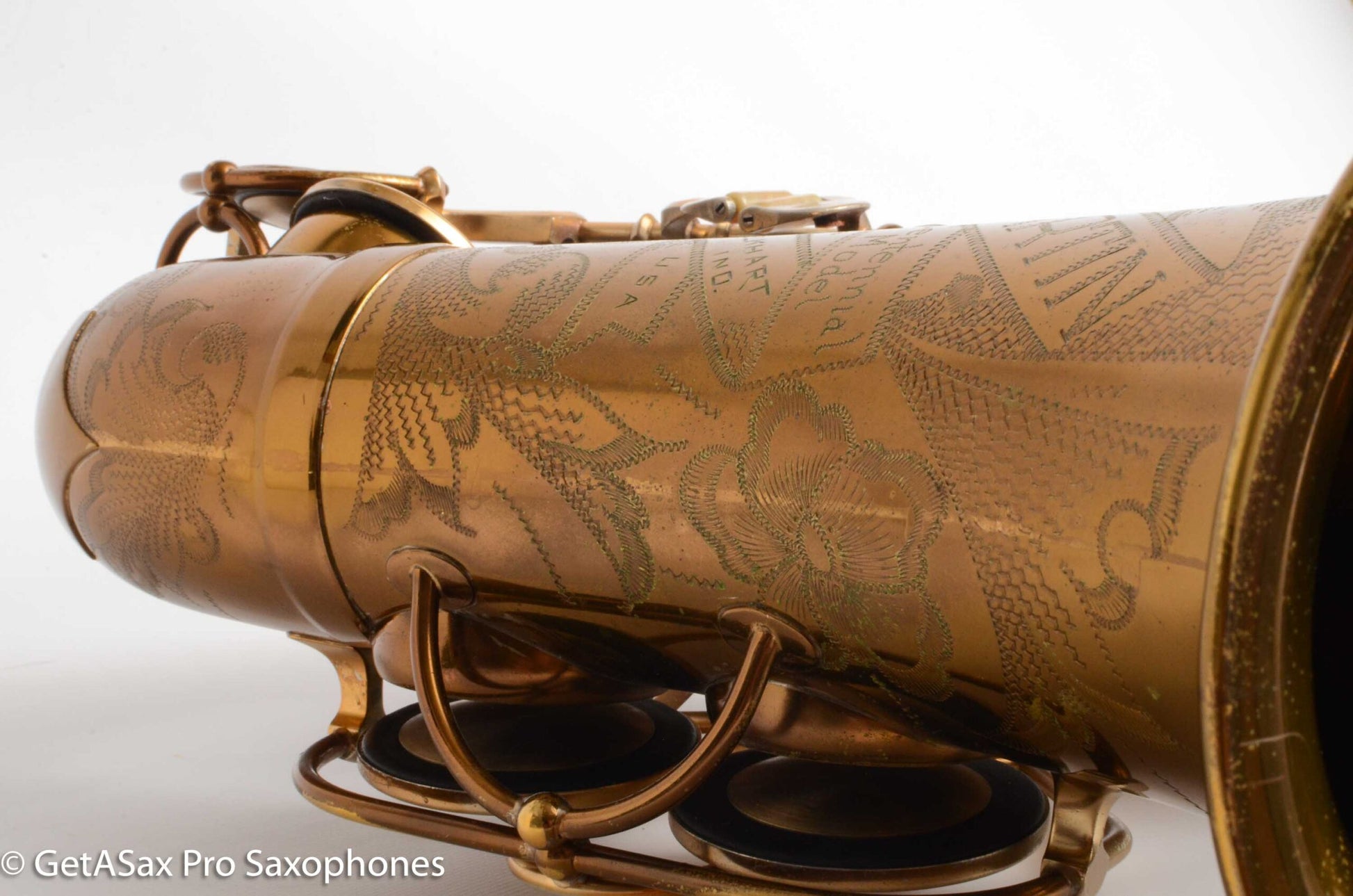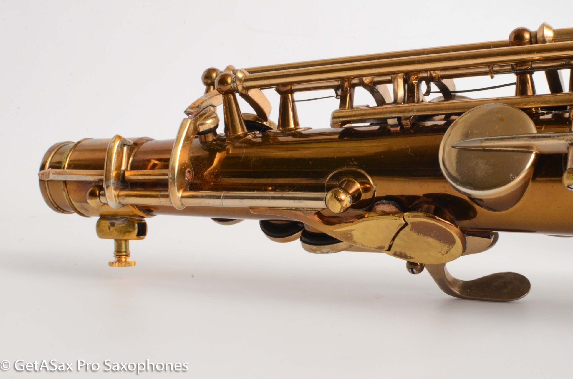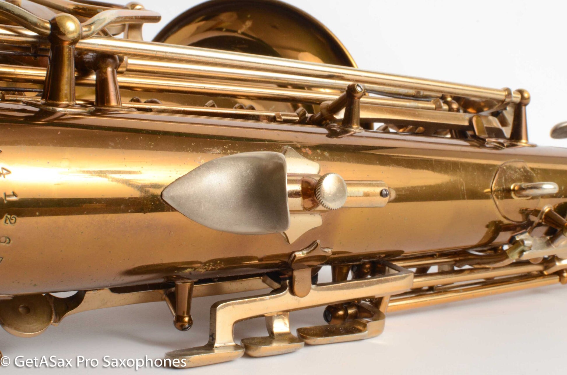 The Martin Centennial is an early version of the Committee III “The Martin Alto” design that also has some styling from the Committee II era. It has a beautiful, dark, powerful tone that projects very well. The whole horn is built like a tank, with thicker brass than other saxophones and beautiful, art-deco styling on the key shapes and guards. This horn got a high end overhaul and is playing its best. It feels dry and snappy under the fingers and is setup for quick key action and lots of tone. The original lacquer is almost all present, and there is no significant damage. If you’re in the market for an overhauled The Martin Alto (Comm III) and want something that is also a little extra-special, then this would be the one to get. The Centennial is at least 20x rarer than a regular Comm III, but it doesn’t cost more, which is pretty cool!
