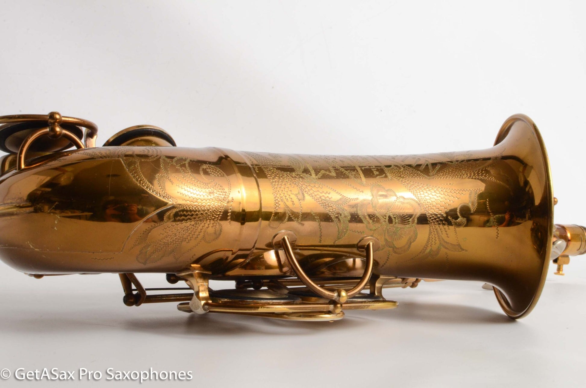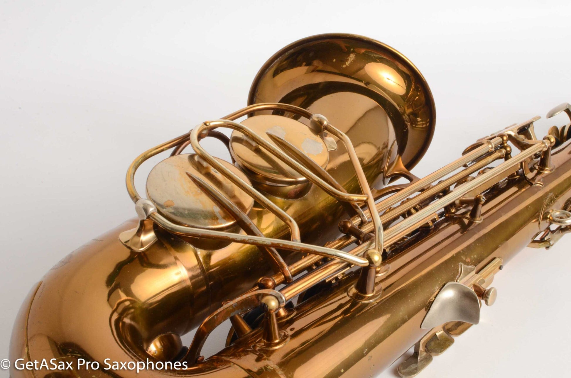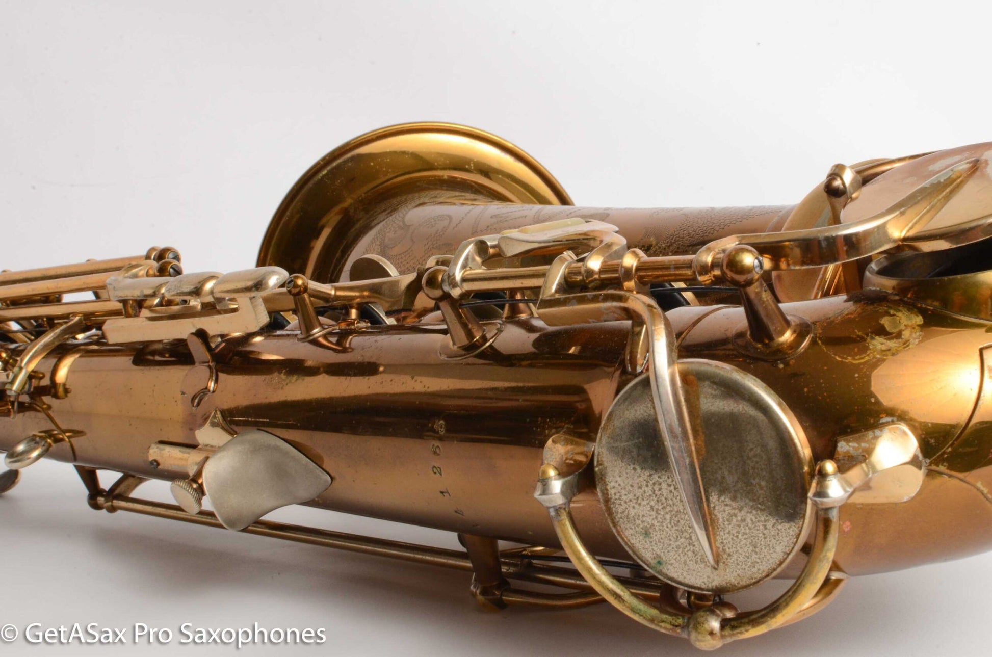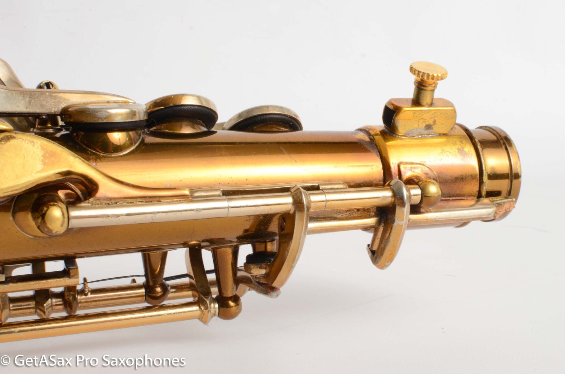 The Martin Centennial is an early version of the Committee III “The Martin Alto” design that also has some styling from the Committee II era. It has a beautiful, dark, powerful tone that projects very well. The whole horn is built like a tank, with thicker brass than other saxophones and beautiful, art-deco styling on the key shapes and guards. This horn got a high end overhaul and is playing its best. It feels dry and snappy under the fingers and is setup for quick key action and lots of tone. The original lacquer is almost all present, and there is no significant damage. If you’re in the market for an overhauled The Martin Alto (Comm III) and want something that is also a little extra-special, then this would be the one to get. The Centennial is at least 20x rarer than a regular Comm III, but it doesn’t cost more, which is pretty cool!
