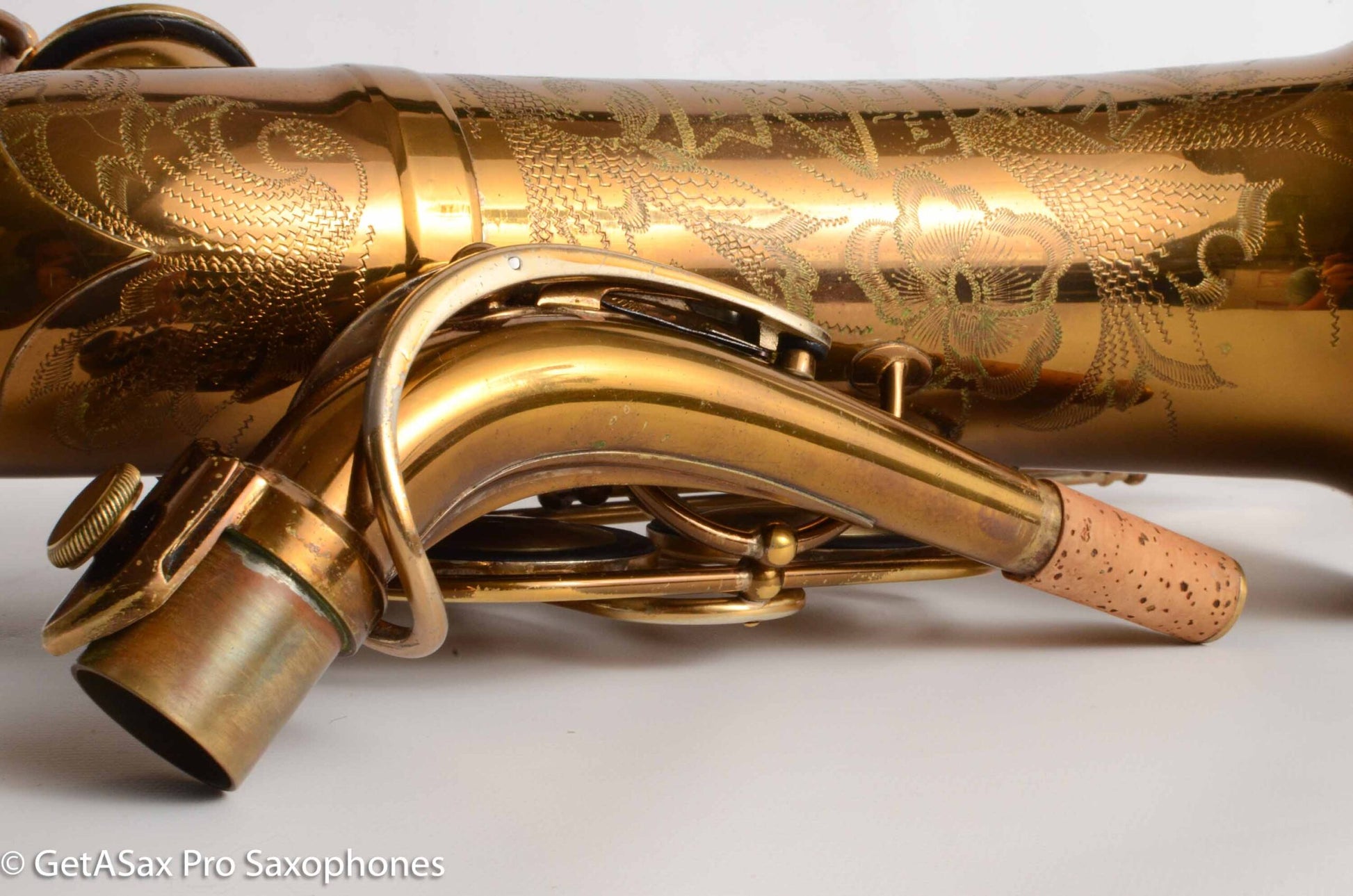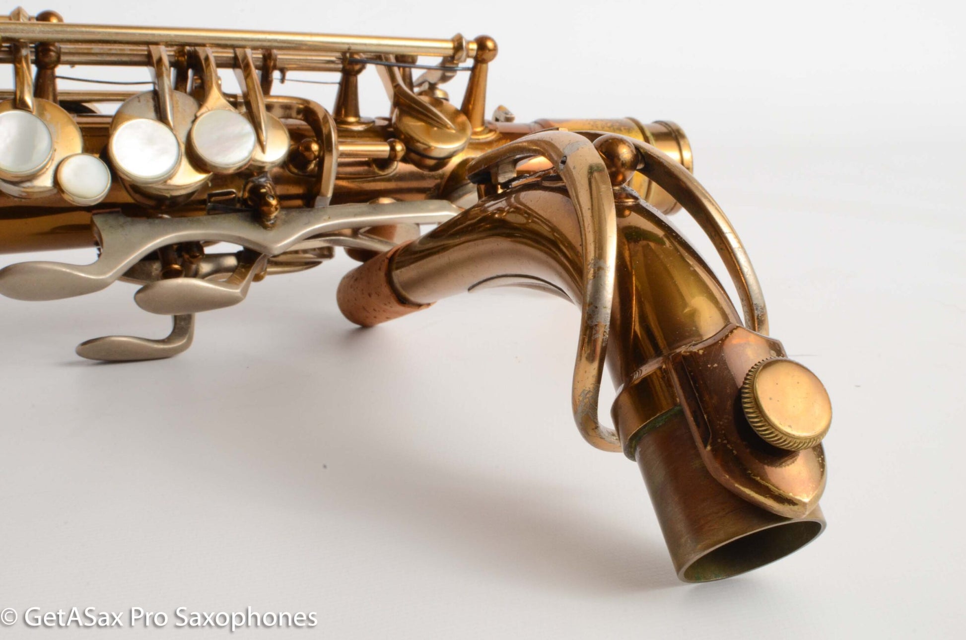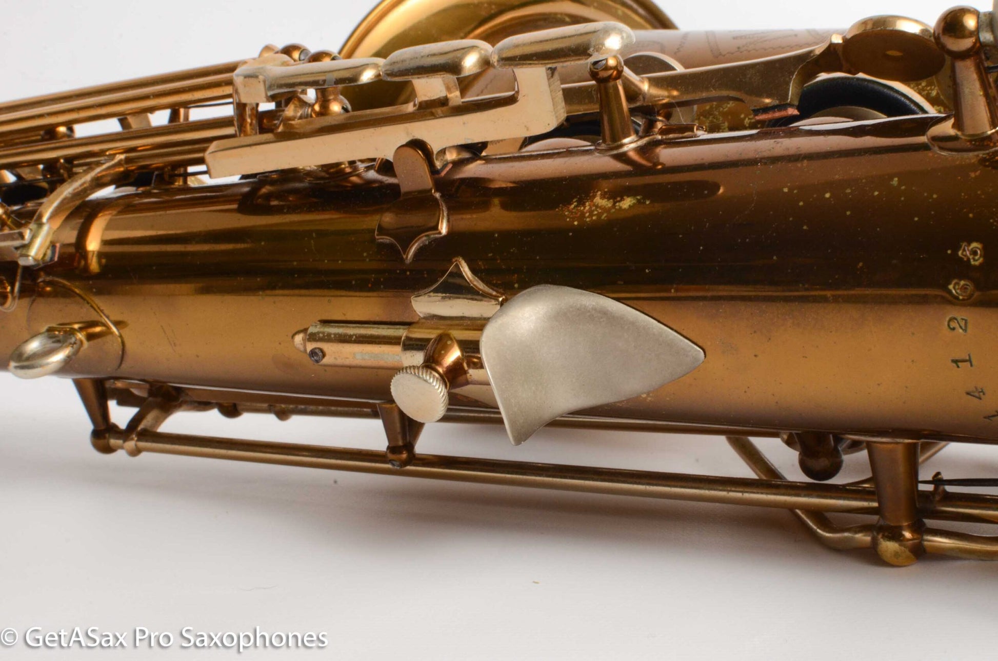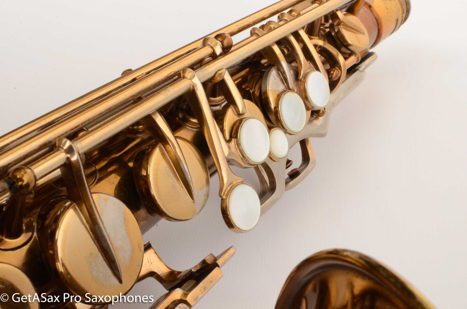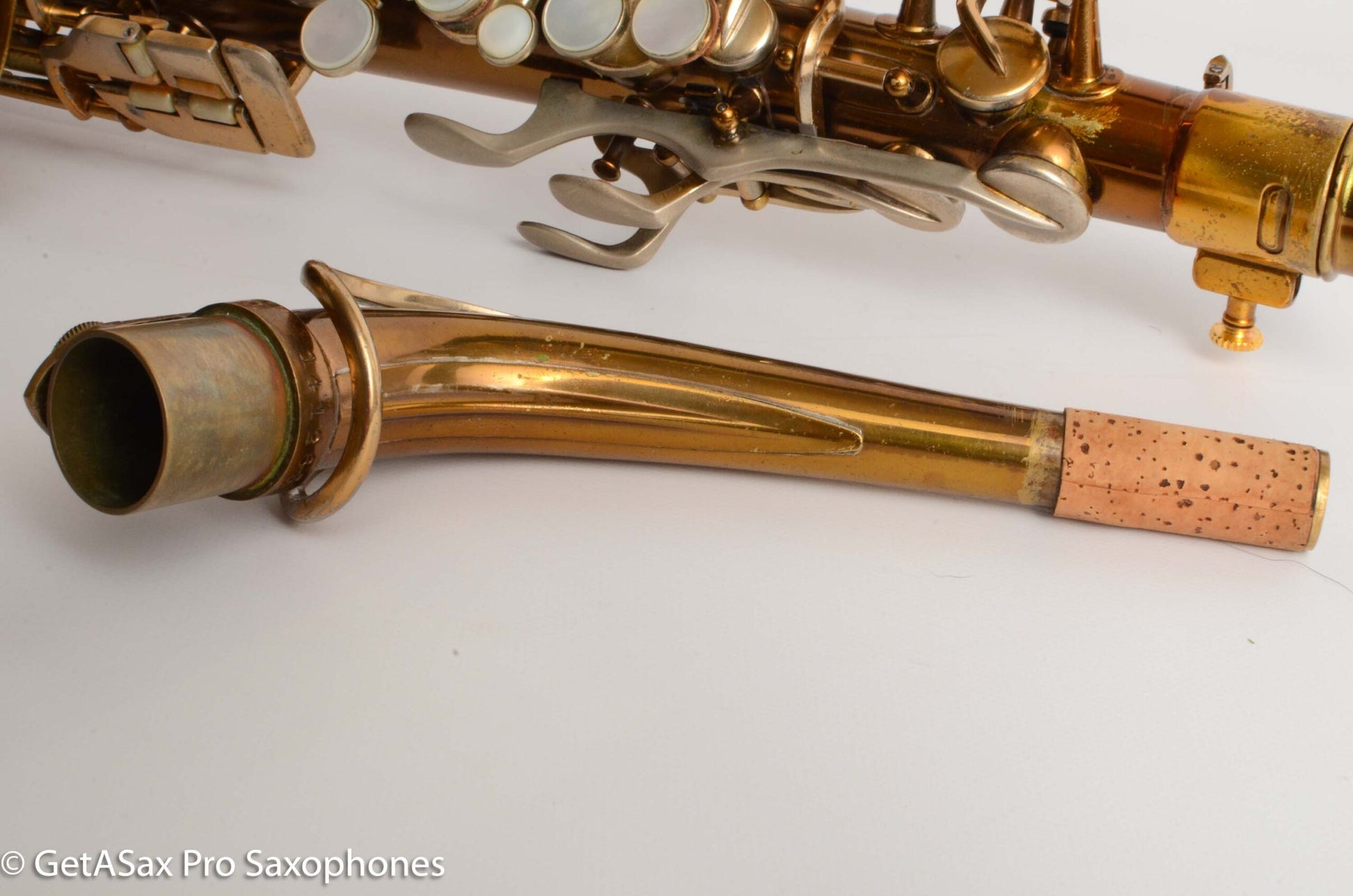 The Martin Centennial is an early version of the Committee III “The Martin Alto” design that also has some styling from the Committee II era. It has a beautiful, dark, powerful tone that projects very well. The whole horn is built like a tank, with thicker brass than other saxophones and beautiful, art-deco styling on the key shapes and guards. This horn got a high end overhaul and is playing its best. It feels dry and snappy under the fingers and is setup for quick key action and lots of tone. The original lacquer is almost all present, and there is no significant damage. If you’re in the market for an overhauled The Martin Alto (Comm III) and want something that is also a little extra-special, then this would be the one to get. The Centennial is at least 20x rarer than a regular Comm III, but it doesn’t cost more, which is pretty cool!