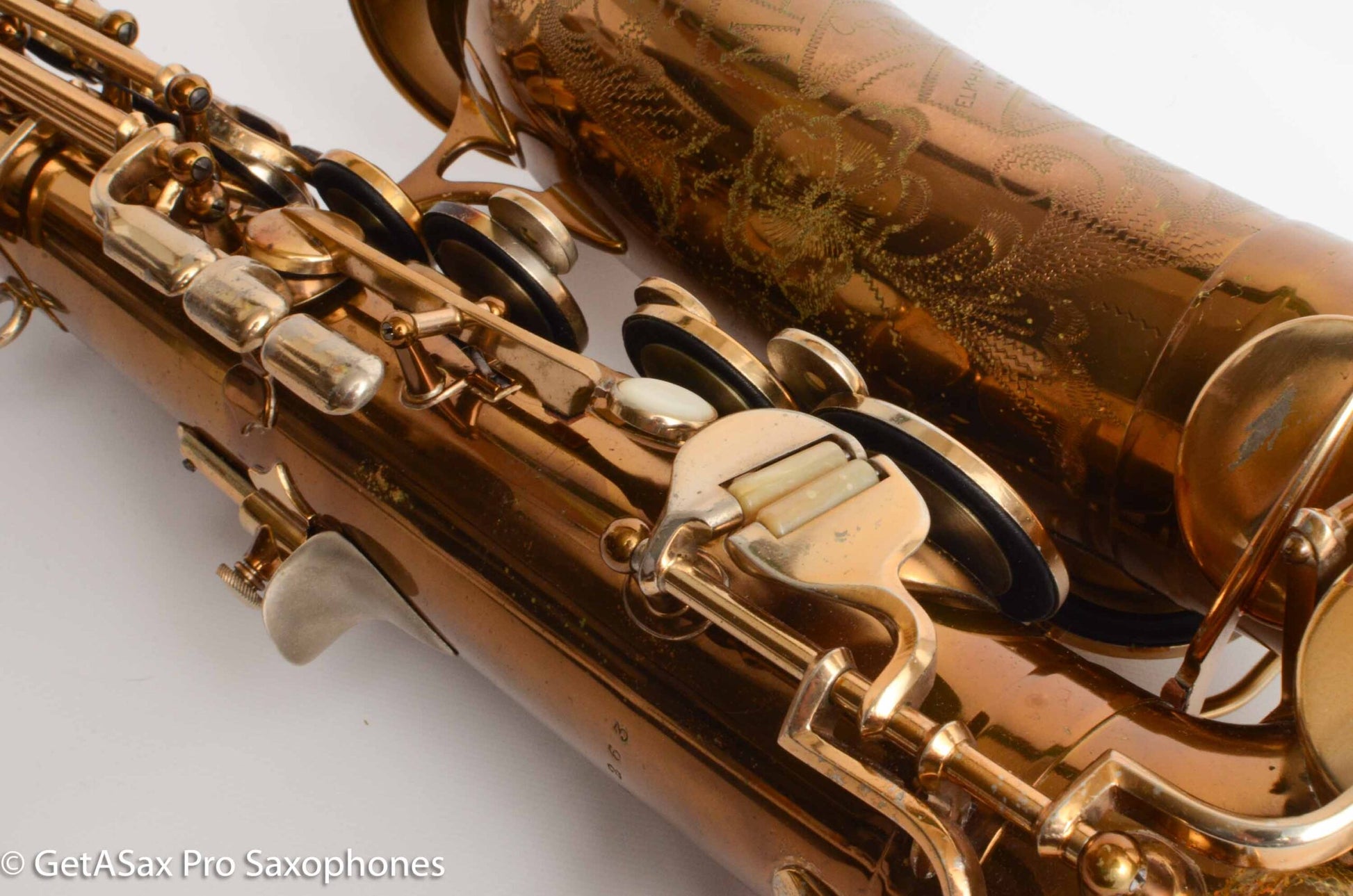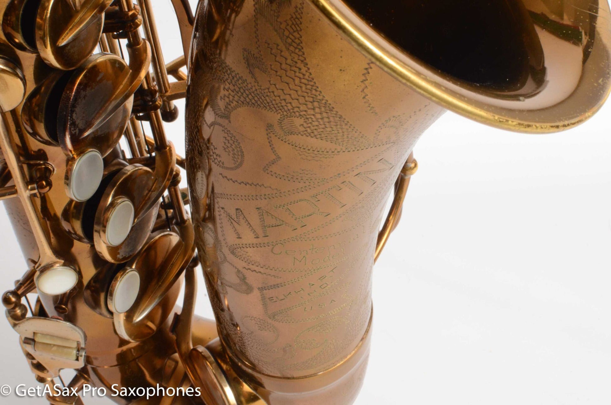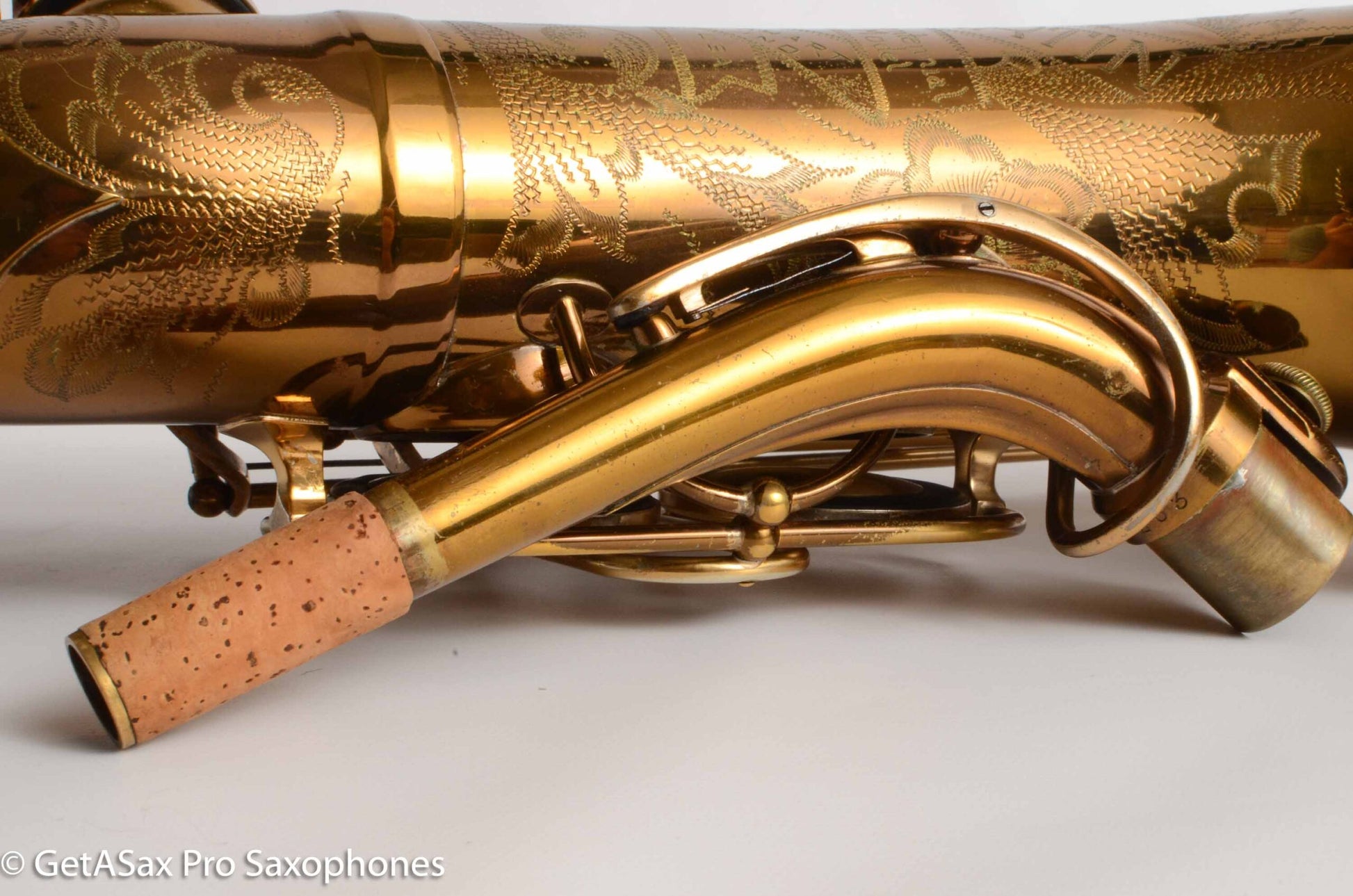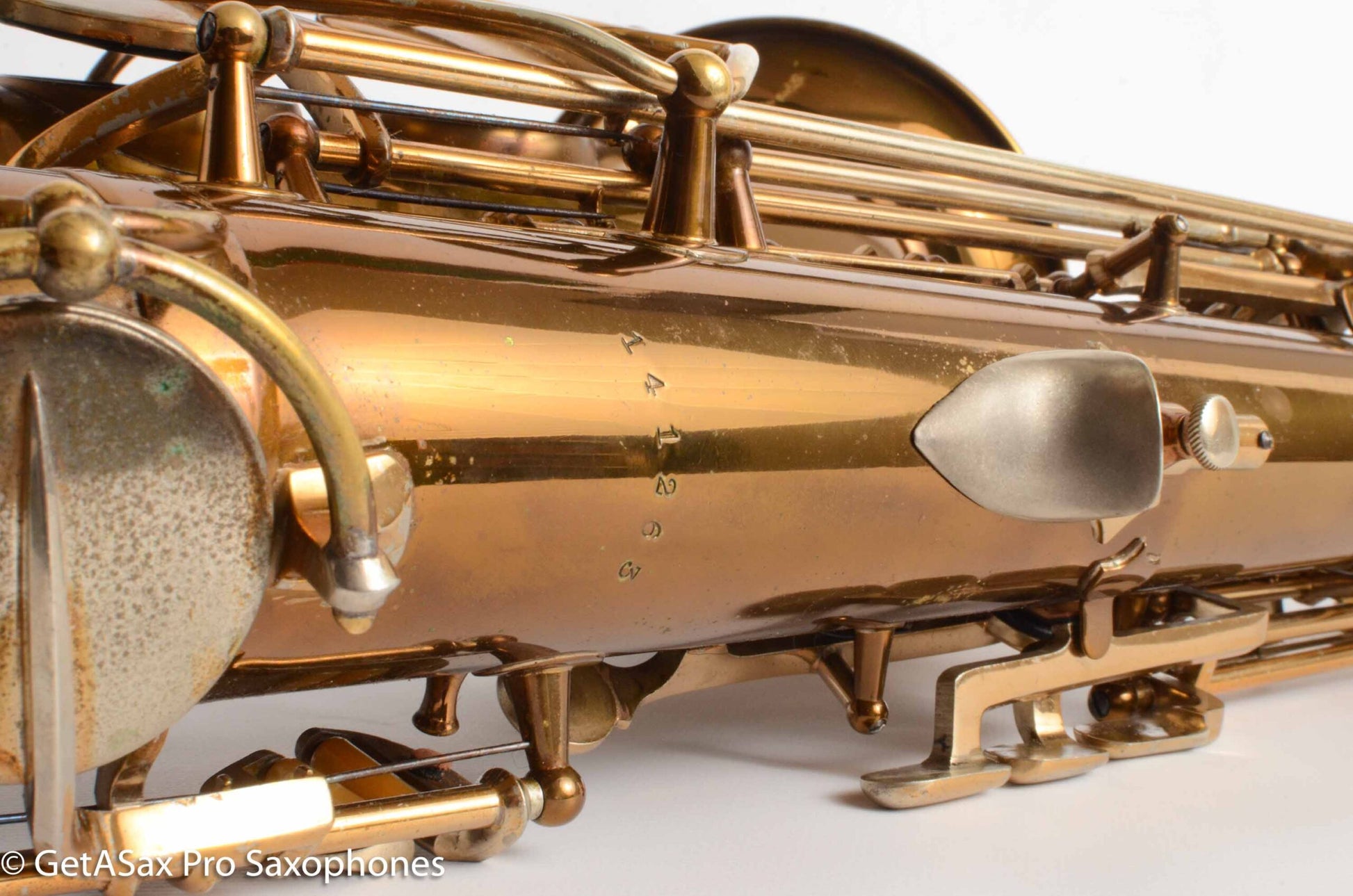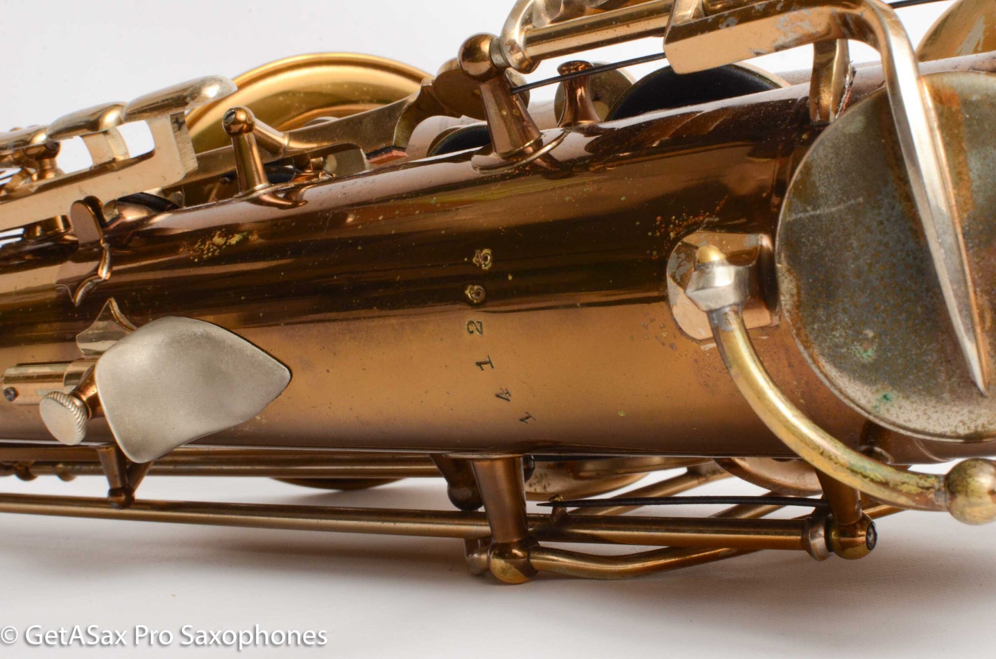 The Martin Centennial is an early version of the Committee III “The Martin Alto” design that also has some styling from the Committee II era. It has a beautiful, dark, powerful tone that projects very well. The whole horn is built like a tank, with thicker brass than other saxophones and beautiful, art-deco styling on the key shapes and guards. This horn got a high end overhaul and is playing its best. It feels dry and snappy under the fingers and is setup for quick key action and lots of tone. The original lacquer is almost all present, and there is no significant damage. If you’re in the market for an overhauled The Martin Alto (Comm III) and want something that is also a little extra-special, then this would be the one to get. The Centennial is at least 20x rarer than a regular Comm III, but it doesn’t cost more, which is pretty cool!