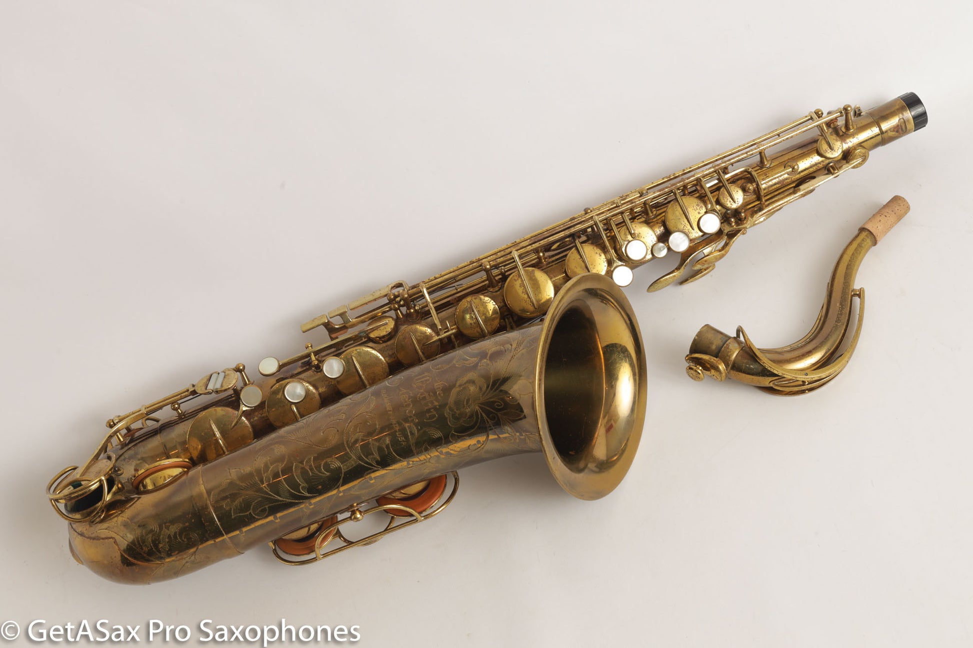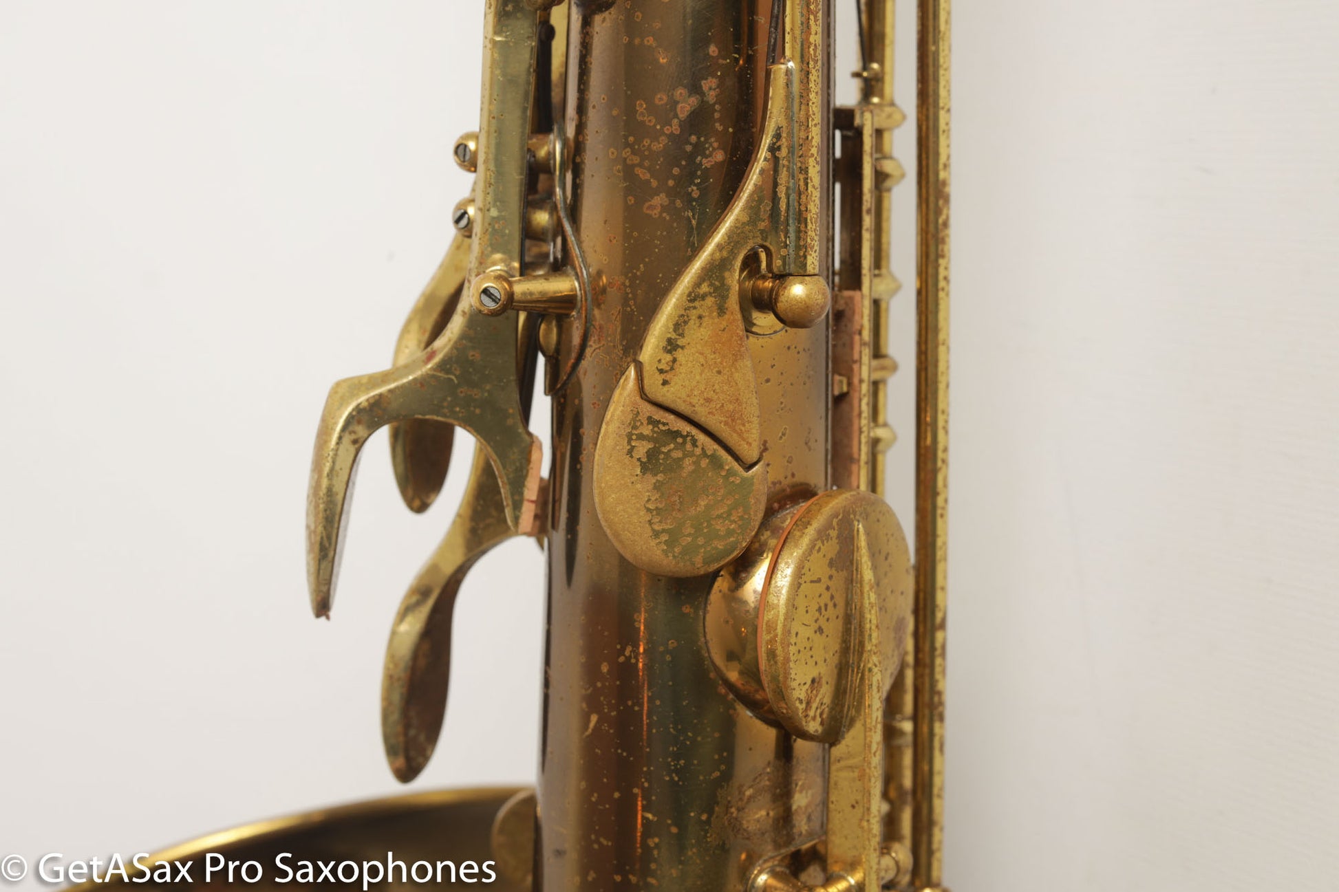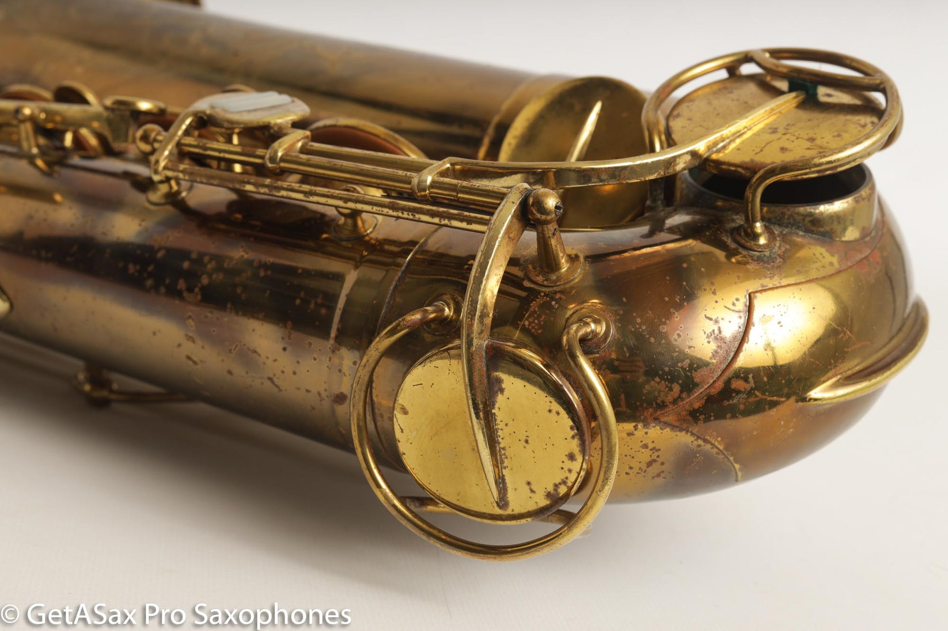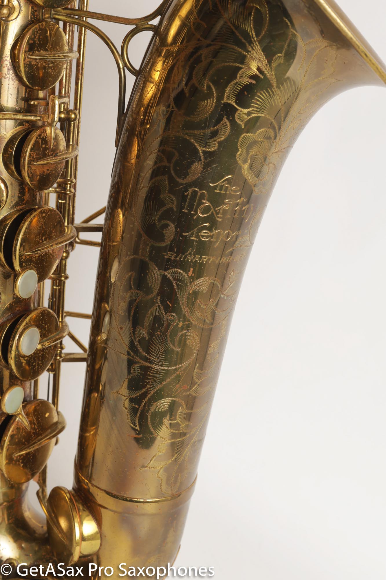 This The Martin Tenor just got a full overhaul done by Peter Lamb at Flying Squirrel Music in Raleigh, NC. The pad work feels nice and snappy, and the horn is totally overhauled and ready to go! The price is on the low side for an overhauled Martin because the lacquer is a factory refinish. It looks original, but there’s just a tiny bit of buffing evident around the bow area to show that it’s a redo. This should make virtually no difference on this particular horn to how it plays, because it was obviously done just for some type A person to have a tiny scratch removed or something. Back in the day, that’s how it would work. You’d get the horn refinished at the factory and repadded for a very low price, to get it back looking totally great.
