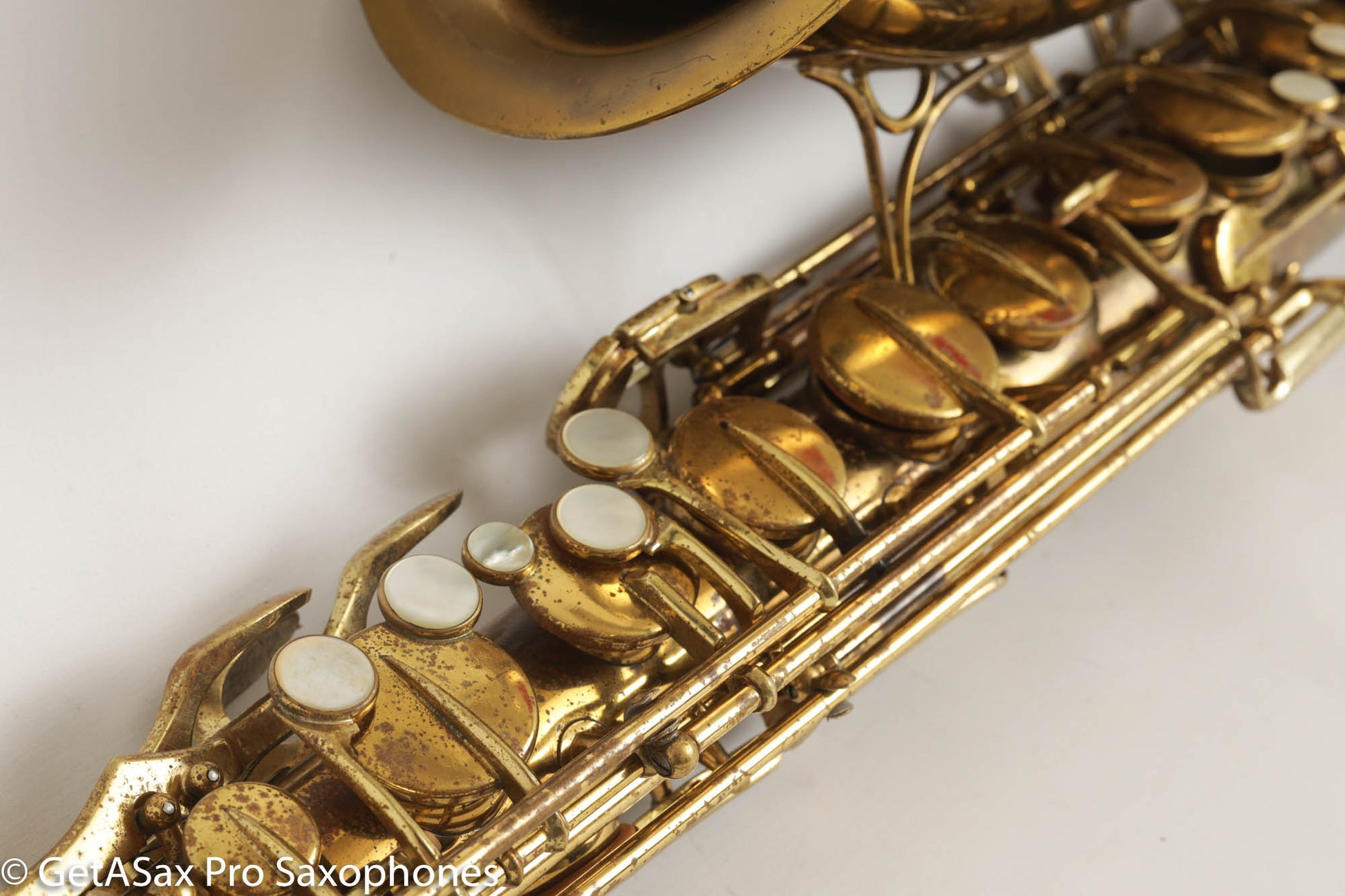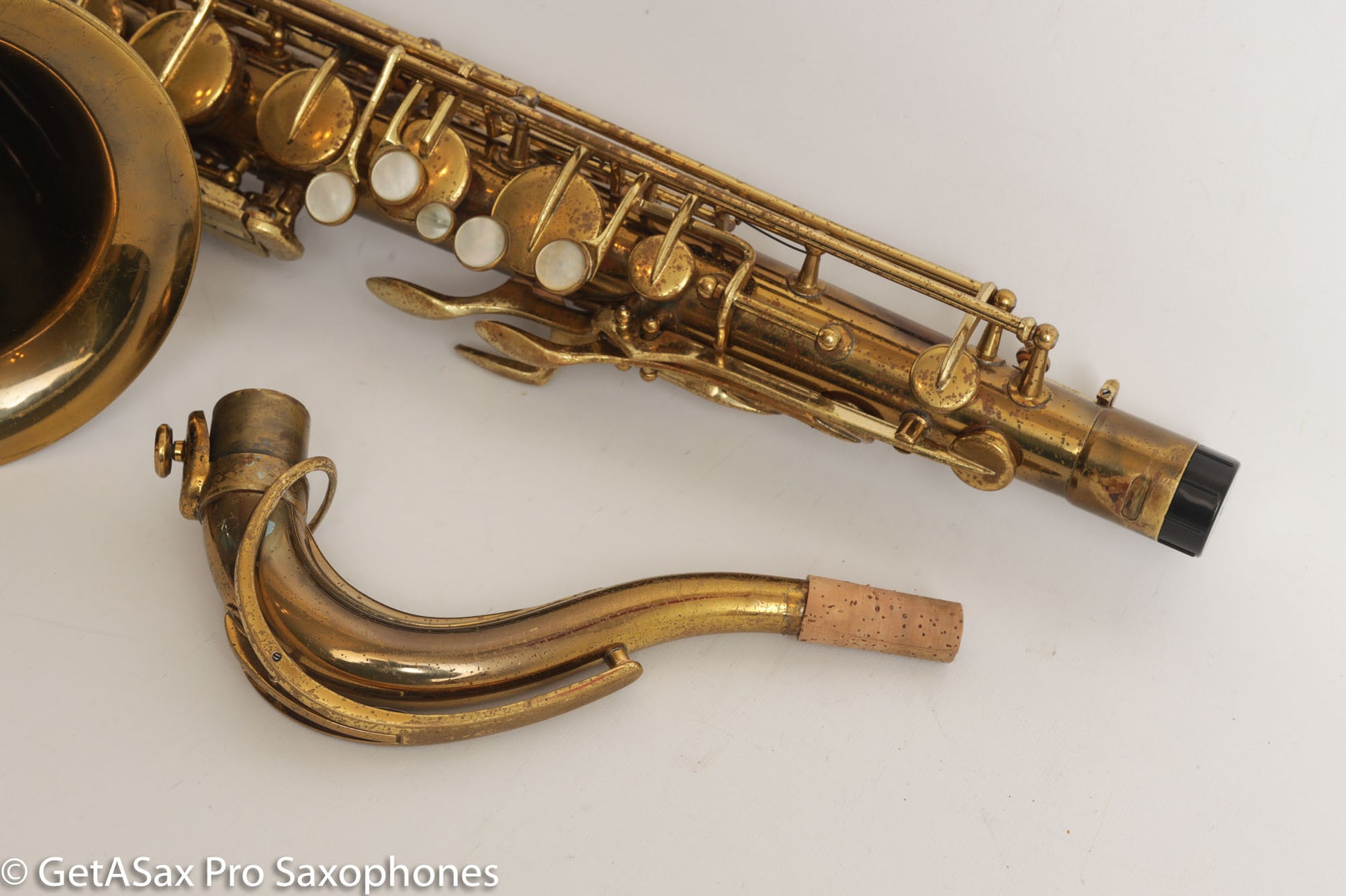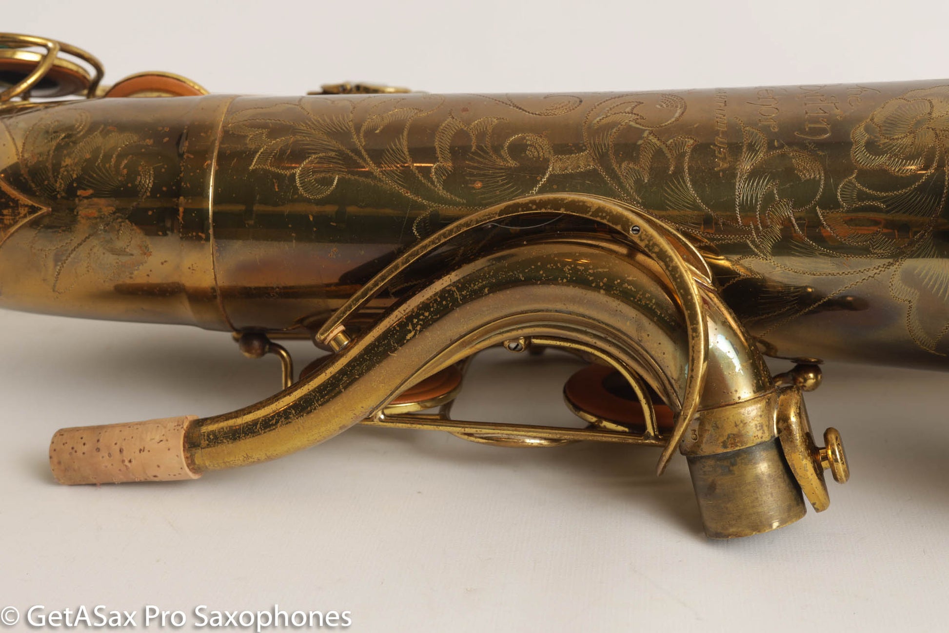This The Martin Tenor just got a full overhaul done by Peter Lamb at Flying Squirrel Music in Raleigh, NC. The pad work feels nice and snappy, and the horn is totally overhauled and ready to go! The price is on the low side for an overhauled Martin because the lacquer is a factory refinish. It looks original, but there’s just a tiny bit of buffing evident around the bow area to show that it’s a redo. This should make virtually no difference on this particular horn to how it plays, because it was obviously done just for some type A person to have a tiny scratch removed or something. Back in the day, that’s how it would work. You’d get the horn refinished at the factory and repadded for a very low price, to get it back looking totally great.