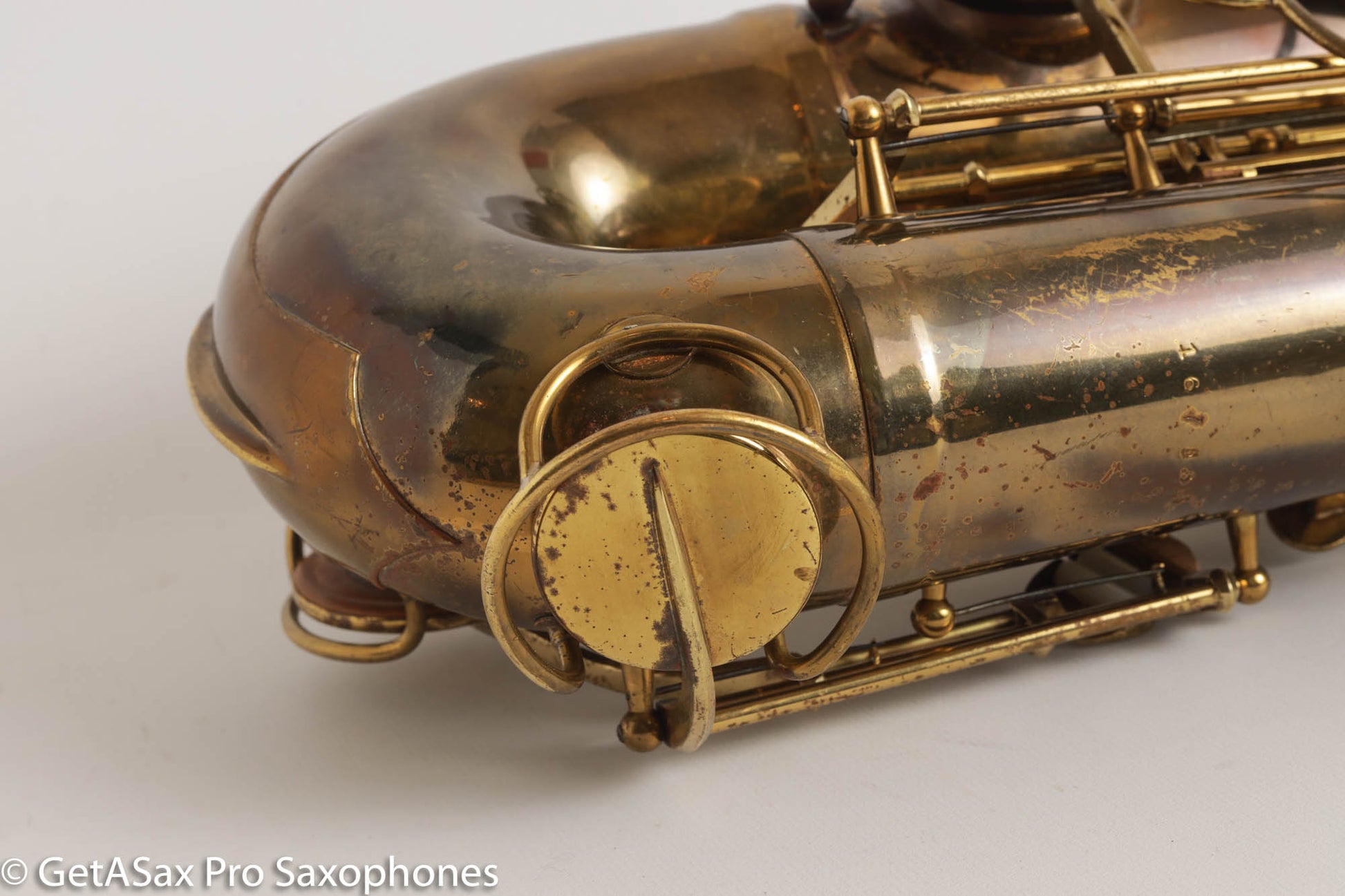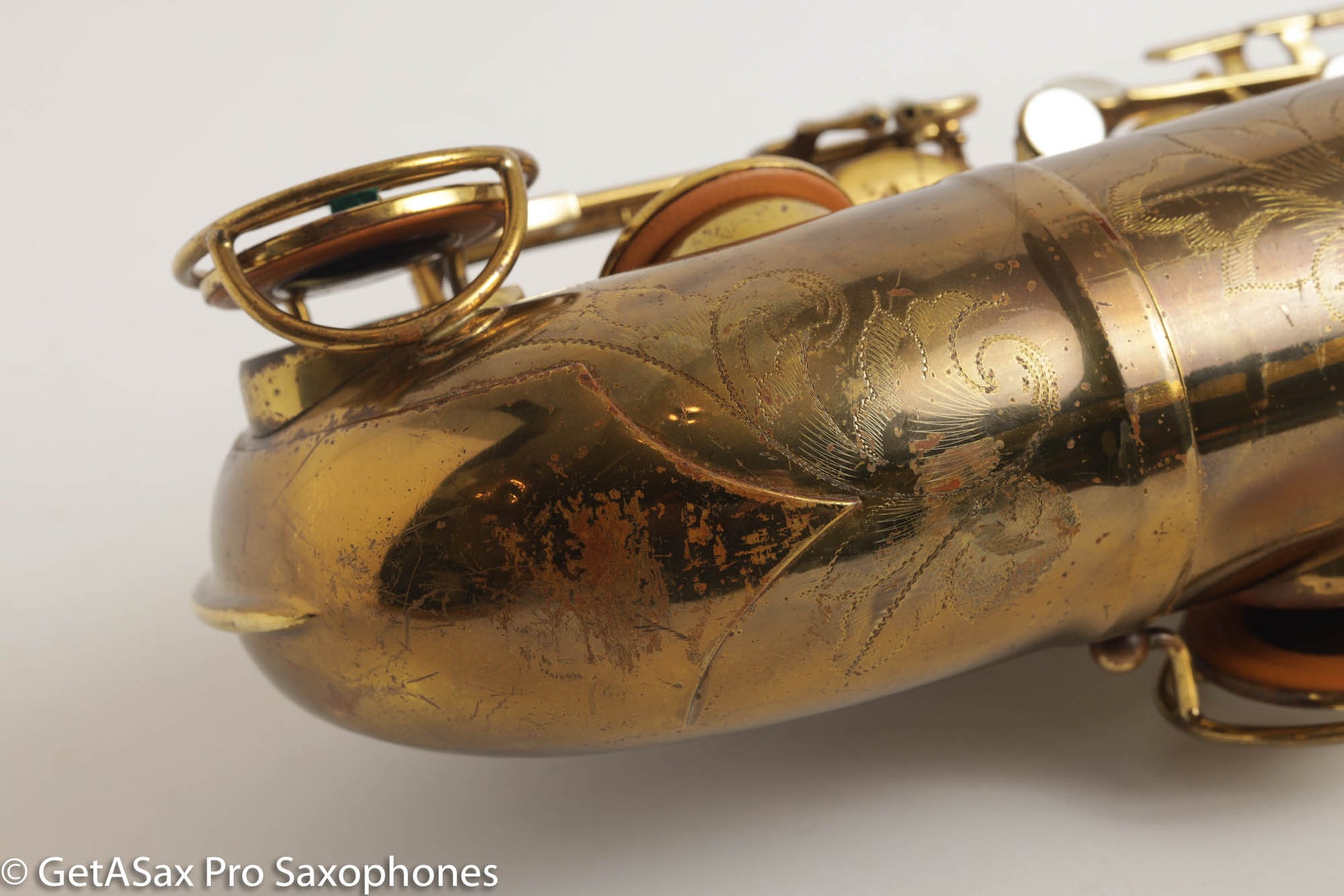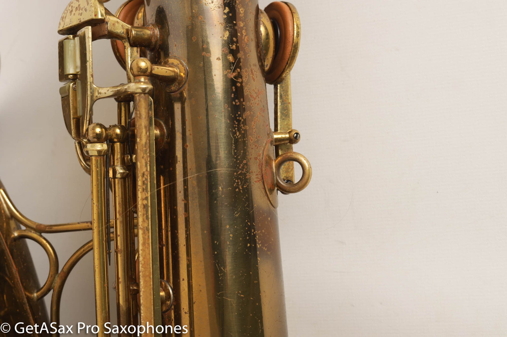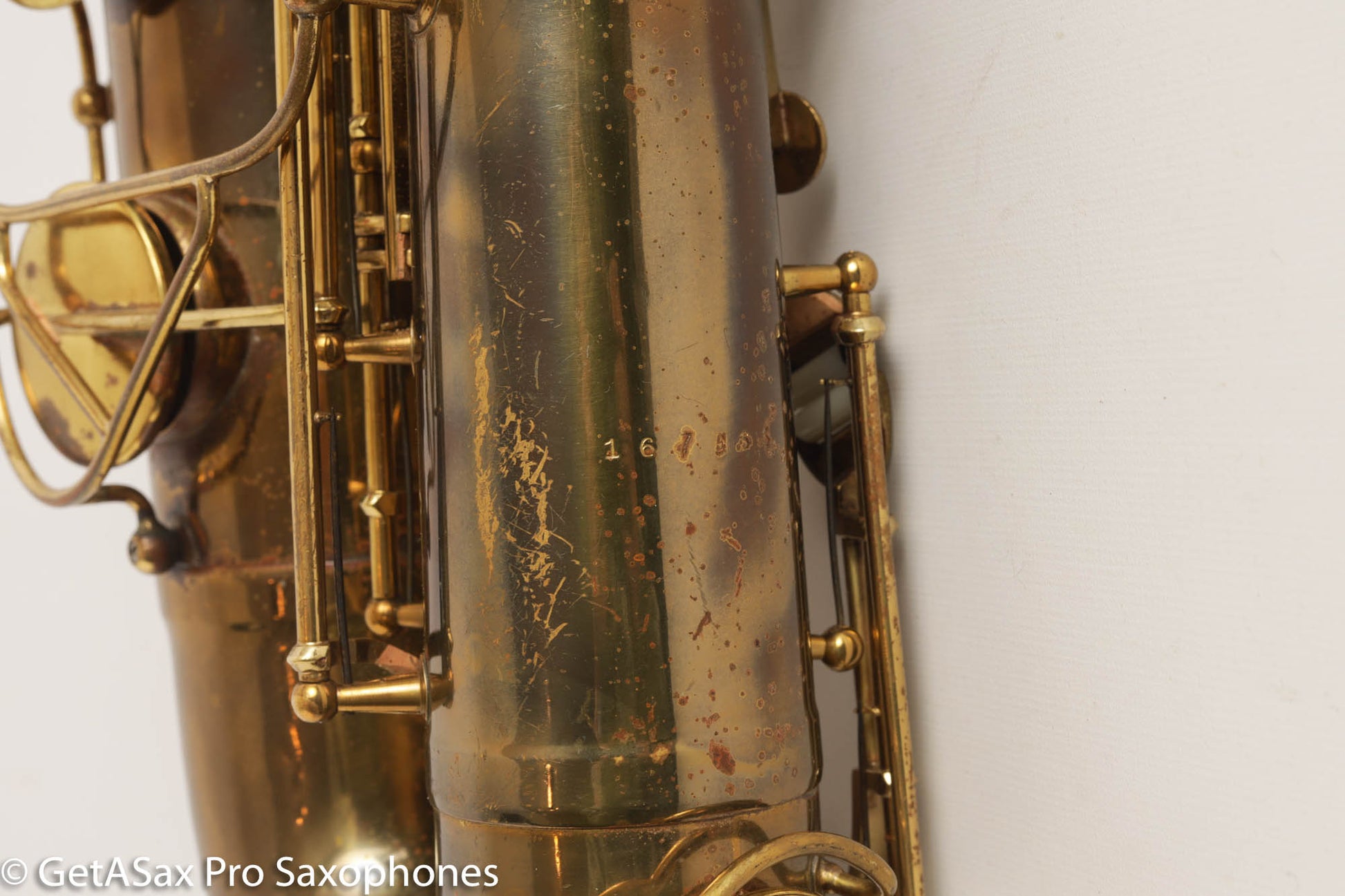 This The Martin Tenor just got a full overhaul done by Peter Lamb at Flying Squirrel Music in Raleigh, NC. The pad work feels nice and snappy, and the horn is totally overhauled and ready to go! The price is on the low side for an overhauled Martin because the lacquer is a factory refinish. It looks original, but there’s just a tiny bit of buffing evident around the bow area to show that it’s a redo. This should make virtually no difference on this particular horn to how it plays, because it was obviously done just for some type A person to have a tiny scratch removed or something. Back in the day, that’s how it would work. You’d get the horn refinished at the factory and repadded for a very low price, to get it back looking totally great.