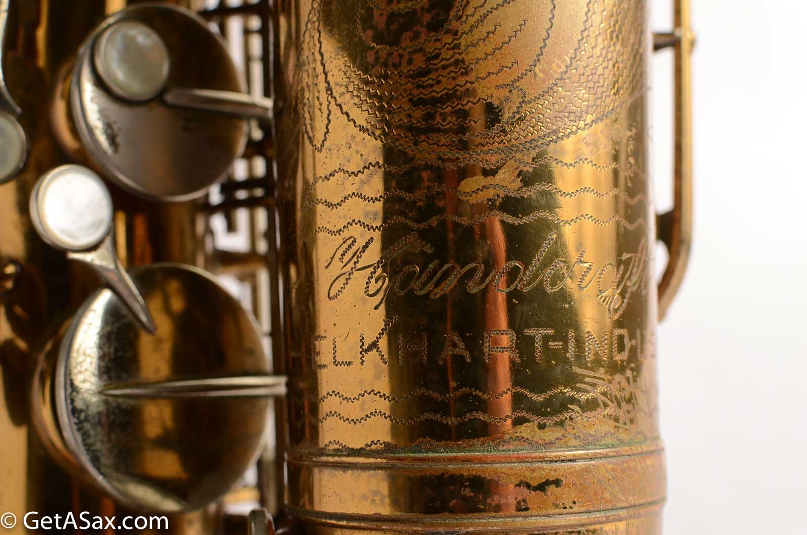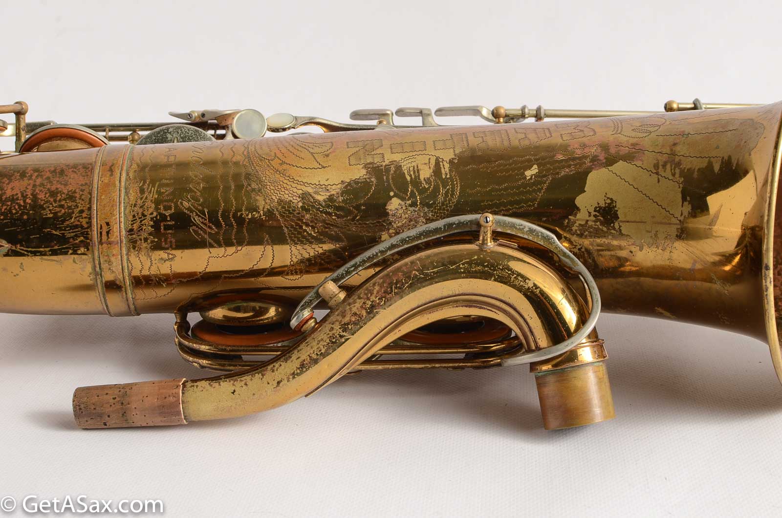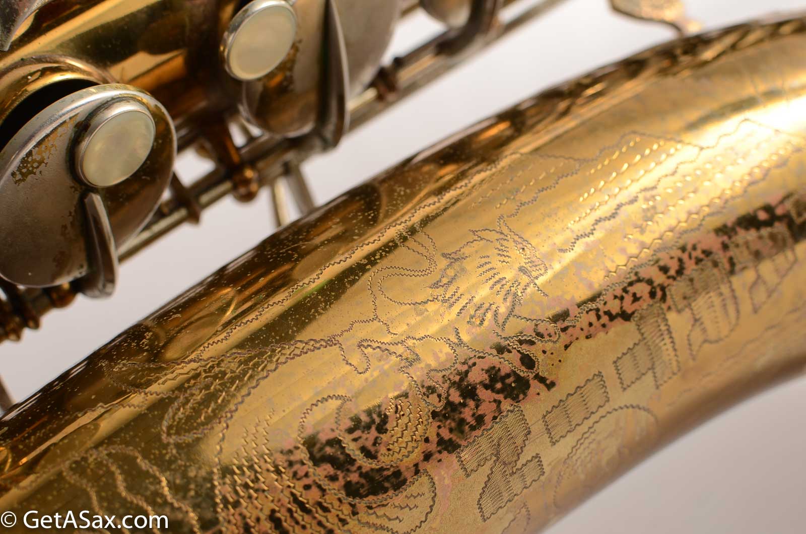 This is original lacquer, and it is in good condition with only regular play wear from use. The only resolder is on one leg of the low C guard, and that's it for repairs. The lines in the lacquer on the back of the body tube near the octave key are from polishing, not from dent work. I don't see any evidence of dent work. The pads are all sealing well, and this horn is tons of fun to play, with a big, lively feel that may startle some players who are used to relatively-tame modern saxophones!