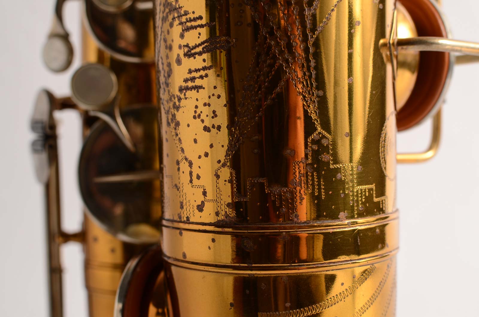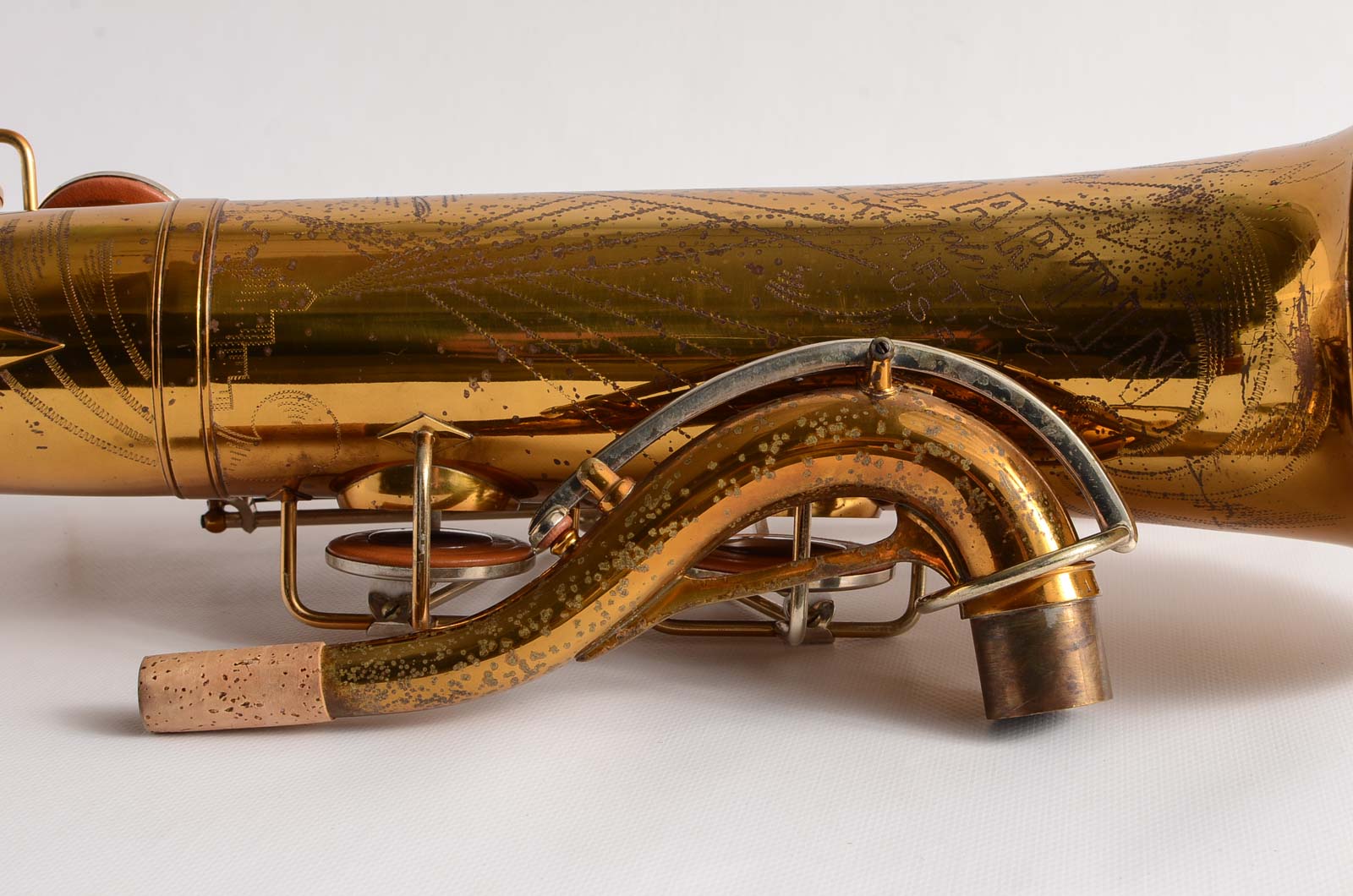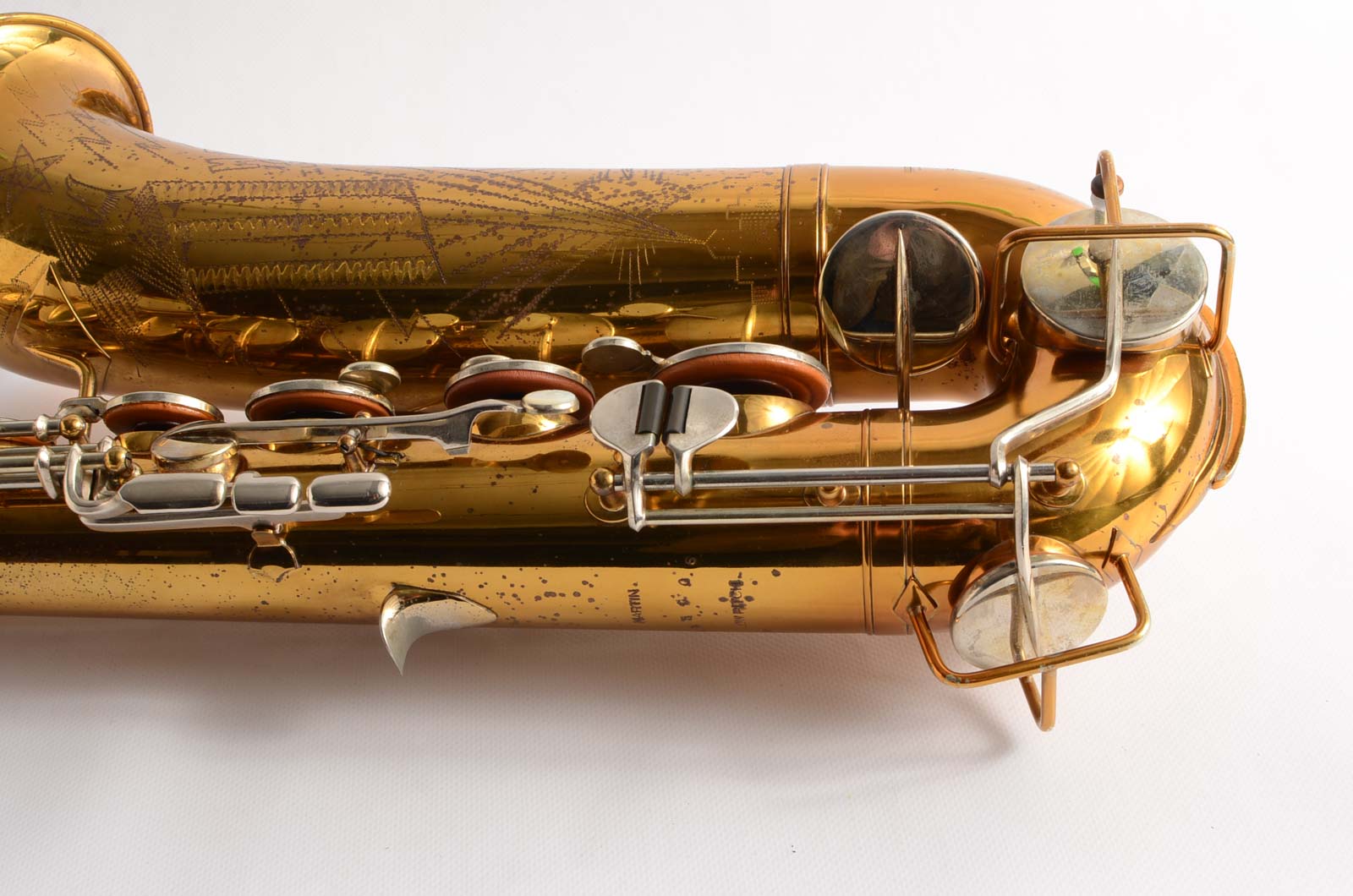 Called the Searchlight or Skyline model, this is a great deal on a beautiful original lacquer Martin Handcraft Committee 1 tenor sax. If you have been shopping for a vintage saxophone, but many were too expensive, then this is what you might want to get. This one needs a repad, or at least a thorough going-over to play its best, but in good playing condition these are a great playing vintage saxes that just happens not to be all that expensive. It has the original neck in good shape with matching serial number, and it includes a modern case to keep the horn safe in shipping. The engraving on this saxophone shows a city skyline with lights shining up into the sky, and it looks very deluxe. They really don't make them like they used to.