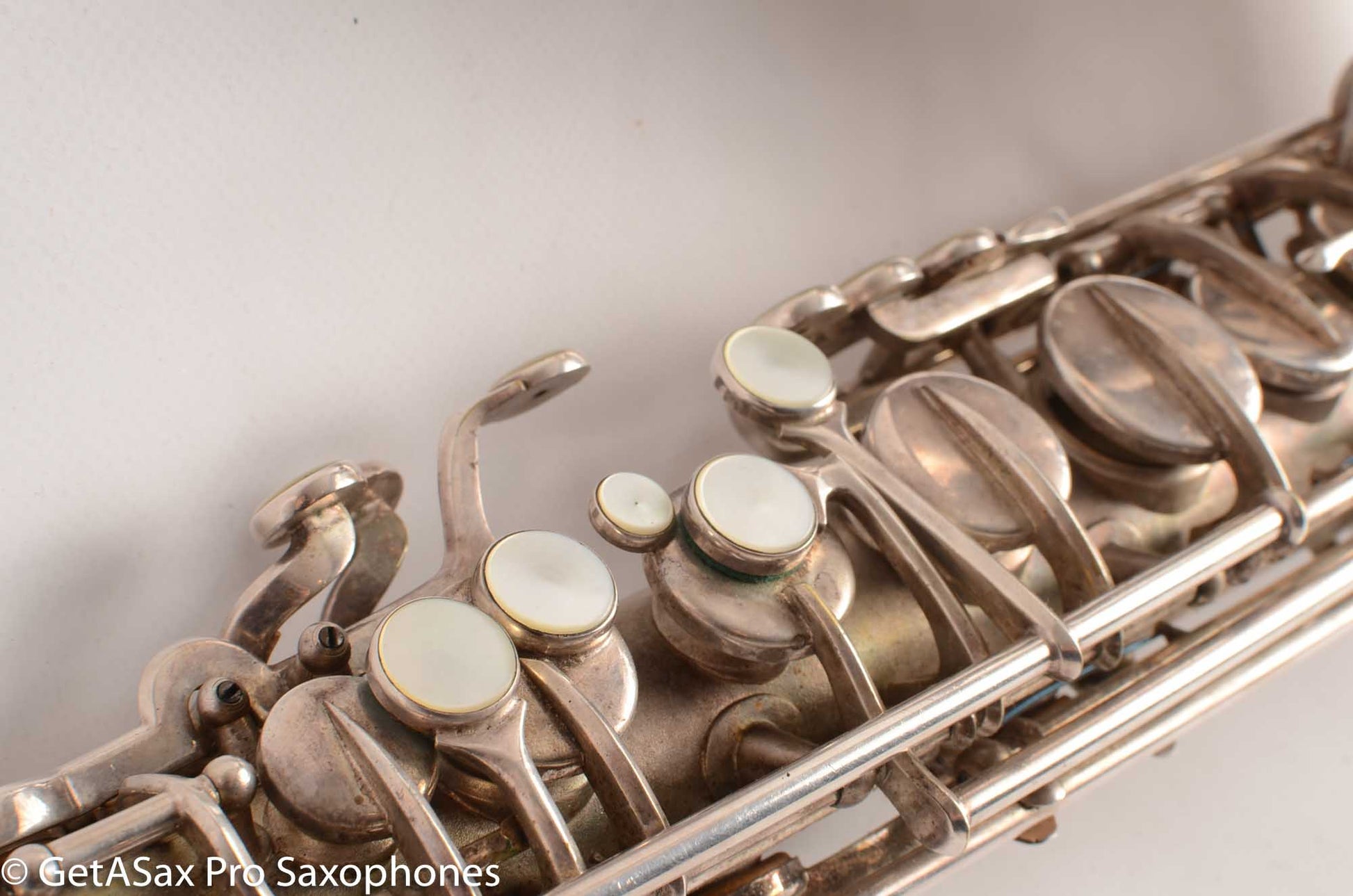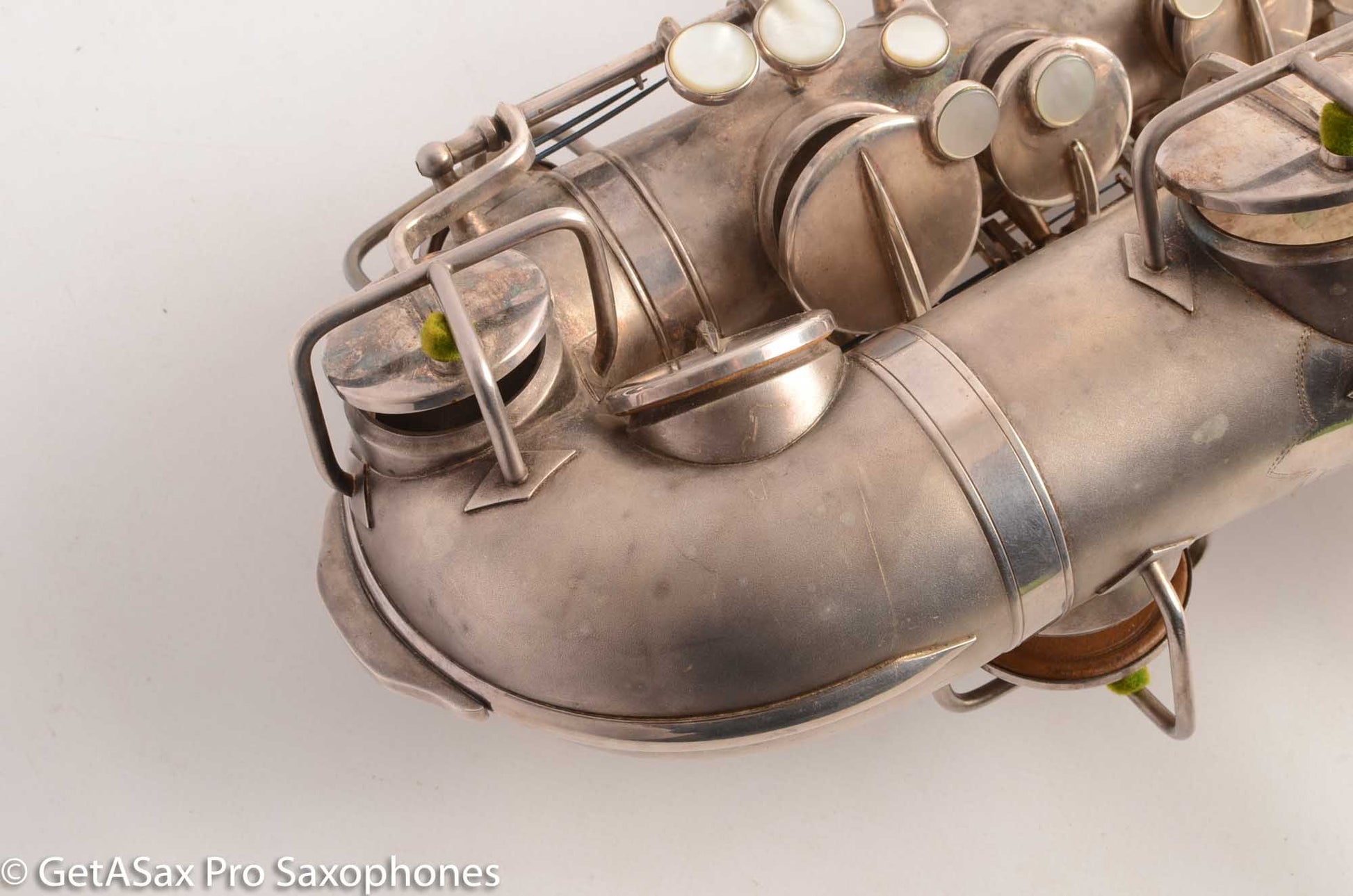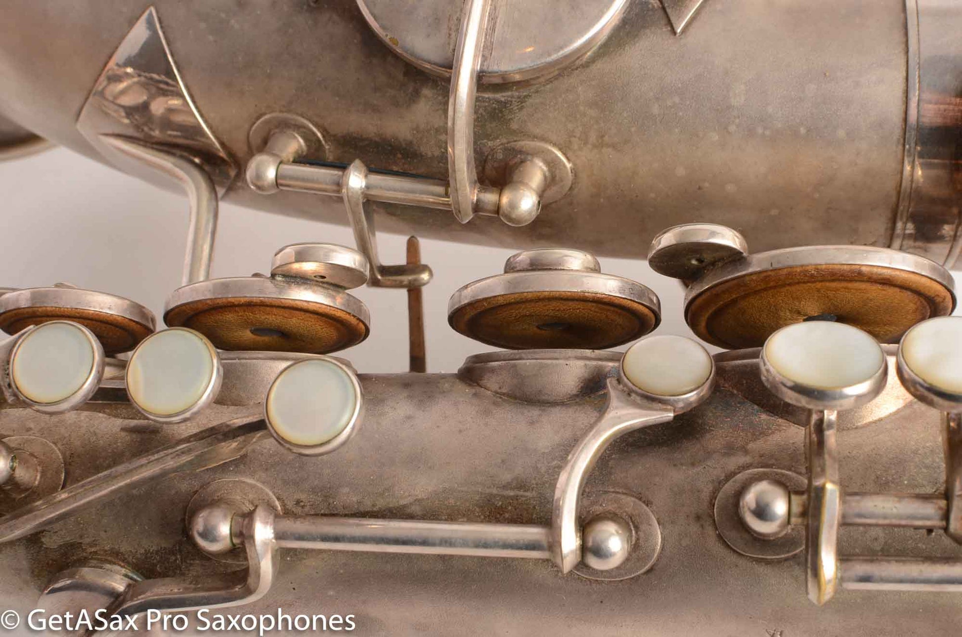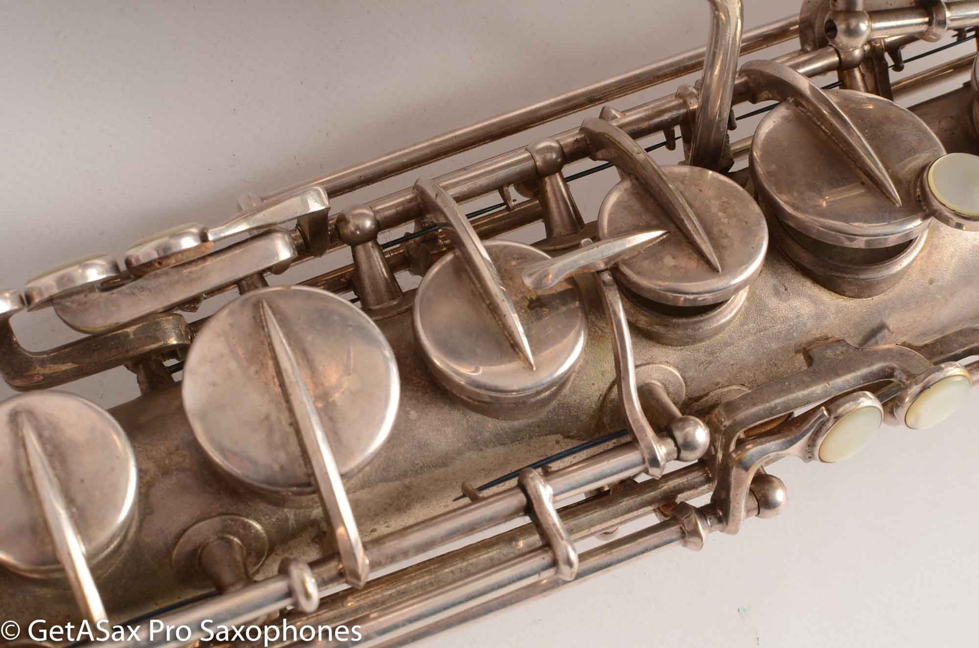 Beautiful original silver Martin Typewriter alto saxophone. Every single key is a has a round pearl button - it's a wonderful instrument to see! I love how unified it is from a design perspective. The palm keys and pinky table are my favorite. A necessity for any serious saxophone collection. This is also a beautiful player when overhauled, and has a wide, warm, sweet tone that is hard to beat for a 20's sound. This Typewriter alto is all original - nearly all the original silver plate is present, as is the gold wash. The neck is also in very good condition. If you wanted to overhaul this, it would be bright, gleaming satin silver and look nearly new. Or just keep it and treasure it, or leave it on display as a showpiece. The typewriter was a beneficiary of the 20's Saxophone Craze - there was such a strong market for saxophones that all kinds of interesting designs blossomed onto the scene. These are rare and hard to find, and this is a great price for one!