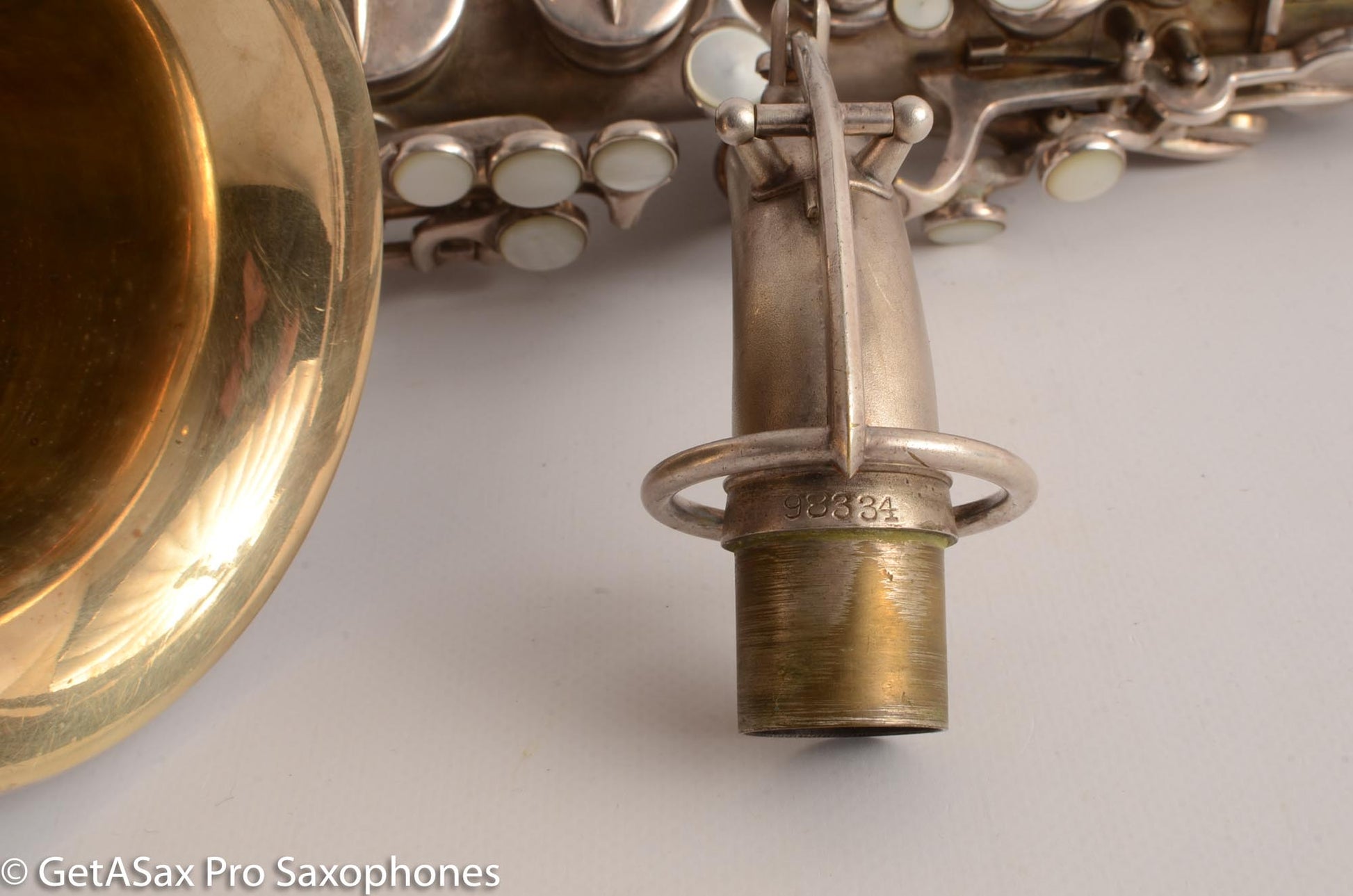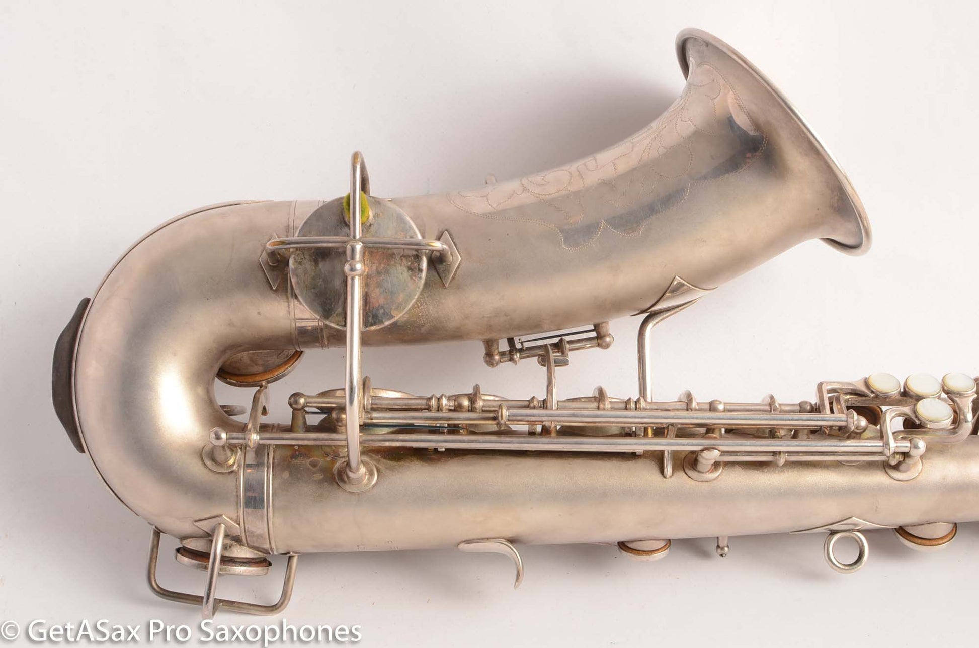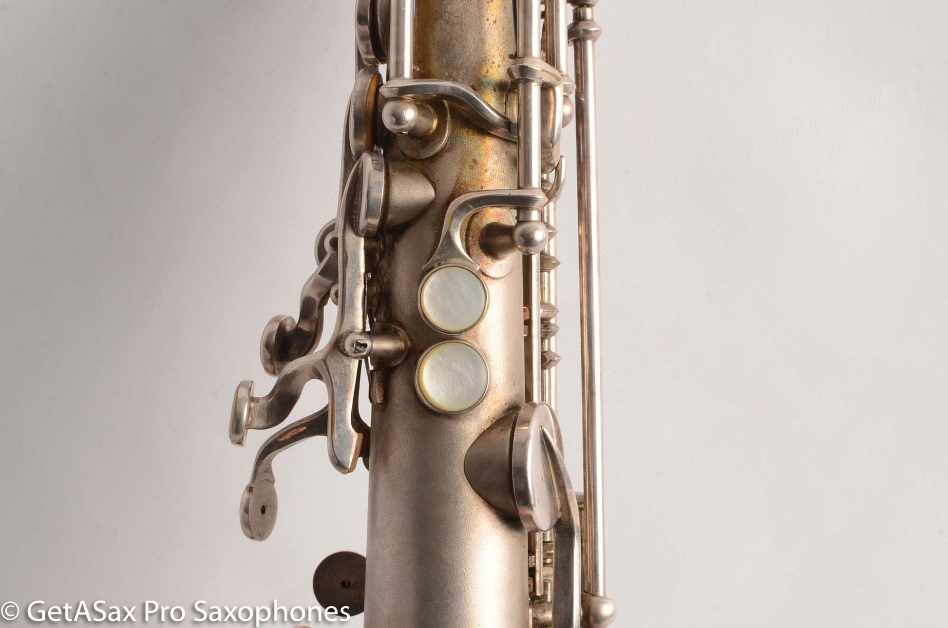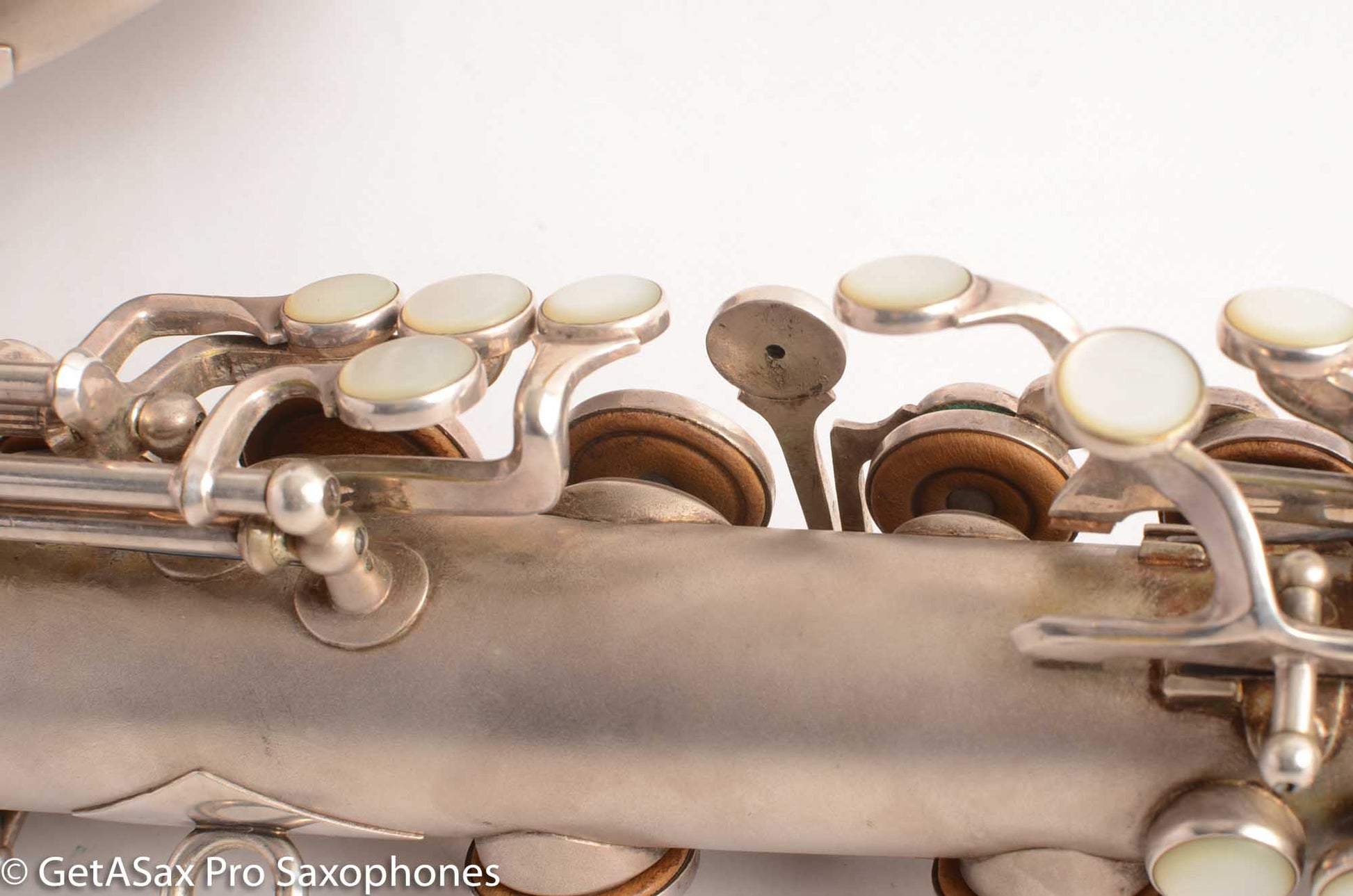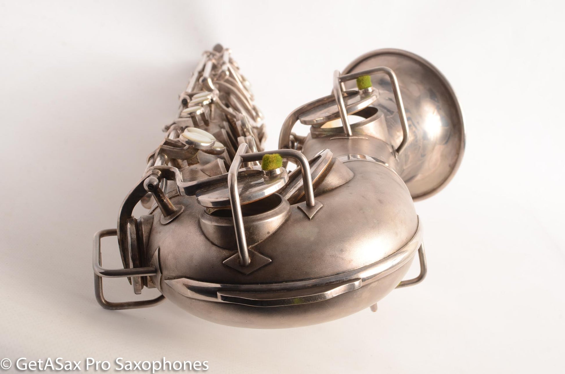 Beautiful original silver Martin Typewriter alto saxophone. Every single key is a has a round pearl button - it's a wonderful instrument to see! I love how unified it is from a design perspective. The palm keys and pinky table are my favorite. A necessity for any serious saxophone collection. This is also a beautiful player when overhauled, and has a wide, warm, sweet tone that is hard to beat for a 20's sound. This Typewriter alto is all original - nearly all the original silver plate is present, as is the gold wash. The neck is also in very good condition. If you wanted to overhaul this, it would be bright, gleaming satin silver and look nearly new. Or just keep it and treasure it, or leave it on display as a showpiece. The typewriter was a beneficiary of the 20's Saxophone Craze - there was such a strong market for saxophones that all kinds of interesting designs blossomed onto the scene. These are rare and hard to find, and this is a great price for one!