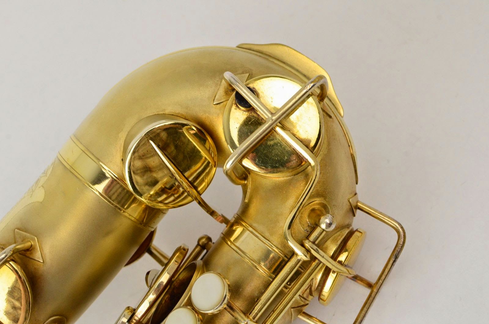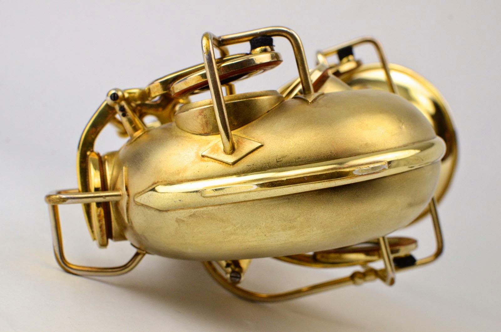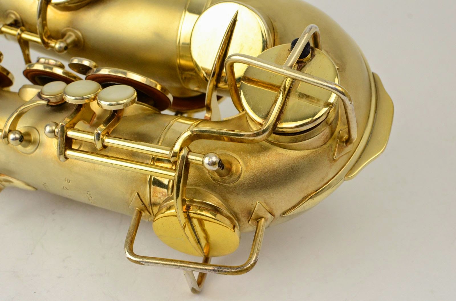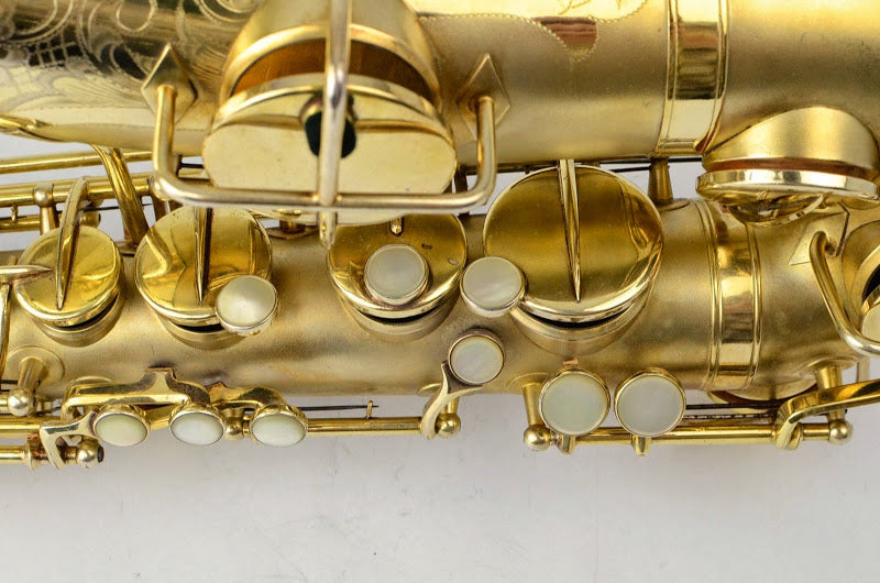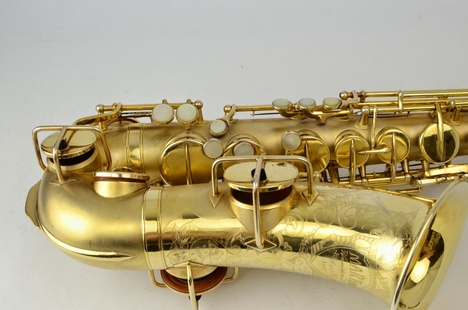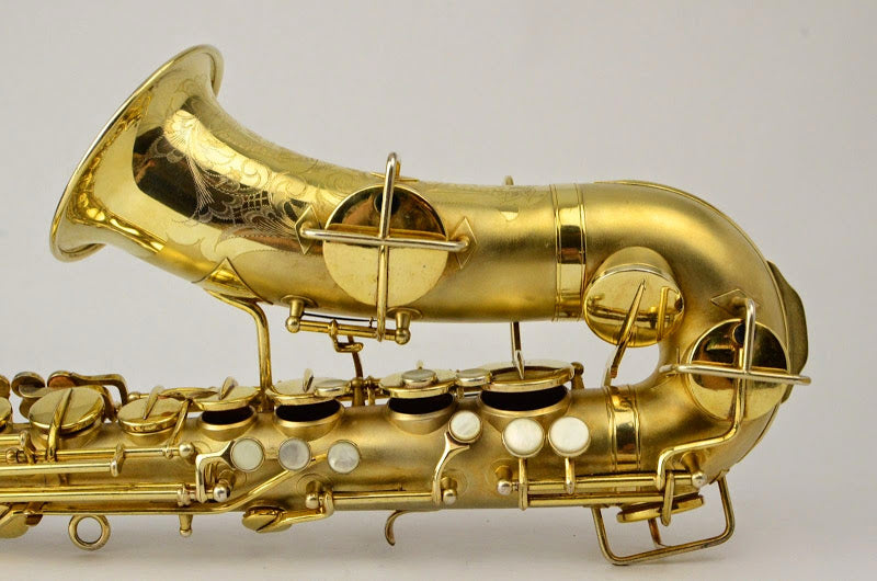 Besides being rare and fabulous, this horn also has a fresh high-end overhaul and it plays amazingly well, with a sweet, lush, thick, lyrical tone that is unique to Martin saxophones. This would be the perfect alto for any kind of lyrical alto playing - big band, ballads, section playing, or even wind band. The typewriter style keywork makes it slower to get around, so this is not a main alto for a pro player who practices 4 hours a day, because then the ergonomic quirks would become troublesome, but for most kinds of players, it's just a lot of fun.