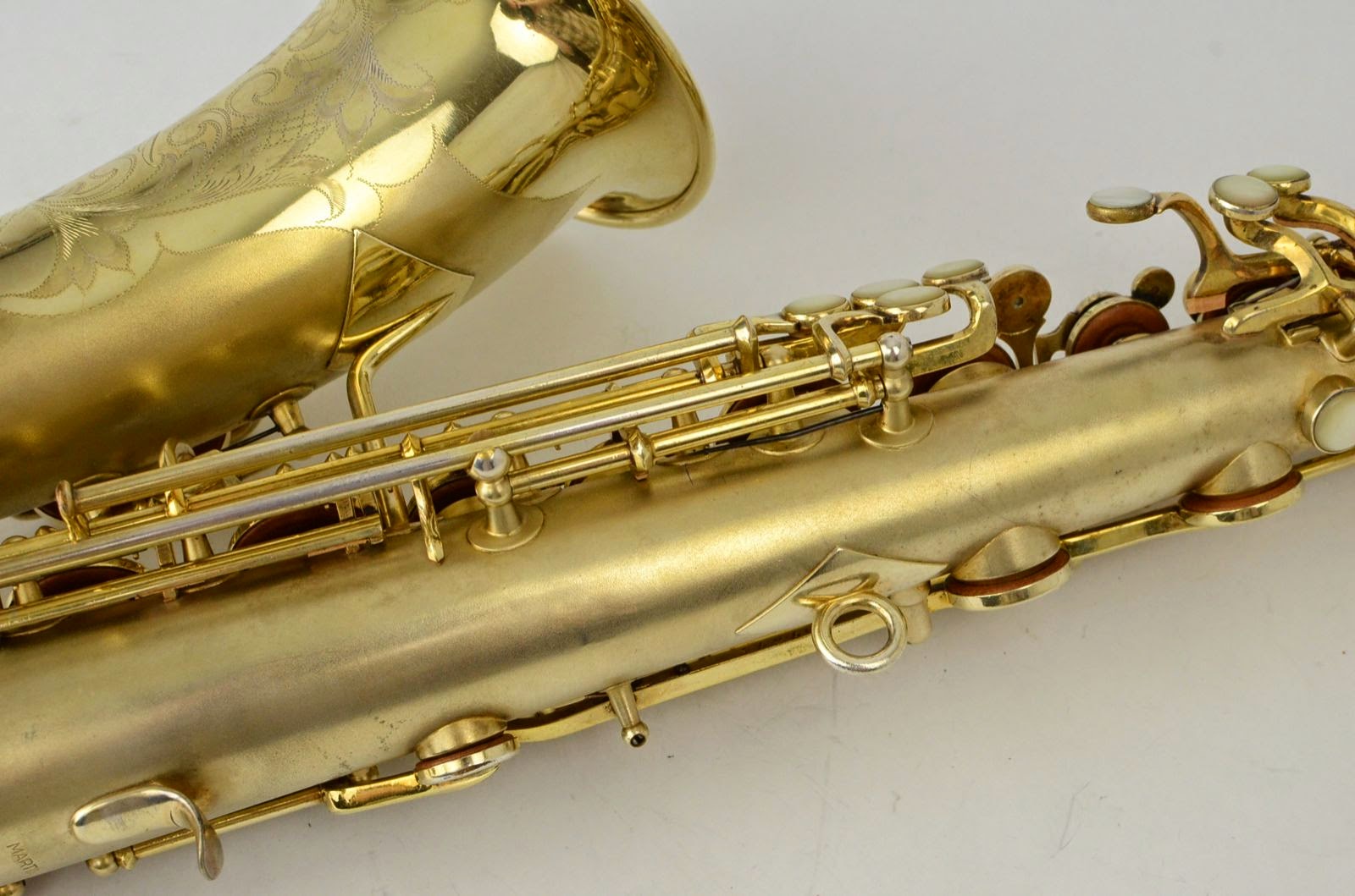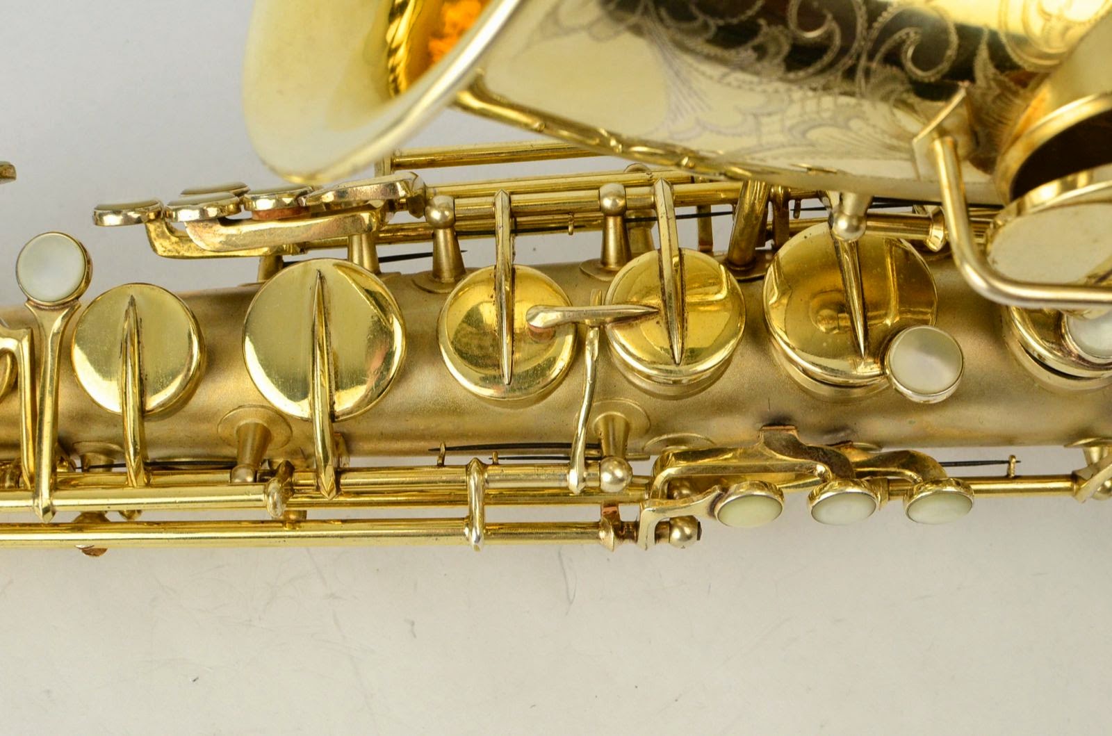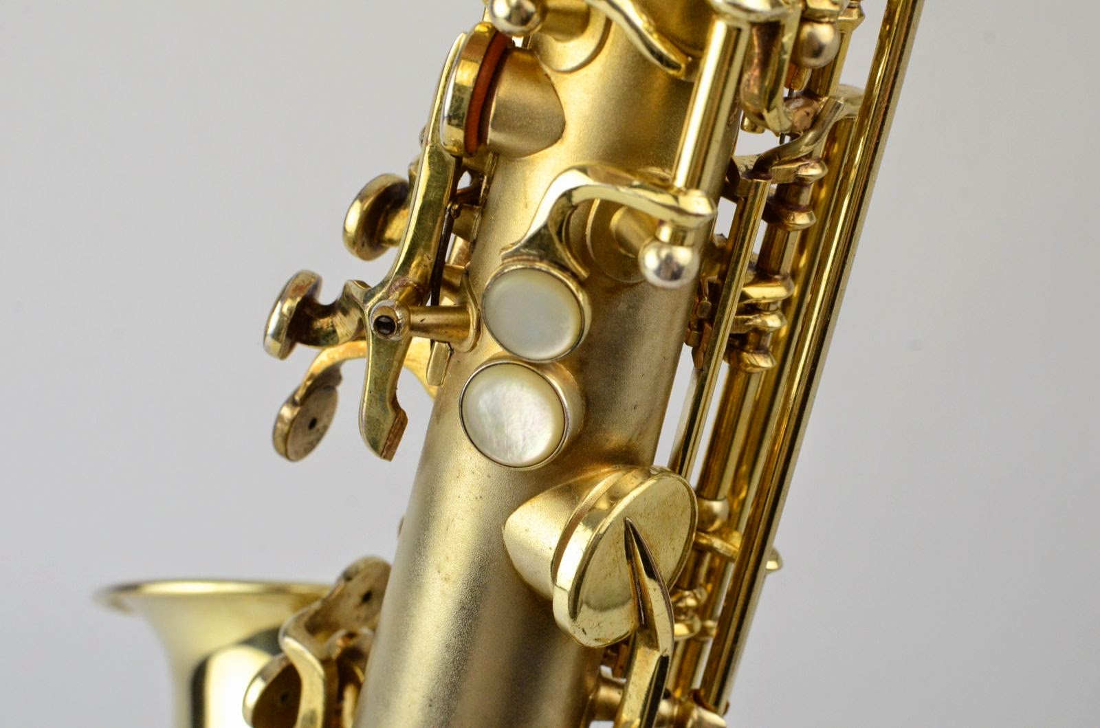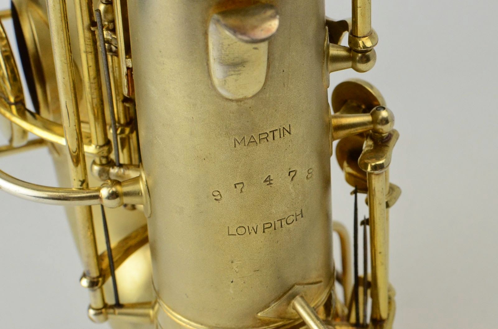 Besides being rare and fabulous, this horn also has a fresh high-end overhaul and it plays amazingly well, with a sweet, lush, thick, lyrical tone that is unique to Martin saxophones. This would be the perfect alto for any kind of lyrical alto playing - big band, ballads, section playing, or even wind band. The typewriter style keywork makes it slower to get around, so this is not a main alto for a pro player who practices 4 hours a day, because then the ergonomic quirks would become troublesome, but for most kinds of players, it's just a lot of fun.