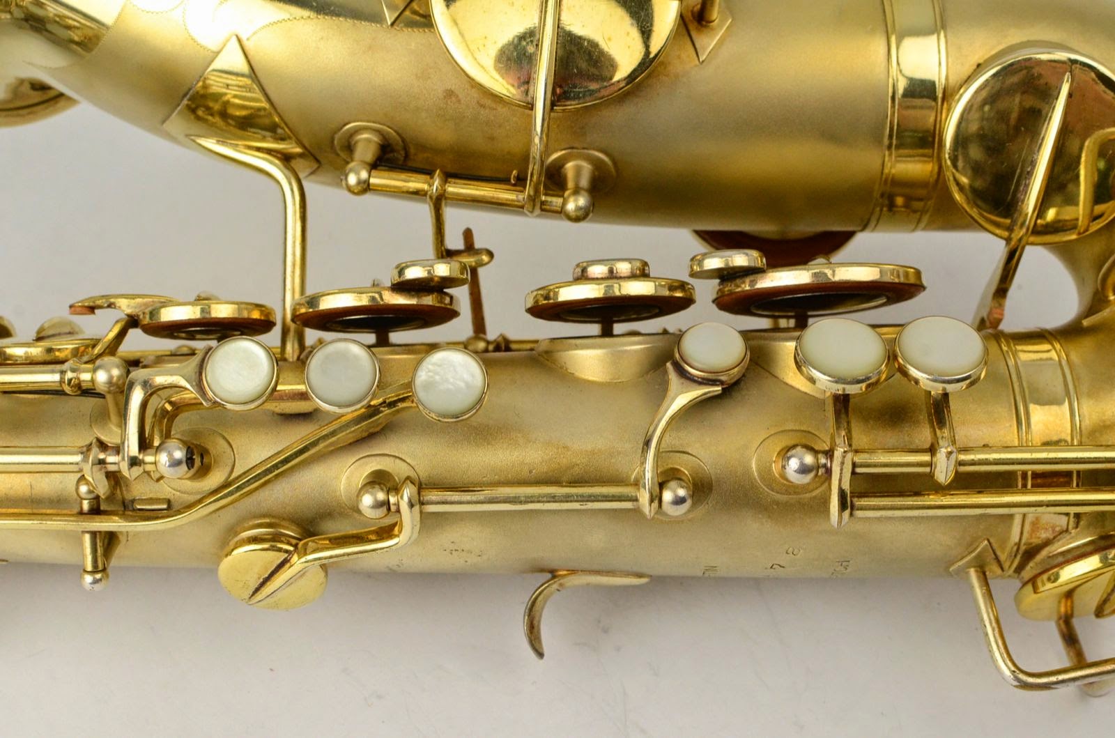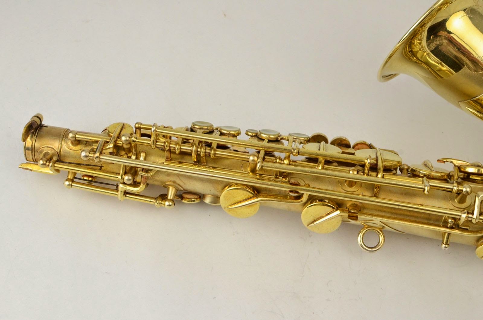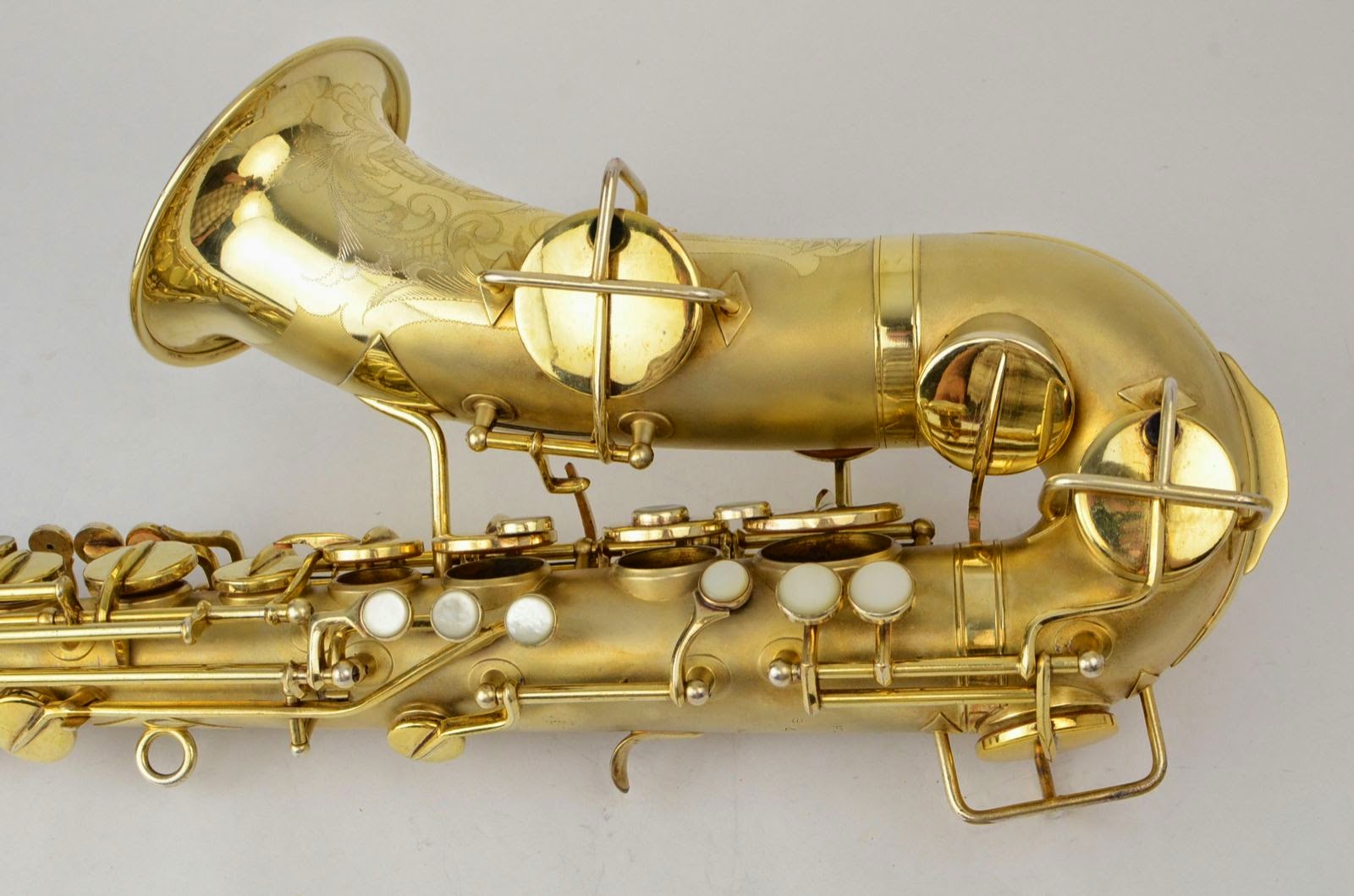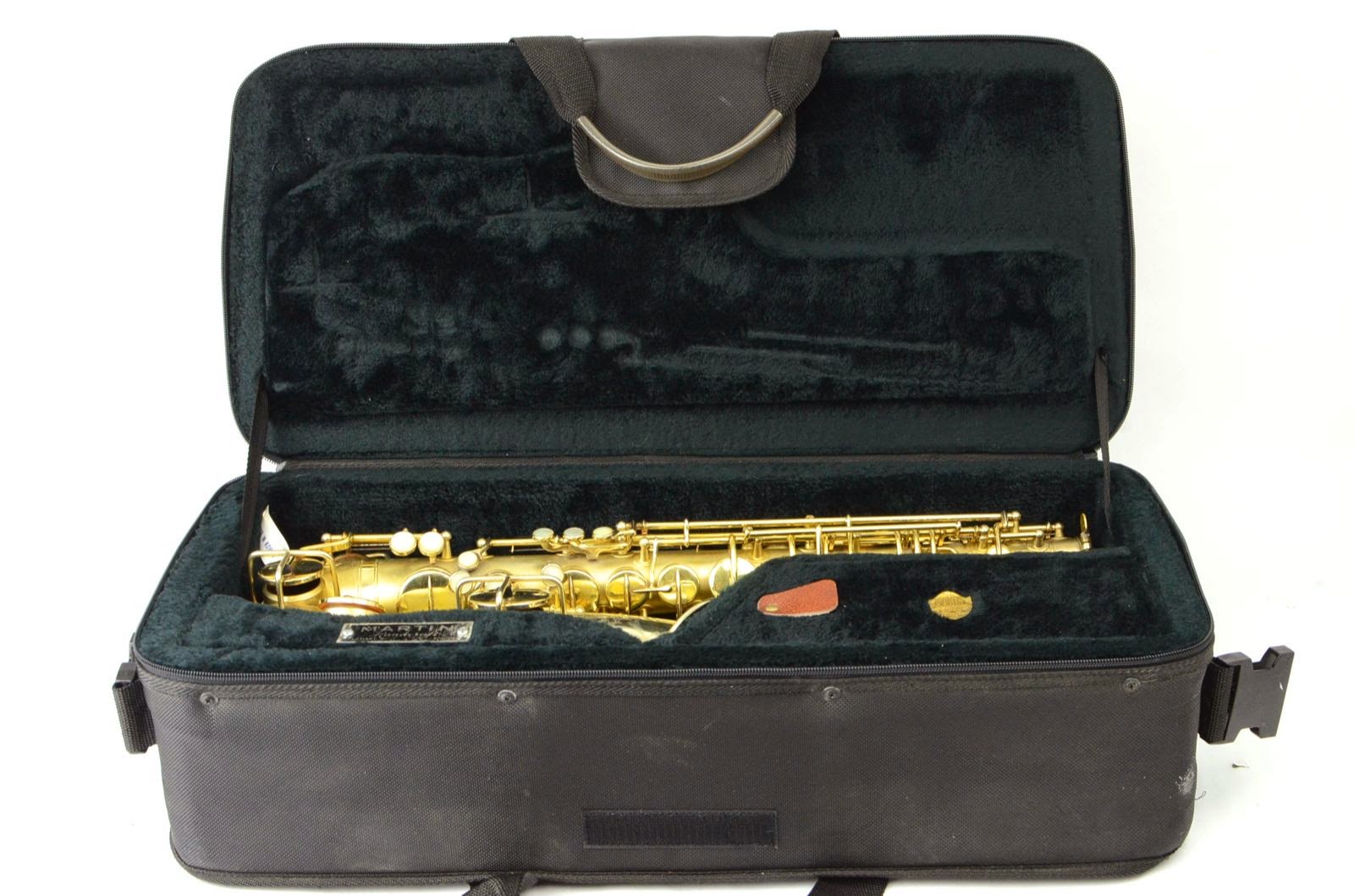 Besides being rare and fabulous, this horn also has a fresh high-end overhaul and it plays amazingly well, with a sweet, lush, thick, lyrical tone that is unique to Martin saxophones. This would be the perfect alto for any kind of lyrical alto playing - big band, ballads, section playing, or even wind band. The typewriter style keywork makes it slower to get around, so this is not a main alto for a pro player who practices 4 hours a day, because then the ergonomic quirks would become troublesome, but for most kinds of players, it's just a lot of fun.